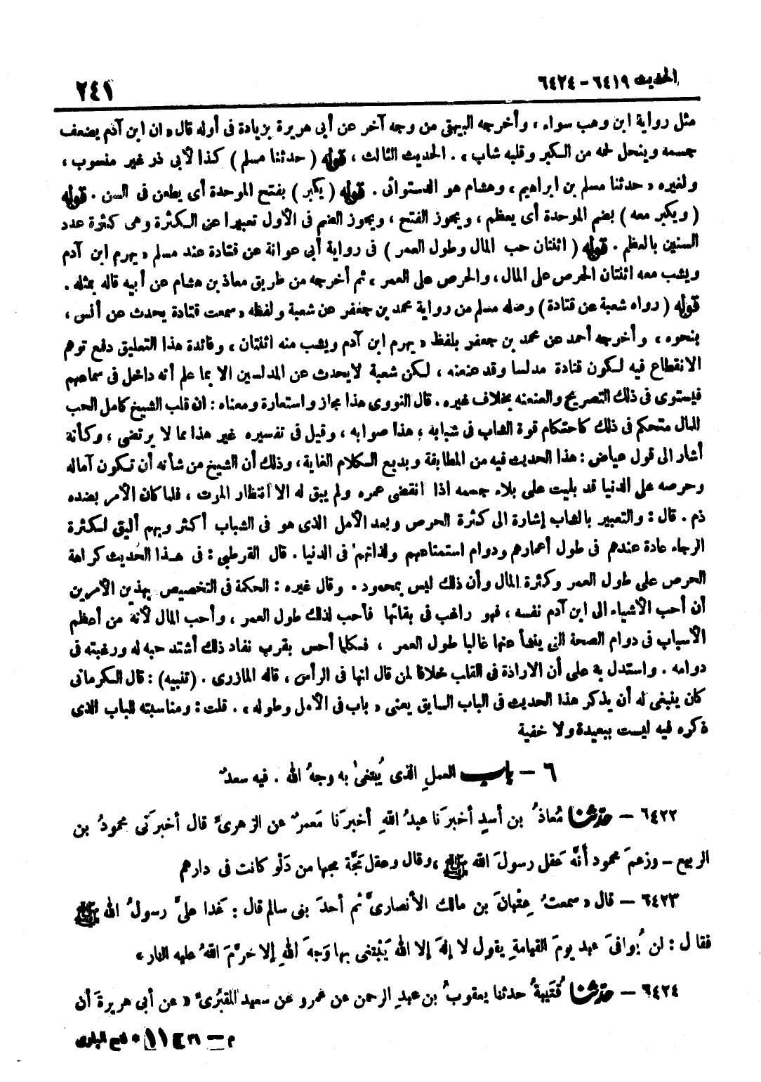 [6421] قَوْلُهُ حَدَّثَنَا مُسْلِمٌ كَذَا لِأَبِي ذَرٍّ غَيْرُ مَنْسُوبٍ وَلِغَيْرِهِ حَدَّثَنَا مُسْلِمُ بْنُ إِبْرَاهِيمَ وَهِشَامٌ هُوَ الدَّسْتُوَائِيُّ قَوْلُهُ يَكْبَرُ بِفَتْحِ الْمُوَحَّدَةِ أَيْ يَطْعَنُ فِي السِّنِّ قَوْلُهُ وَيَكْبُرَ مَعَهُ بِضَمِّ الْمُوَحَّدَةِ أَيْ يَعْظُمُ وَيَجُوزُ الْفَتْحُ وَيَجُوزُ الضَّمُّ فِي الْأَوَّلِ تَعْبِيرًا عَنِ الْكَثْرَةِ وَهِيَ كَثْرَةُ عَدَدِ السِّنِينَ بِالْعِظَمِ قَوْلُهُ اثْنَتَانِ حُبُّ الْمَالِ وَطُولُ الْعُمُرِ فِي رِوَايَةِ أَبِي عَوَانَةَ عَنْ قَتَادَة عِنْد مُسلم يهرم بن آدَمَ وَيَشِبُّ مَعَهُ اثْنَتَانِ الْحِرْصُ عَلَى الْمَالِ وَالْحِرْصُ عَلَى الْعُمُرِ ثُمَّ أَخْرَجَهُ مِنْ طَرِيقِ مُعَاذِ بْنِ هِشَامٍ عَنْ أَبِيهِ قَالَهُ بِمِثْلِهِ قَوْلُهُ رَوَاهُ شُعْبَةُ عَنْ قَتَادَةَ وَصَلَهُ مُسْلِمٌ مِنْ رِوَايَةِ مُحَمَّدِ بْنِ جَعْفَرٍ عَنْ شُعْبَةَ وَلَفْظُهُ سَمِعْتُ قَتَادَةَ يُحَدِّثُ عَنْ أَنَسٍ بِنِحْوِهِ وَأَخْرَجَهُ أَحْمَدُ عَنْ مُحَمَّدِ بْنِ جَعْفَرٍ بِلَفْظِ يهرم بن آدَمَ وَيَشِبُّ مِنْهُ اثْنَتَانِ وَفَائِدَةُ هَذَا التَّعْلِيقِ دَفْعُ تَوَهُّمِ الِانْقِطَاعِ فِيهِ لِكَوْنِ قَتَادَةَ مُدَلِّسًا وَقَدْ عَنْعَنَهُ لَكِنَّ شُعْبَةَ لَا يُحَدِّثُ عَنِ الْمُدَلِّسِينَ إِلَّا بِمَا عَلِمَ أَنَّهُ دَاخِلٌ فِي سَمَاعِهِمْ فَيَسْتَوِي فِي ذَلِكَ التَّصْرِيحُ وَالْعَنْعَنَةُ بِخِلَافِ غَيْرِهِ قَالَ النَّوَوِيُّ هَذَا مَجَازٌ وَاسْتِعَارَةٌ وَمَعْنَاهُ أَنَّ قَلْبَ الشَّيْخِ كَامِلُ الْحُبِّ لِلْمَالِ مُتَحَكِّمٌ فِي ذَلِكَ كَاحْتِكَامِ قُوَّةِ الشَّابِّ فِي شَبَابِهِ هَذَا صَوَابُهُ وَقِيلَ فِي تَفْسِيرِهِ غَيْرُ هَذَا مِمَّا لَا يُرْتَضَى وَكَأَنَّهُ أَشَارَ إِلَى قَوْلِ عِيَاضٍ هَذَا الْحَدِيثُ فِيهِ مِنَ الْمُطَابَقَةِ وَبَدِيعِ الْكَلَامِ الْغَايَةُ وَذَلِكَ أَنَّ الشَّيْخَ مِنْ شَأْنِهِ أَنْ تَكُونَ آمَالُهُ وَحِرْصُهُ عَلَى الدُّنْيَا قَدْ بَلِيَتْ عَلَى بَلَاءِ جِسْمِهِ إِذَا انْقَضَى عُمُرُهُ وَلَمْ يَبْقَ لَهُ إِلَّا انْتِظَارُ الْمَوْتِ فَلَمَّا كَانَ الْأَمْرُ بِضِدِّهِ ذُمَّ قَالَ وَالتَّعْبِيرُ بِالشَّابِّ إِشَارَةٌ إِلَى كَثْرَةِ الْحِرْصِ وَبُعْدِ الْأَمَلِ الَّذِي هُوَ فِي الشَّبَابِ أَكْثَرُ وَبِهِمْ أَلْيَقُ لِكَثْرَةِ الرَّجَاءِ عَادَةً عِنْدَهُمْ فِي طُولِ أَعْمَارِهِمْ وَدَوَامِ اسْتِمْتَاعِهِمْ وَلَذَّاتِهِمْ فِي الدُّنْيَا قَالَ الْقُرْطُبِيُّ فِي هَذَا الْحَدِيثِ كَرَاهَةُ الْحِرْصِ عَلَى طُولِ الْعُمُرِ وَكَثْرَةِ الْمَالِ وَأَنَّ ذَلِكَ لَيْسَ بِمَحْمُودٍ وَقَالَ غَيْرُهُ الْحِكْمَةُ فِي التَّخْصِيصِ بِهَذَيْنِ الْأَمْرَيْنِ أَنَّ احب الْأَشْيَاء إِلَى بن آدَمَ نَفْسُهُ فَهُوَ رَاغِبٌ فِي بَقَائِهَا فَأَحَبَّ لِذَلِكَ طُولَ الْعُمُرِ وَأَحَبَّ الْمَالَ لِأَنَّهُ مِنْ أَعْظَمِ الْأَسْبَابِ فِي دَوَامِ الصِّحَّةِ الَّتِي يَنْشَأُ عَنْهَا غَالِبًا طُولُ الْعُمُرِ فَكُلَّمَا أَحَسَّ بِقُرْبِ نَفَادِ ذَلِكَ اشْتَدَّ حُبُّهُ لَهُ وَرَغْبَتُهُ فِي دَوَامِهِ وَاسْتُدِلَّ بِهِ عَلَى أَنَّ الْإِرَادَةَ فِي الْقَلْبِ خِلَافًا لِمَنْ قَالَ إِنَّهَا فِي الرَّأْسِ قَالَهُ الْمَازِرِيُّ تَنْبِيه قَالَ الْكَرْمَانِيُّ كَانَ يَنْبَغِي لَهُ أَنْ يَذْكُرَ هَذَا الْحَدِيثَ فِي الْبَابِ السَّابِقِ يَعْنِي بَابٌ فِي الْأَمَلِ وَطُولِهِ قُلْتُ وَمُنَاسَبَتُهُ لِلْبَابِ الَّذِي ذَكَرَهُ فِيهِ لَيْسَتْ بِبَعِيدَةٍ وَلَا خُفْيَة