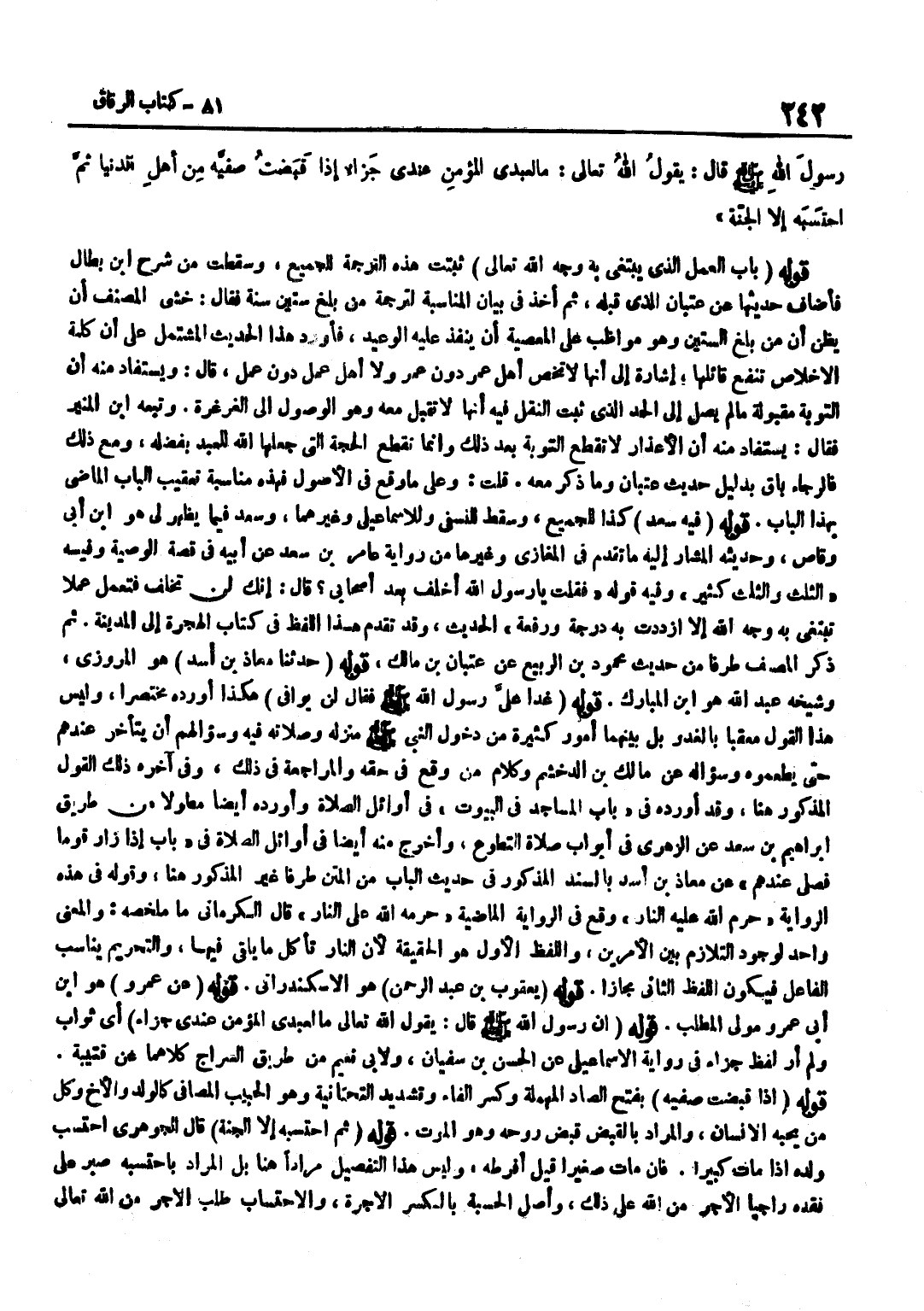 [6424] قَوْلُهُ يَعْقُوبُ بْنُ عَبْدِ الرَّحْمَنِ هُوَ الإسْكَنْدراني قَوْله عَن عَمْرو هُوَ بن أَبِي عَمْرٍو مَوْلَى الْمُطَّلِبِ قَوْلُهُ أَنَّ رَسُولَ اللَّهِ صَلَّى اللَّهُ عَلَيْهِ وَسَلَّمَ قَالَ يَقُولُ اللَّهُ تَعَالَى مَا لِعَبْدِي الْمُؤْمِنِ عِنْدِي جَزَاءٌ أَيْ ثَوَابٌ وَلَمْ أَرَ لَفْظَ جَزَاءٍ فِي رِوَايَةِ الْإِسْمَاعِيلِيُّ عَنِ الْحَسَنِ بْنِ سُفْيَانَ وَلِأَبِي نُعَيْمٍ مِنْ طَرِيقِ السَّرَّاجِ كِلَاهُمَا عَنْ قُتَيْبَةَ قَوْلُهُ إِذَا قَبَضْتُ صَفِيَّهُ بِفَتْحِ الصَّادِّ الْمُهْمَلَةِ وَكَسْرِ الْفَاءِ وَتَشْدِيدِ التَّحْتَانِيَّةِ وَهُوَ الْحَبِيبُ الْمُصَافِي كَالْوَلَدِ وَالْأَخِ وَكُلِّ مَنْ يُحِبُّهُ الْإِنْسَانُ وَالْمُرَادُ بِالْقَبْضِ قَبْضُ رُوحِهِ وَهُوَ الْمَوْتُ قَوْلُهُ ثُمَّ احْتَسَبَهُ إِلَّا الْجَنَّةُ قَالَ الْجَوْهَرِيُّ احْتَسَبَ وَلَدَهُ إِذَا مَاتَ كَبِيرًا فَإِنْ مَاتَ صَغِيرًا قِيلَ أَفْرَطَهُ وَلَيْسَ هَذَا التَّفْصِيلُ مُرَادًا هُنَا بَلِ المُرَاد باحتسبه صَبَرَ عَلَى فَقْدِهِ رَاجِيًا الْأَجْرَ مِنَ اللَّهِ عَلَى ذَلِكَ وَأَصْلُ الْحِسْبَةِ بِالْكَسْرِ الْأُجْرَةُ وَالِاحْتِسَابُ طَلَبُ الْأَجْرِ مِنَ اللَّهِ تَعَالَى