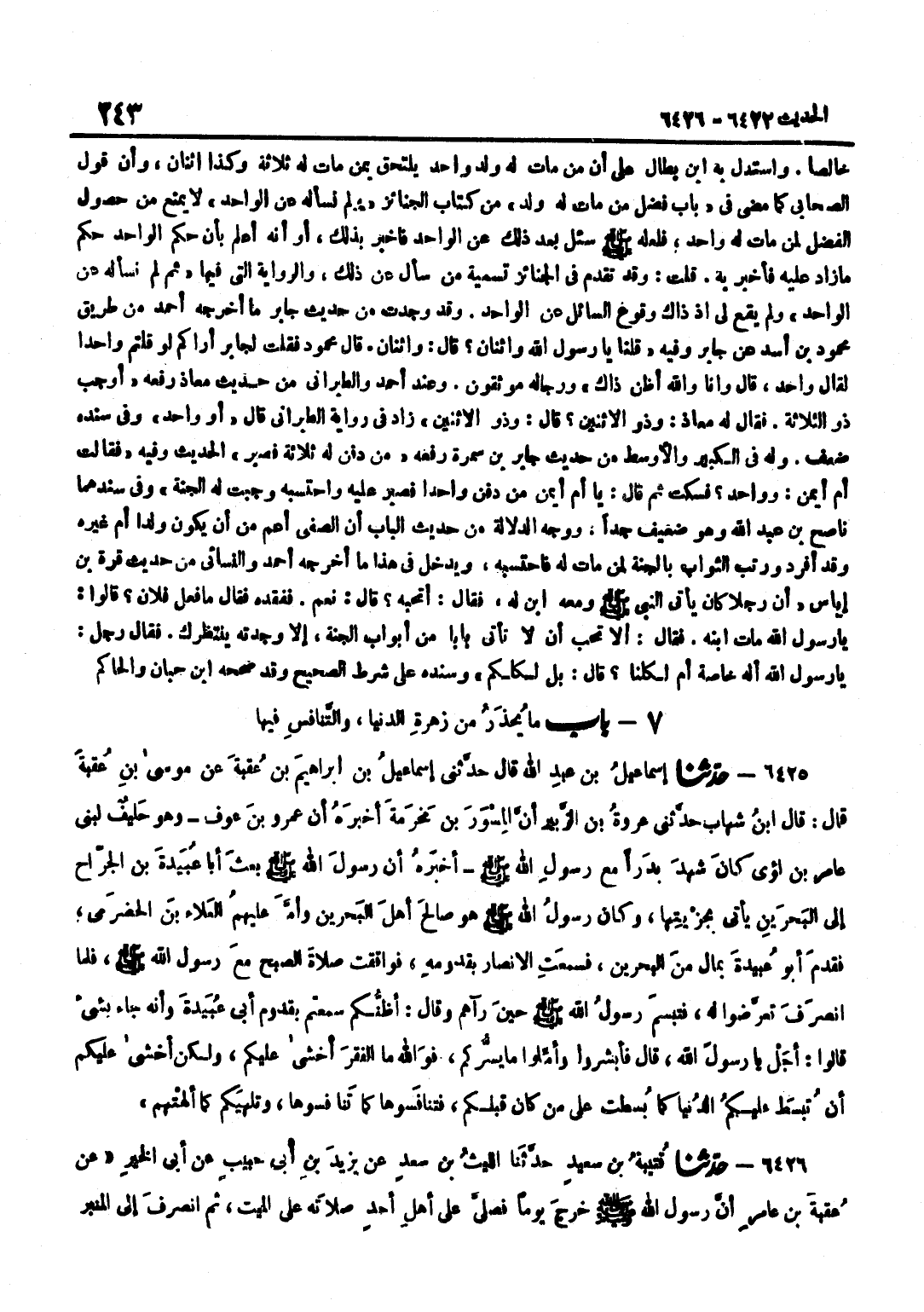 خَالِصا وَاسْتدلَّ بِهِ بن بَطَّالٍ عَلَى أَنَّ مَنْ مَاتَ لَهُ وَلَدٌ وَاحِدٌ يَلْتَحِقُ بِمَنْ مَاتَ لَهُ ثَلَاثَةٌ وَكَذَا اثْنَانِ وَأَنَّ قَوْلَ الصَّحَابِيِّ كَمَا مَضَى فِي بَابِ فَضْلِ مَنْ مَاتَ لَهُ وَلَدٌ مِنْ كِتَابِ الْجَنَائِزِ وَلَمْ نَسْأَلْهُ عَنِ الْوَاحِدِ لَا يَمْنَعُ مِنْ حُصُولِ الْفَضْلِ لِمَنْ مَاتَ لَهُ وَاحِدٌ فَلَعَلَّهُ صَلَّى اللَّهُ عَلَيْهِ وَسَلَّمَ سُئِلَ بَعْدَ ذَلِكَ عَنِ الْوَاحِدِ فَأَخْبَرَ بِذَلِكَ أَوْ أَنَّهُ أَعْلَمَ بِأَنَّ حُكْمَ الْوَاحِدِ حُكْمُ مَا زَادَ عَلَيْهِ فَأَخْبَرَ بِهِ قُلْتُ وَقَدْ تَقَدَّمَ فِي الْجَنَائِزِ تَسْمِيَةُ مَنْ سَأَلَ عَنْ ذَلِكَ وَالرِّوَايَةُ الَّتِي فِيهَا ثُمَّ لَمْ نَسْأَلْهُ عَنِ الْوَاحِدِ وَلَمْ يَقَعْ لِي إِذْ ذَاكَ وُقُوعُ السَّائِلِ عَنِ الْوَاحِدِ وَقَدْ وَجَدْتُ مِنْ حَدِيثِ جَابِرٍ مَا أَخْرَجَهُ أَحْمَدُ مِنْ طَرِيقِ مَحْمُودِ بْنِ أَسَدٍ عَنْ جَابِرٍ وَفِيهِ قُلْنَا يَا رَسُولَ اللَّهِ وَاثْنَانِ قَالَ وَاثْنَانِ قَالَ مَحْمُودٌ فَقُلْتُ لِجَابِرٍ أَرَاكُمْ لَوْ قُلْتُمْ وَاحِدًا لَقَالَ وَاحِدٌ قَالَ وَأَنَا وَاللَّهِ أَظُنُّ ذَاكَ وَرِجَالُهُ مُوَثَّقُونَ وَعِنْدَ أَحْمَدَ وَالطَّبَرَانِيِّ مِنْ حَدِيثِ مُعَاذٍ رَفَعَهُ أَوْجَبَ ذُو الثَّلَاثَةِ فَقَالَ لَهُ مُعَاذٌ وَذُو الِاثْنَيْنِ قَالَ وَذُو الِاثْنَيْنِ زَادَ فِي رِوَايَةِ الطَّبَرَانِيِّ قَالَ أَوْ وَاحِدٌ وَفِي سَنَدِهِ ضَعْفٌ وَلَهُ فِي الْكَبِيرِ وَالْأَوْسَطِ مِنْ حَدِيثِ جَابِرِ بْنِ سَمُرَةَ رَفَعَهُ مَنْ دُفِنَ لَهُ ثَلَاثَةٌ فَصَبَرَ الْحَدِيثَ وَفِيهِ فَقَالَتْ أُمُّ أَيْمَنَ وَوَاحِدٌ فَسَكَتَ ثُمَّ قَالَ يَا أُمَّ أَيْمَنَ مَنْ دَفَنَ وَاحِدًا فَصَبَرَ عَلَيْهِ وَاحْتَسَبَهُ وَجَبَتْ لَهُ الْجَنَّةُ وَفِي سَنَدِهِمَا نَاصِحُ بْنُ عَبْدِ اللَّهِ وَهُوَ ضَعِيفٌ جِدًّا وَوَجْهُ الدَّلَالَةِ مِنْ حَدِيثِ الْبَابِ أَنَّ الصَّفِيِّ أَعَمُّ مِنْ أَنْ يَكُونَ وَلَدًا أَمْ غَيْرَهُ وَقَدْ أَفْرَدَ وَرَتَّبَ الثَّوَابَ بِالْجَنَّةِ لِمَنْ مَاتَ لَهُ فَاحْتَسَبَهُ وَيُدْخِلُ فِي هَذَا مَا أَخْرَجَهُ أَحْمَدُ وَالنَّسَائِيُّ مِنْ حَدِيثِ قُرَّةَ بْنِ إِيَاسٍ أَنَّ رَجُلًا كَانَ يَأْتِي النَّبِيَّ صَلَّى اللَّهُ عَلَيْهِ وَسَلَّمَ وَمَعَهُ بن لَهُ فَقَالَ أَتُحِبُّهُ قَالَ نَعَمْ فَفَقَدَهُ فَقَالَ مَا فَعَلَ فُلَانٌ قَالُوا يَا رَسُولَ اللَّهِ مَاتَ ابْنُهُ فَقَالَ أَلَا تُحِبُّ أَنْ لَا تَأْتِيَ بَابًا مِنْ أَبْوَابِ الْجَنَّةِ إِلَّا وَجَدْتَهُ يَنْتَظِرُكَ فَقَالَ رَجُلٌ يَا رَسُولَ اللَّهِ أَلَهُ خَاصَّةً أَمْ لِكُلِّنَا قَالَ بَلْ لِكُلِّكُمْ وَسَنَدُهُ على شَرط الصَّحِيح وَقد صَححهُ بن حبَان وَالْحَاكِم