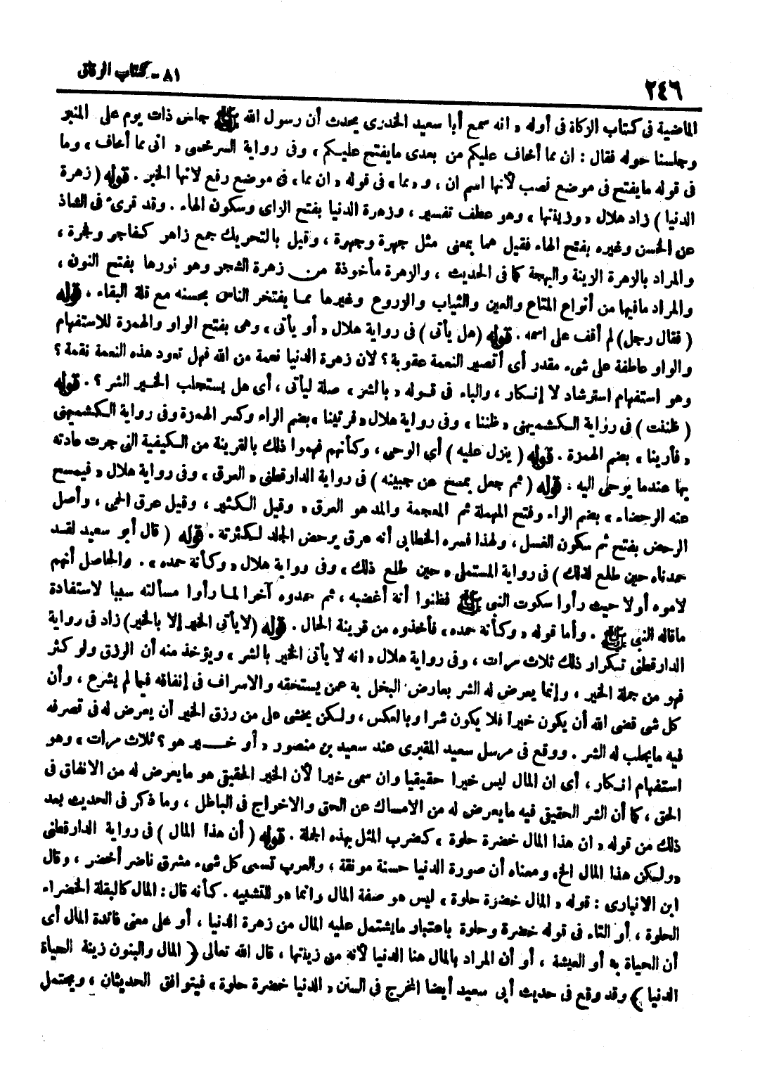 [6427] قَوْلِهِ مَا يُفْتَحُ فِي مَوْضِعِ نَصْبٍ لِأَنَّهَا اسْم ان وَمِمَّا فِي قَوْلِهِ إِنَّ مِمَّا فِي مَوْضِعِ رَفْعٍ لِأَنَّهَا الْخَبَرُ قَوْلُهُ زَهْرَةُ الدُّنْيَا زَادَ هِلَالٌ وَزِينَتُهَا وَهُوَ عَطْفُ تَفْسِيرٍ وَزَهْرَةُ الدُّنْيَا بِفَتْحِ الزَّاي وَسُكُونِ الْهَاءِ وَقَدْ قُرِئَ فِي الشَّاذِّ عَنِ الْحَسَنِ وَغَيْرِهِ بِفَتْحِ الْهَاءِ فَقِيلَ هُمَا بِمَعْنًى مِثْلُ جَهْرَةٍ وَجَهَرَةٍ وَقِيلَ بِالتَّحْرِيكِ جَمْعُ زَاهِرٍ كَفَاجِرِ وَفَجَرَةٍ وَالْمُرَادُ بِالزَّهْرَةِ الزِّينَةُ وَالْبَهْجَةُ كَمَا فِي الْحَدِيثِ وَالزَّهْرَةُ مَأْخُوذَةٌ مِنْ زَهْرَةِ الشَّجَرِ وَهُوَ نَوْرُهَا بِفَتْحِ النُّونِ وَالْمُرَادُ مَا فِيهَا مِنْ أَنْوَاعِ الْمَتَاعِ وَالْعَيْنِ وَالثِّيَابِ وَالزُّرُوعِ وَغَيْرِهَا مِمَّا يَفْتَخِرُ النَّاسُ بِحُسْنِهِ مَعَ قِلَّةِ الْبَقَاءِ قَوْلُهُ فَقَالَ رَجُلٌ لَمْ أَقِفْ عَلَى اسْمِهِ قَوْلُهُ هَلْ يَأْتِي فِي رِوَايَةِ هِلَالٍ أَوَ يَأْتِي وَهِيَ بِفَتْحِ الْوَاوِ وَالْهَمْزَةُ لِلِاسْتِفْهَامِ وَالْوَاوُ عَاطِفَةٌ عَلَى شَيْءٍ مُقَدَّرٍ أَيْ أَتَصِيرُ النِّعْمَةُ عُقُوبَةً لِأَنَّ زَهْرَةَ الدُّنْيَا نِعْمَةٌ مِنَ اللَّهِ فَهَلْ تَعُودُ هَذِهِ النِّعْمَةُ نِقْمَةً وَهُوَ اسْتِفْهَامُ اسْتِرْشَادٍ لَا إِنْكَارٍ وَالْبَاءُ فِي قَوْلِهِ بِالشَّرِّ صلَة ليَأْتِي أَيْ هَلْ يَسْتَجْلِبُ الْخَيْرُ الشَّرَّ قَوْلُهُ ظَنَنْتُ فِي رِوَايَةِ الْكُشْمِيهَنِيِّ ظَنَنَّا وَفِي رِوَايَةِ هِلَالٍ فَرُئِينَا بِضَمِّ الرَّاءِ وَكَسْرِ الْهَمْزَةِ وَفِي رِوَايَةِ الْكُشْمِيهَنِيِّ فَأُرِينَا بِضَمِّ الْهَمْزَةِ قَوْلُهُ يَنْزِلُ عَلَيْهِ أَيِ الْوَحْيُ وَكَأَنَّهُمْ فَهِمُوا ذَلِكَ بِالْقَرِينَةِ مِنَ الْكَيْفِيَّةِ الَّتِي جَرَتْ عَادَتُهُ بِهَا عِنْدَمَا يُوحَى إِلَيْهِ قَوْلُهُ ثُمَّ جَعَلَ يَمْسَحُ عَنْ جَبِينِهِ فِي رِوَايَةِ الدَّارَقُطْنِيِّ الْعَرَقَ وَفِي رِوَايَةِ هِلَالٍ فَيَمْسَحُ عَنْهُ الرُّحَضَاءُ بِضَمِّ الرَّاءِ وَفَتْحِ الْمُهْمَلَةِ ثُمَّ الْمُعْجَمَةِ وَالْمَدِّ هُوَ الْعَرَقُ وَقِيلَ الْكَثِيرُ وَقِيلَ عَرَقُ الْحُمَّى وَأَصْلُ الرَّحْضِ بِفَتْحٍ ثُمَّ سُكُون الْغسْل وَلِهَذَا فَسَّرَهُ الْخَطَّابِيُّ أَنَّهُ عَرَقٌ يَرْحَضُ الْجِلْدَ لِكَثْرَتِهِ قَوْلُهُ قَالَ أَبُو سَعِيدٍ لَقَدْ حَمِدْنَاهُ حِينَ طَلَعَ لِذَلِكَ فِي رِوَايَةِ الْمُسْتَمْلِي حِينَ طَلَعَ ذَلِكَ وَفِي رِوَايَةِ هِلَالٍ وَكَأَنَّهُ حَمِدَهُ وَالْحَاصِلُ أَنَّهُمْ لَامُوهُ أَوَّلًا حَيْثُ رَأَوْا سُكُوتَ النَّبِيِّ صَلَّى اللَّهُ عَلَيْهِ وَسَلَّمَ فَظَنُّوا أَنَّهُ أَغْضَبَهُ ثُمَّ حَمِدُوهُ آخِرًا لَمَّا رَأَوْا مَسْأَلَتَهُ سَبَبًا لِاسْتِفَادَةِ مَا قَالَهُ النَّبِيُّ صَلَّى اللَّهُ عَلَيْهِ وَسَلَّمَ وَأَمَّا قَوْلُهُ وَكَأَنَّهُ حَمِدَهُ فَأَخَذُوهُ مِنْ قَرِينَةِ الْحَالِ قَوْلُهُ لَا يَأْتِي الْخَيْرُ إِلَّا بِالْخَيْرِ زَادَ فِي رِوَايَةِ الدَّارَقُطْنِيِّ تَكْرَارُ ذَلِكَ ثَلَاثَ مَرَّاتٍ وَفِي رِوَايَةِ هِلَالٍ إِنَّهُ لَا يَأْتِي الْخَيْرُ بِالشَّرِّ وَيُؤْخَذُ مِنْهُ أَنَّ الرِّزْقَ وَلَوْ كَثُرَ فَهُوَ مِنْ جُمْلَةِ الْخَيْرِ وانما يَعْرِضُ لَهُ الشَّرُّ بِعَارِضِ الْبُخْلِ بِهِ عَمَّنْ يَسْتَحِقُّهُ وَالْإِسْرَافُ فِي إِنْفَاقِهِ فِيمَا لَمْ يُشْرَعْ وَأَنَّ كُلَّ شَيْءٍ قَضَى اللَّهُ أَنْ يَكُونَ خَيْرًا فَلَا يَكُونُ شَرًّا وَبِالْعَكْسِ وَلَكِنْ يُخْشَى عَلَى مَنْ رُزِقَ الْخَيْرَ أَنْ يَعْرِضَ لَهُ فِي تَصَرُّفِهِ فِيهِ مَا يَجْلُبُ لَهُ الشَّرَّ وَوَقَعَ فِي مُرْسَلِ سَعِيدٍ الْمَقْبُرِيِّ عِنْدَ سَعِ