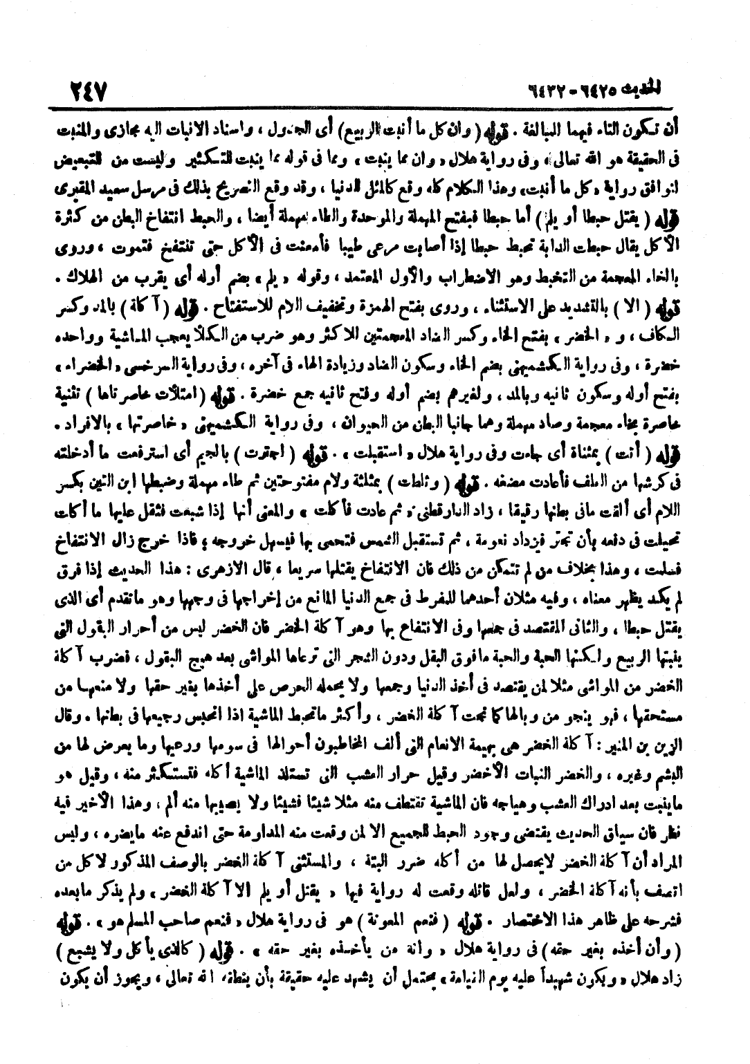 أَنْ تَكُونَ التَّاءُ فِيهِمَا لِلْمُبَالَغَةِ قَوْلُهُ وَإِنَّ كُلَّ مَا أَنْبَتَ الرَّبِيعُ أَيِ الْجَدْوَلُ وَإِسْنَادُ الْإِثْبَاتِ إِلَيْهِ مَجَازِيٌّ وَالْمُنْبِتُ فِي الْحَقِيقَةِ هُوَ اللَّهُ تَعَالَى وَفِي رِوَايَةِ هِلَالٍ وَأَنَّ مِمَّا يُنْبِتُ وَمِمَّا فِي قَوْلِهِ مِمَّا يُنْبِتُ لِلتَّكْثِيرِ وَلَيْسَتْ مِنْ لِلتَّبْعِيضِ لِتُوَافِقَ رِوَايَةَ كُلَّ مَا أَنْبَتَ وَهَذَا الْكَلَامُ كُلُّهُ وَقَعَ كَالْمَثَلِ لِلدُّنْيَا وَقَدْ وَقَعَ التَّصْرِيحُ بِذَلِكَ فِي مُرْسَلِ سَعِيدٍ الْمَقْبُرِيِّ قَوْلُهُ يَقْتُلُ حَبَطًا أَوْ يُلِمُّ أَمَّا حَبَطًا فَبِفَتْحِ الْمُهْمَلَةِ وَالْمُوَحَّدَةِ وَالطَّاءُ مُهْمَلَةٌ أَيْضًا وَالْحَبَطُ انْتِفَاخُ الْبَطْنِ مِنْ كَثْرَةِ الْأَكْلِ يُقَالُ حَبِطَتِ الدَّابَّةُ تَحْبَطُ حَبَطًا إِذَا أَصَابَتْ مَرْعًى طَيِّبًا فَأَمْعَنَتْ فِي الْأَكْلِ حَتَّى تَنْتَفِخَ فَتَمُوتَ وَرُوِيَ بِالْخَاءِ الْمُعْجَمَةِ مِنَ التَّخَبُّطِ وَهُوَ الِاضْطِرَابُ وَالْأَوَّلُ الْمُعْتَمَدُ وَقَوْلُهُ يُلِمُّ بِضَمِّ أَوَّلِهِ أَيْ يُقَرِّبُ مِنَ الْهَلَاكِ قَوْلُهُ إِلَّا بِالتَّشْدِيدِ عَلَى الِاسْتِثْنَاء وروى بِفَتْح الْهمزَة وَتَخْفِيف اللَّامِ لِلِاسْتِفْتَاحِ قَوْلُهُ آكِلَةُ بِالْمَدِّ وَكَسْرِ الْكَافِ وَالْخضر بِفَتْحِ الْخَاءِ وَكَسْرِ الضَّادِ الْمُعْجَمَتَيْنِ لِلْأَكْثَرِ وَهُوَ ضَرْبٌ مِنَ الْكَلَأِ يُعْجِبُ الْمَاشِيَةَ وَوَاحِدُهُ خَضِرَةٌ وَفِي رِوَايَةِ الْكُشْمِيهَنِيِّ بِضَمِّ الْخَاءِ وَسُكُونِ الضَّادِ وَزِيَادَةِ الْهَاءِ فِي آخِرِهِ وَفِي رِوَايَةِ السَّرَخْسِيِّ الْخَضْرَاءِ بِفَتْحِ أَوَّلِهِ وَسُكُونِ ثَانِيهِ وَبِالْمَدِّ وَلِغَيْرِهِمْ بِضَمِّ أَوَّلِهِ وَفَتْحِ ثَانِيهِ جَمْعُ خَضِرَةٍ قَوْلُهُ امْتَلَأَتْ خَاصِرَتَاهَا تَثْنِيَةُ خَاصِرَةٍ بِخَاءٍ مُعْجَمَةٍ وَصَادٍ مُهْمَلَةٍ وَهُمَا جَانِبَا الْبَطْنِ مِنَ الْحَيَوَانِ وَفِي رِوَايَةِ الْكُشْمِيهَنِيِّ خَاصِرَتُهَا بِالْإِفْرَادِ قَوْلُهُ أَتَتْ بِمُثَنَّاةٍ أَيْ جَاءَتْ وَفِي رِوَايَةِ هِلَالٍ اسْتَقْبَلَتْ قَوْلُهُ اِجْتَرَّتْ بِالْجِيمِ أَيِ اسْتَرْفَعَتْ مَا أَدْخَلَتْهُ فِي كَرِشِهَا مِنَ الْعَلَفِ فَأَعَادَتْ مَضْغَهُ قَوْلُهُ وَثَلَطَتْ بِمُثَلَّثَةٍ وَلَامٍ مَفْتُوحَتَيْنِ ثُمَّ طَاءٍ مُهْمَلَةٍ وَضَبَطَهَا بن التِّينِ بِكَسْرِ اللَّامِ أَيْ أَلْقَتْ مَا فِي بَطْنِهَا رَقِيقًا زَادَ الدَّارَقُطْنِيُّ ثُمَّ عَادَتْ فَأَكَلَتْ وَالْمَعْنَى أَنَّهَا إِذَا شَبِعَتْ فَثَقُلَ عَلَيْهَا مَا أَكَلَتْ تَحَيَّلَتْ فِي دَفْعِهِ بِأَنْ تَجْتَرَّ فَيَزْدَادُ نُعُومَةً ثُمَّ تَسْتَقْبِلُ الشَّمْسَ فَتَحْمَى بِهَا فَيَسْهُلُ خُرُوجُهُ فَإِذَا خَرَجَ زَالَ الِانْتِفَاخُ فَسَلِمَتْ وَهَذَا بِخِلَافِ مَنْ لَمْ تَتَمَكَّنْ مِنْ ذَلِكَ فَإِنَّ الِانْتِفَاخَ يَقْتُلُهَا سَرِيعًا قَالَ الْأَزْهَرِيُّ هَذَا الْحَدِيثُ إِذَا فُرِّقَ لَمْ يَكَدْ يَظْهَرُ مَعْنَاهُ وَفِيهِ مثلان أَحدهمَا للمفرط فِي جمع الدُّنْيَا الْمَانِعِ مِنْ إِخْرَاجِهَا فِي وَجْهِهَا وَهُوَ مَا تَقَدَّمَ أَيِ الَّذِي يَقْتُلُ حَبَطًا وَالثَّانِي الْمُقْتَصِدُ فِي جَمْعِهَا وَفِي الِانْتِفَاعِ بِهَا وَهُوَ آكِلَةُ الْخَضِرِ فَإِنَّ الْخَضِرَ لَيْسَ مِنْ أَحْرَارِ الْبُقُولِ الَّتِي يُنْبِتُهَا الرَّبِيعُ وَلَكِنَّهَا الْحَبَّةُ وَالْحَبَّةُ مَا فَوْقَ الْبَقْلِ وَدُونَ الشَّجَرِ الَّتِي تَرْعَاهَا الْمَوَاشِي بَعْدَ هَيْجِ الْبُقُولِ فَضَرَبَ آكِلَةَ الْخَضِرِ مِنَ الْمَوَاشِي مَثَلًا لِمَنْ يَقْتَصِدُ فِي أَخْذِ الدُّنْيَا وَجَمْعِهَا وَلَا يَحْمِلُهُ الْ