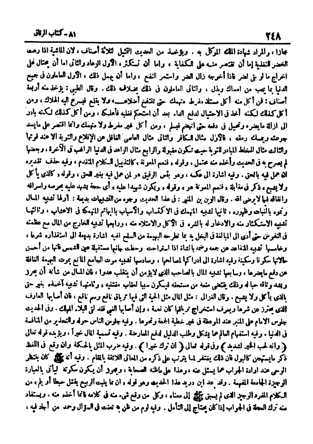 مَجَازًا وَالْمُرَادُ شَهَادَةُ الْمَلِكِ الْمُوَكَّلِ بِهِ وَيُؤْخَذُ مِنَ الْحَدِيثِ التَّمْثِيلُ لِثَلَاثَةِ أَصْنَافٍ لِأَنَّ الْمَاشِيَةَ إِذَا رَعَتِ الْخَضِرَ لِلتَّغْذِيَةِ إِمَّا أَنْ تَقْتَصِرَ مِنْهُ عَلَى الْكِفَايَةِ وَإِمَّا أَنْ تَسْتَكْثِرَ الْأَوَّلُ الزُّهَّادُ وَالثَّانِي إِمَّا أَنْ يَحْتَالَ عَلَى إِخْرَاجِ مَا لَوْ بَقِيَ لَضَرَّ فَإِذَا أَخْرَجَهُ زَالَ الضُّرُّ وَاسْتَمَرَّ النَّفْعُ وَإِمَّا أَنْ يُهْمِلَ ذَلِكَ الْأَوَّلُ الْعَامِلُونَ فِي جَمِيعِ الدُّنْيَا بِمَا يَجِبُ مِنْ إِمْسَاكٍ وَبَذْلٍ وَالثَّانِي الْعَامِلُونَ فِي ذَلِكَ بِخِلَافِ ذَلِكَ وَقَالَ الطِّيبِيُّ يُؤْخَذُ مِنْهُ أَرْبَعَةُ أَصْنَافٍ فَمَنْ أَكَلَ مِنْهُ أَكْلَ مُسْتَلِذٍّ مُفْرِطٍ مُنْهَمِكٍ حَتَّى تَنْتَفِخَ أَضْلَاعُهُ وَلَا يُقْلِعَ فَيُسْرِعُ إِلَيْهِ الْهَلَاكُ وَمَنْ أَكَلَ كَذَلِكَ لَكِنَّهُ أَخَذَ فِي الِاحْتِيَالِ لِدَفْعِ الدَّاءِ بَعْدَ أَنِ اسْتَحْكَمَ فَغَلَبَهُ فَأَهْلَكَهُ وَمَنْ أَكَلَ كَذَلِكَ لَكِنَّهُ بَادَرَ إِلَى إِزَالَة مَا يضرّهُ وتحيل فِي دَفْعِهِ حَتَّى انْهَضَمَ فَيَسْلَمُ وَمَنْ أَكَلَ غَيْرَ مُفْرِطٍ وَلَا مُنْهَمِكٍ وَإِنَّمَا اقْتَصَرَ عَلَى مَا يَسُدُّ جَوْعَتَهُ وَيُمْسِكُ رَمَقَهُ فَالْأَوَّلُ مِثَالُ الْكَافِرِ وَالثَّانِي مِثَالُ الْعَاصِي الْغَافِلِ عَنِ الْإِقْلَاعِ وَالتَّوْبَةِ إِلَّا عِنْدَ فَوْتِهَا وَالثَّالِثُ مِثَالٌ لِلْمُخَلِّطِ الْمُبَادِرِ لِلتَّوْبَةِ حَيْثُ تَكُونُ مَقْبُولَةً وَالرَّابِعُ مِثَالُ الزَّاهِدِ فِي الدُّنْيَا الرَّاغِبِ فِي الْآخِرَةِ وَبَعْضُهَا لَمْ يُصَرِّحْ بِهِ فِي الْحَدِيثِ وَأَخْذُهُ مِنْهُ مُحْتَمَلٌ وَقَوْلُهُ فَنِعْمَ الْمَعُونَةُ كَالتَّذْيِيلِ لِلْكَلَامِ الْمُتَقَدِّمِ وَفِيهِ حَذْفٌ تَقْدِيرُهُ إِنْ عَمِلَ فِيهِ بِالْحَقِّ وَفِيهِ إِشَارَةٌ إِلَى عَكْسِهِ وَهُوَ بِئْسَ الرَّفِيقُ هُوَ لِمَنْ عَمِلَ فِيهِ بِغَيْرِ الْحَقِّ وَقَوْلُهُ كَالَّذِي يَأْكُلُ وَلَا يَشْبَعُ ذُكِرَ فِي مُقَابَلَةِ فَنِعْمَ الْمَعُونَةُ هُوَ وَقَوْلُهُ وَيَكُونُ شَهِيدًا عَلَيْهِ أَيْ حُجَّةً يَشْهَدُ عَلَيْهِ بِحِرْصِهِ وَإِسْرَافِهِ وَإِنْفَاقِهِ فِيمَا لَا يُرْضِي اللَّهَ وَقَالَ الزَّيْنُ بْنُ الْمُنِيرِ فِي هَذَا الْحَدِيثِ وُجُوهٌ مِنَ التَّشْبِيهَاتِ بَدِيعَةٌ أَوَّلُهَا تَشْبِيهُ الْمَالِ وَنُمُوِّهِ بِالنَّبَاتِ وَظُهُورِهِ ثَانِيهَا تَشْبِيهُ الْمُنْهَمِكِ فِي الِاكْتِسَابِ وَالْأَسْبَابِ بِالْبَهَائِمِ الْمُنْهَمِكَةِ فِي الْأَعْشَابِ وَثَالِثُهَا تَشْبِيهُ الِاسْتِكْثَارِ مِنْهُ وَالِادِّخَارُ لَهُ بِالشَّرَهِ فِي الْأَكْلِ وَالِامْتِلَاءِ مِنْهُ وَرَابِعُهَا تَشْبِيهُ الْخَارِجِ مِنَ الْمَالِ مَعَ عَظَمَتِهِ فِي النُّفُوسِ حَتَّى أَدَّى إِلَى الْمُبَالَغَةِ فِي الْبُخْلِ بِهِ بِمَا تَطْرَحُهُ الْبَهِيمَةُ مِنَ السَّلْحِ فَفِيهِ إِشَارَةٌ بَدِيعَةٌ إِلَى اسْتِقْذَارِهِ شَرْعًا وَخَامِسُهَا تَشْبِيهُ الْمُتَقَاعِدِ عَنْ جَمْعِهِ وَضَمِّهِ بِالشَّاةِ إِذَا اسْتَرَاحَتْ وَحَطَّتْ جَانِبَهَا مُسْتَقْبِلَةً عَيْنَ الشَّمْسِ فَإِنَّهَا مِنْ أَحْسَنِ حَالَاتِهَا سُكُونًا وَسَكِينَةً وَفِيهِ إِشَارَةٌ إِلَى إِدْرَاكِهَا لِمَصَالِحِهَا وَسَادِسُهَا تَشْبِيهُ مَوْتِ الْجَامِعِ الْمَانِعِ بِمَوْتِ الْبَهِيمَةِ الْغَافِلَةِ عَنْ دَفْعِ مَا يَضُرُّهَا وَسَابِعُهَا تَشْبِيهُ الْمَالِ بِالصَّاحِبِ الَّذِي لَا يُؤْمَنُ أَنْ يَنْقَلِبَ عَدُوًّا فَإِنَّ الْمَالَ مِنْ شَأْنِهِ أَنْ يُحْرَزَ وَيُشَدَّ وَثَاقُهُ حُبًّا لَهُ وَذَلِكَ يَقْتَضِي مَنْعَهُ مِنْ مُسْتَحِقِّهِ فَيَكُ