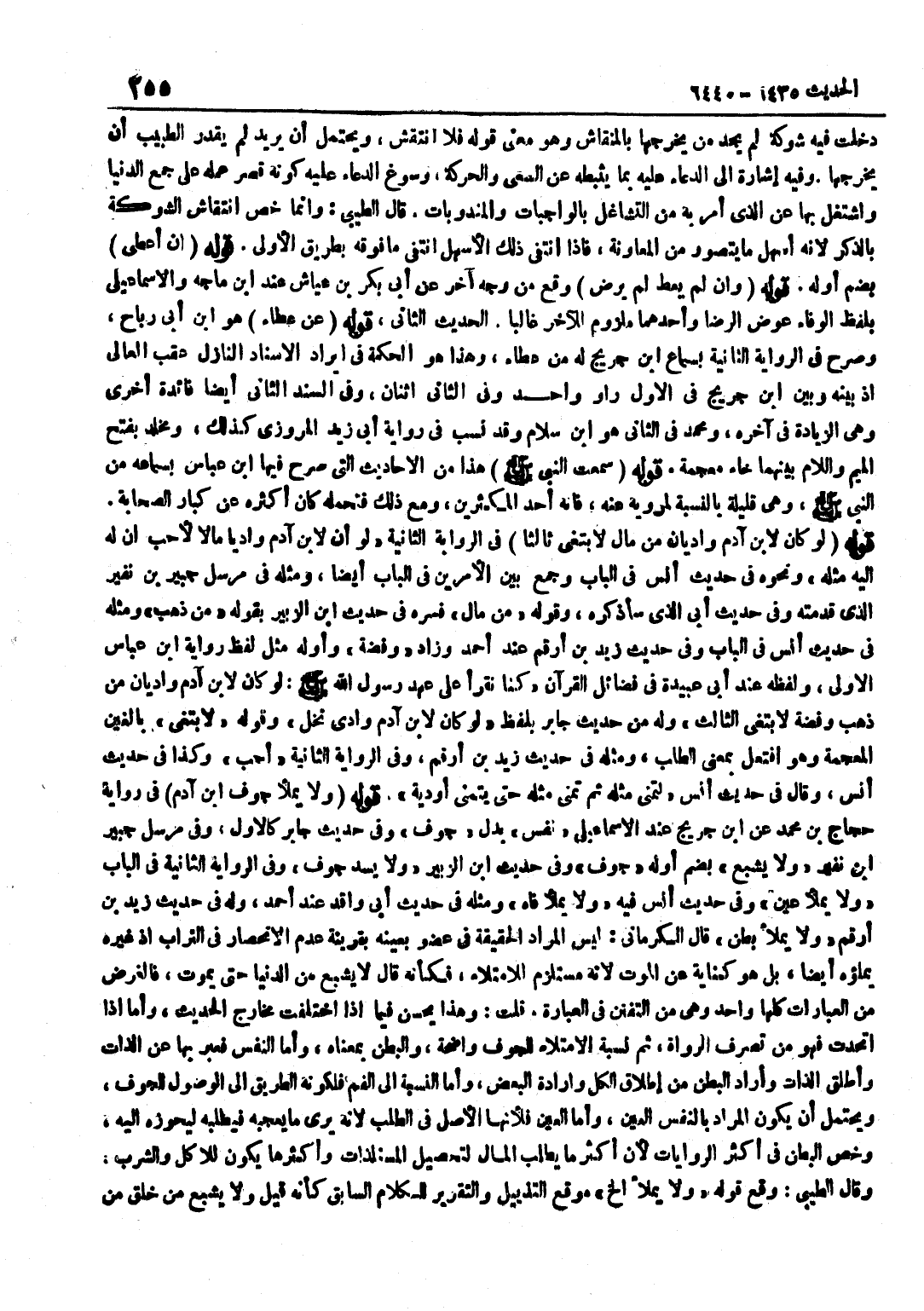 [6436] قَوْلُهُ لَوْ كَانَ لِابْنِ آدَمَ وَادِيَانِ مِنْ مَالٍ لَابْتَغَى ثَالِثًا فِي الرِّوَايَةِ الثَّانِيَةِ لَوْ أَنَّ لِابْنِ آدَمَ وَادِيًا مَالًا لَأَحَبَّ أَنَّ لَهُ إِلَيْهِ مِثْلَهُ وَنَحْوُهُ فِي حَدِيثِ أَنَسٍ فِي الْبَابِ وَجَمَعَ بَيْنَ الْأَمْرَيْنِ فِي الْبَابِ أَيْضًا وَمِثْلُهُ فِي مُرْسَلِ جُبَيْرِ بْنِ نُفَيْرٍ الَّذِي قَدَّمْتُهُ وَفِي حَدِيثِ أَبِي الَّذِي سَأَذْكُرُهُ وَقَوْلُهُ مِنْ مَالٍ فَسَّرَهُ فِي حَدِيث بن الزُّبَيْرِ بِقَوْلِهِ مِنْ ذَهَبٍ وَمِثْلُهُ فِي حَدِيثِ أَنَسٍ فِي الْبَابِ وَفِي حَدِيثِ زَيْدِ بْنِ أَرْقَمَ عِنْدَ أَحْمَدَ وَزَادَ وَفِضَّةٍ وَأَوَّلُهُ مِثْلُ لفظ رِوَايَة بن عَبَّاسٍ الْأُولَى وَلَفْظُهُ عِنْدَ أَبِي عُبَيْدَةَ فِي فَضَائِلِ الْقُرْآنِ كُنَّا نَقْرَأُ عَلَى عَهْدِ رَسُولِ اللَّهِ صَلَّى اللَّهُ عَلَيْهِ وَسَلَّمَ لَوْ كَانَ لِابْنِ آدَمَ وَادِيَانِ مِنْ ذَهَبٍ وَفِضَّةٍ لَابْتَغَى الثَّالِثَ وَلَهُ مِنْ حَدِيثِ جَابِرٍ بِلَفْظِ لَوْ كَانَ لِابْنِ آدَمَ وَادِي نَخْلٍ وَقَوْلُهُ لَابْتَغَى بِالْغَيْنِ الْمُعْجَمَةِ وَهُوَ افْتَعَلَ بِمَعْنَى الطَّلَبِ وَمِثْلُهُ فِي حَدِيثِ زَيْدِ بْنِ أَرْقَمَ وَفِي الرِّوَايَةِ الثَّانِيَةِ أَحَبَّ وَكَذَا فِي حَدِيثِ أَنَسٍ وَقَالَ فِي حَدِيثِ أَنَسٍ لَتَمَنَّى مِثْلَهُ ثُمَّ تَمَنَّى مِثْلَهُ حَتَّى يَتَمَنَّى أَوْدِيَةً قَوْلُهُ وَلَا يَمْلَأُ جَوف بن آدَمَ فِي رِوَايَةِ حَجَّاجِ بْنِ مُحَمَّدٍ عَنِ بن جُرَيْجٍ عِنْدَ الْإِسْمَاعِيلِيِّ نَفْسَ بَدَلَ جَوْفَ وَفِي حَدِيثِ جَابِرٍ كَالْأَوَّلِ وَفِي مُرْسَلِ جُبَيْرِ بْنِ نُفَيْرٍ وَلَا يُشْبِعُ بِضَمِّ أَوَّلِهِ جَوْفَ وَفِي حَدِيث بن الزُّبَيْرِ وَلَا يَسُدُّ جَوْفَ وَفِي الرِّوَايَةِ الثَّانِيَةِ فِي الْبَابِ وَلَا يَمْلَأُ عَيْنَ وَفِي حَدِيثِ أَنَسٍ فِيهِ وَلَا يَمْلَأُ فَاهُ وَمِثْلُهُ فِي حَدِيثِ أَبِي وَاقِدٍ عِنْدَ أَحْمَدَ وَلَهُ فِي حَدِيثِ زَيْدِ بْنِ أَرْقَمَ وَلَا يَمْلَأُ بَطْنَ قَالَ الْكِرْمَانِيُّ لَيْسَ الْمُرَادُ الْحَقِيقَةَ فِي عُضْوٍ بِعَيْنِهِ بِقَرِينَةِ عَدَمِ الِانْحِصَارِ فِي التُّرَابِ إِذْ غَيْرُهُ يَمْلَؤُهُ أَيْضًا بَلْ هُوَ كِنَايَةٌ عَنَ الْمَوْتِ لِأَنَّهُ مُسْتَلْزِمٌ لِلِامْتِلَاءِ فَكَأَنَّهُ قَالَ لَا يَشْبَعُ مِنَ الدُّنْيَا حَتَّى يَمُوتَ فَالْغَرَضُ مِنَ الْعِبَارَاتِ كُلِّهَا وَاحِدٌ وَهِيَ مِنَ التَّفَنُّنِ فِي الْعِبَارَةِ قُلْتُ وَهَذَا يَحْسُنُ فِيمَا إِذَا اخْتَلَفَتْ مَخَارِجُ الْحَدِيثِ وَأَمَّا إِذَا اتَّحَدَتْ فَهُوَ مِنْ تَصَرُّفِ الرُّوَاةِ ثُمَّ نِسْبَةُ الِامْتِلَاءِ لِلْجَوْفِ وَاضِحَةٌ وَالْبَطْنُ بِمَعْنَاهُ وَأَمَّا النَّفْسُ فَعَبَّرَ بِهَا عَنِ الذَّاتِ وَأَطْلَقَ الذَّاتَ وَأَرَادَ الْبَطْنَ مِنْ إِطْلَاقِ الْكل وَإِرَادَة الْبَعْض وَأَمَّا النِّسْبَةُ إِلَى الْفَمِ فَلِكَوْنِهِ الطَّرِيقَ إِلَى الْوُصُولِ لِلْجَوْفِ وَيَحْتَمِلُ أَنْ يَكُونَ الْمُرَادُ بِالنَّفْسِ الْعَيْنَ وَأَمَّا الْعَيْنُ فَلِأَنَّهَا الْأَصْلُ فِي الطَّلَبِ لِأَنَّهُ يَرَى مَا يُعْجِبُهُ فَيَطْلُبُهُ لِيَحُوزَهُ إِلَيْهِ وَخَصَّ الْبَطْنَ فِي أَكْثَرِ الرِّوَايَاتِ لِأَنَّ أَكْثَرَ مَا يُطْلَبُ الْمَالُ لِتَحْصِيلِ الْمُسْتَلَذَّاتِ وَأَكْثَرُهَا يَكُونُ لِلْأَكْلِ وَالشُّرْبِ وَقَالَ الطِّيبِيُّ وَقَعَ قَوْلُهُ وَلَا يَمْلَأُ إِلَخْ مَوْقِعَ التَّذْيِيلِ وَالتَّقْرِيرِ لِلْكَلَامِ السَّابِقِ كَأَنَّهُ قِيلَ وَلَا يَشْبَعُ مَنْ خُلِقَ مِنَ