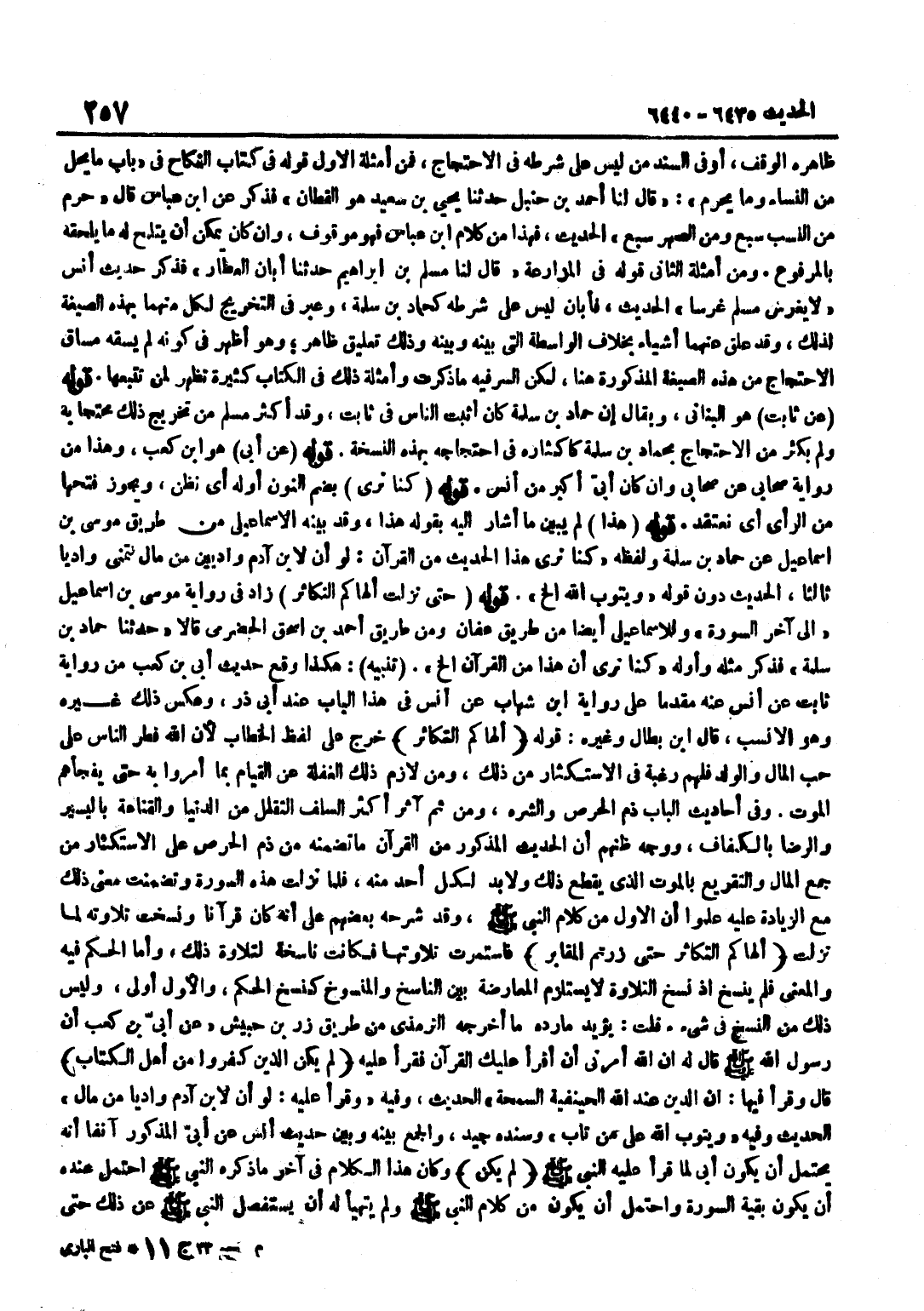 ظَاهِرُهُ الْوَقْفَ أَوْ فِي السَّنَدِ مَنْ لَيْسَ على شَرطه فِي الِاحْتِجَاج فَمن أَمْثِلَة الأولى قَوْلُهُ فِي كِتَابِ النِّكَاحِ فِي بَابِ مَا يَحِلُّ مِنَ النِّسَاءِ وَمَا يَحْرُمُ قَالَ لَنَا أَحْمَدُ بْنُ حَنْبَلٍ حَدَّثَنَا يَحْيَى بْنُ سَعِيدٍ هُوَ الْقطَّان فَذكر عَن بن عَبَّاسٍ قَالَ حَرُمَ مِنَ النَّسَبِ سَبْعٌ وَمِنَ الصهر سبع الحَدِيث فَهَذَا من كَلَام بن عَبَّاسٍ فَهُوَ مَوْقُوفٌ وَإِنْ كَانَ يُمْكِنُ أَنْ يُتَلَمَّحَ لَهُ مَا يُلْحِقُهُ بِالْمَرْفُوعِ وَمِنْ أَمْثِلَةِ الثَّانِي قَوْلُهُ فِي الْمُزَارَعَةِ قَالَ لَنَا مُسْلِمُ بْنُ إِبْرَاهِيمَ حَدَّثَنَا أَبَانٌ الْعَطَّارُ فَذَكَرَ حَدِيثَ أَنَسٍ لَا يَغْرِسُ مُسْلِمٌ غَرْسًا الْحَدِيثَ فَأَبَانٌ لَيْسَ عَلَى شَرْطِهِ كَحَمَّادِ بْنِ سَلَمَةَ وَعَبَّرَ فِي التَّخْرِيجِ لِكُلٍّ مِنْهُمَا بِهَذِهِ الصِّيغَةِ لِذَلِكَ وَقَدْ عَلَّقَ عَنْهُمَا أَشْيَاءَ بِخِلَافِ الْوَاسِطَةِ الَّتِي بَيْنَهُ وَبَيْنَهُ وَذَلِكَ تَعْلِيقٌ ظَاهِرٌ وَهُوَ أَظْهَرُ فِي كَوْنِهِ لَمْ يَسُقْهُ مَسَاقَ الِاحْتِجَاجِ مِنْ هَذِهِ الصِّيغَةِ الْمَذْكُورَةِ هُنَا لَكِنَّ السِّرَّ فِيهِ مَا ذَكَرْتُ وَأَمْثِلَةُ ذَلِكَ فِي الْكِتَابِ كَثِيرَةٌ تَظْهَرُ لِمَنْ تَتَبَّعَهَا قَوْلُهُ عَنْ ثَابِتٍ هُوَ الْبُنَانِيُّ وَيُقَالُ إِنَّ حَمَّادَ بْنَ سَلَمَةَ كَانَ أَثْبَتَ النَّاسِ فِي ثَابِتٍ وَقَدْ أَكْثَرَ مُسْلِمٌ مِنْ تَخْرِيجِ ذَلِكَ مُحْتَجًّا بِهِ وَلَمْ يُكْثِرْ مِنَ الِاحْتِجَاجِ بِحَمَّادِ بْنِ سَلَمَةَ كَإِكْثَارِهِ فِي احْتِجَاجِهِ بِهَذِهِ النُّسْخَةِ قَوْلُهُ عَنْ أُبَيٍّ هُوَ بن كَعْبٍ وَهَذَا مِنْ رِوَايَةِ صَحَابِيٍّ عَنْ صَحَابِيٍّ وَإِنْ كَانَ أُبَيٌّ أَكْبَرَ مِنْ أَنَسٍ قَوْلُهُ كُنَّا نُرَى بِضَمِّ النُّونِ أَوَّلِهِ أَيْ نَظُنُّ وَيَجُوزُ فَتْحُهَا مِنَ الرَّأْيِ أَيْ نَعْتَقِدُ قَوْلُهُ هَذَا لَمْ يُبَيِّنْ مَا أَشَارَ إِلَيْهِ بِقَوْلِهِ هَذَا وَقَدْ بَيَّنَهُ الْإِسْمَاعِيلِيُّ مِنْ طَرِيقِ مُوسَى بْنِ إِسْمَاعِيلَ عَنْ حَمَّادِ بْنِ سَلَمَةَ وَلَفْظُهُ كُنَّا نُرَى هَذَا الْحَدِيثَ مِنَ الْقُرْآنِ لَوْ أَنَّ لِابْنِ آدَمَ وَادِيَيْنِ مِنْ مَالٍ لَتَمَنَّى وَادِيًا ثَالِثًا الْحَدِيثُ دُونَ قَوْلِهِ وَيَتُوبُ اللَّهُ الخ قَوْله حَتَّى نزلت أَلْهَاكُم التكاثر زَادَ فِي رِوَايَةِ مُوسَى بْنِ إِسْمَاعِيلَ إِلَى آخِرِ السُّورَةِ وَلِلْإِسْمَاعِيلِيِّ أَيْضًا مِنْ طَرِيقِ عَفَّانَ وَمِنْ طَرِيقِ أَحْمَدَ بْنِ إِسْحَاقَ الْحَضْرَمِيِّ قَالَا حَدَّثَنَا حَمَّادُ بْنُ سَلَمَةَ فَذَكَرَ مِثْلَهُ وَأَوَّلُهُ كُنَّا نُرَى أَنَّ هَذَا مِنَ الْقُرْآنِ إِلَخْ تَنْبِيه هَكَذَا وَقَعَ حَدِيثُ أُبَيِّ بْنِ كَعْبٍ مِنْ رِوَايَةِ ثَابِتٍ عَنْ أَنَسٍ عَنْهُ مُقَدَّمًا عَلَى رِوَايَةِ ابْنِ شِهَابٍ عَنْ أَنَسٍ فِي هَذَا الْبَابِ عِنْدَ أَبِي ذَرٍّ وَعَكَسَ ذَلِك غَيره وَهُوَ الانسب قَالَ بن بطال وَغَيره قَوْله أَلْهَاكُم التكاثر خَرَجَ عَلَى لَفْظِ الْخِطَابِ لِأَنَّ اللَّهَ فَطَرَ النَّاسَ عَلَى حُبِّ الْمَالِ وَالْوَلَدِ فَلَهُمْ رَغْبَةٌ فِي الِاسْتِكْثَارِ مِنْ ذَلِكَ وَمِنْ لَازِمِ ذَلِكَ الْغَفْلَةُ عَنِ الْقِيَامِ بِمَا أُمِرُوا بِهِ حَتَّى يَفْجَأَهُمُ الْمَوْتُ وَفِي أَحَادِيثِ الْبَابِ ذَمُّ الْحِرْصِ وَالشَّرَهِ وَمِنْ ثَمَّ آثَرَ أَكْثَرَ السَّلَفِ التَّقَلُّلَ مِنَ الدُّنْيَا وَالْقَنَاعَةَ بِالْيَسِيرِ وَالرِّضَا بِالْكَفَافِ وَوَجْهُ ظَنِّهِمْ أَنَّ الْحَدِيثَ الْمَذْكُورَ مِنَ الْقُرْآنِ مَا تَضَمَّنَهُ مِنْ ذَمِّ الْحِرْصِ عَلَى الِاسْتِكْثَارِ مِنْ جَمْعِ الْمَالِ وَالتَّقْرِيعِ بِالْمَوْت