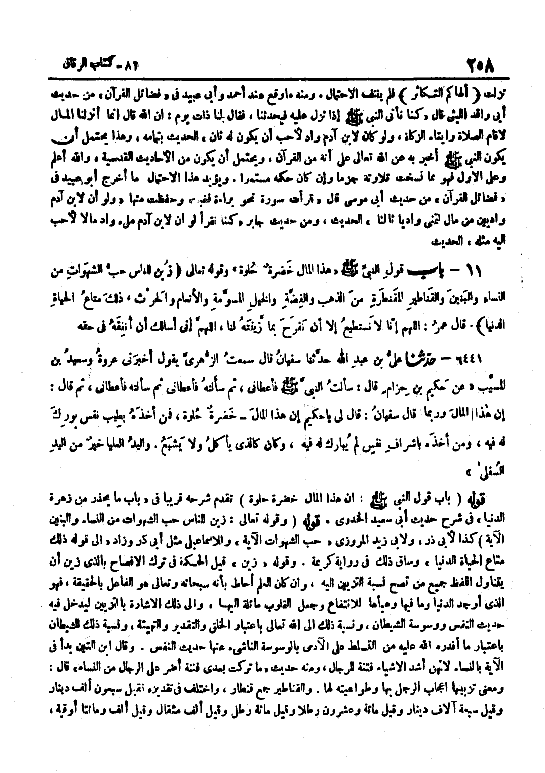 تَقَدَّمَ شَرْحُهُ قَرِيبًا فِي بَابِ مَا يُحْذَرُ مِنْ زَهْرَةِ الدُّنْيَا فِي شَرْحِ حَدِيثِ أَبِي سَعِيدٍ الْخُدْرِيِّ قَوْلُهُ وَقَوْلُهُ تَعَالَى زُيِّنَ لِلنَّاسِ حُبُّ الشَّهَوَاتِ مِنَ النِّسَاءِ والبنين الْآيَةَ كَذَا لِأَبِي ذَرٍّ وَلِأَبِي زَيْدٍ الْمَرْوَزِيِّ حب الشَّهَوَات الْآيَةَ وَلِلْإِسْمَاعِيلِيِّ مِثْلُ أَبِي ذَرٍّ وَزَادَ إِلَى قَوْله ذَلِك مَتَاع الْحَيَاة الدُّنْيَا وَسَاقَ ذَلِكَ فِي رِوَايَةِ كَرِيمَةَ وَقَوْلُهُ زُيِّنَ قِيلَ الْحِكْمَةُ فِي تَرْكِ الْإِفْصَاحِ بِالَّذِي زُيِّنَ أَنْ يَتَنَاوَلَ اللَّفْظُ جَمِيعَ مَنْ تَصِحُّ نِسْبَةُ التَّزْيِينِ إِلَيْهِ وَإِنْ كَانَ الْعِلْمُ أَحَاطَ بِأَنَّهُ سُبْحَانَهُ وَتَعَالَى هُوَ الْفَاعِلُ بِالْحَقِيقَةِ فَهُوَ الَّذِي أَوْجَدَ الدُّنْيَا وَمَا فِيهَا وَهَيَّأَهَا لِلِانْتِفَاعِ وَجَعَلَ الْقُلُوبَ مَائِلَةً إِلَيْهَا وَإِلَى ذَلِكَ الْإِشَارَةُ بِالتَّزْيِينِ لِيَدْخُلَ فِيهِ حَدِيثُ النَّفْسِ وَوَسْوَسَةُ الشَّيْطَانِ وَنِسْبَةُ ذَلِكَ إِلَى اللَّهِ تَعَالَى بِاعْتِبَارِ الْخَلْقِ وَالتَّقْدِيرِ وَالتَّهْيِئَةِ وَنِسْبَةُ ذَلِكَ لِلشَّيْطَانِ بِاعْتِبَارِ مَا أَقْدَرَهُ اللَّهُ عَلَيْهِ مِنَ التَّسَلُّطِ عَلَى الْآدَمِيِّ بِالْوَسْوَسَةِ الناشيء عَنْهَا حَدِيث النَّفس وَقَالَ بن التِّينِ بَدَأَ فِي الْآيَةِ بِالنِّسَاءِ لِأَنَّهُنَّ أَشَدُّ الْأَشْيَاءِ فِتْنَةً لِلرِّجَالِ وَمِنْهُ حَدِيثُ مَا تَرَكْتُ بَعْدِي فِتْنَةً أَضَرَّ عَلَى الرِّجَالِ مِنَ النِّسَاءِ قَالَ وَمَعْنَى تَزْيِينِهَا إِعْجَابُ الرَّجُلِ بِهَا وَطَوَاعِيَتُهُ لَهَا وَالْقَنَاطِيرُ جَمْعُ قِنْطَارٍ وَاخْتُلِفَ فِي تَقْدِيرِهِ فَقِيلَ سَبْعُونَ أَلْفَ دِينَارٍ وَقِيلَ سَبْعَةُ آلَافِ دِينَارٍ وَقِيلَ مِائَةٌ وَعِشْرُونَ رِطْلًا وَقِيلَ مِائَةُ رِطْلٍ وَقِيلَ أَلْفُ مِثْقَالٍ وَقِيلَ أَلْفٌ وَمِائَتَا أُوقِيَّة