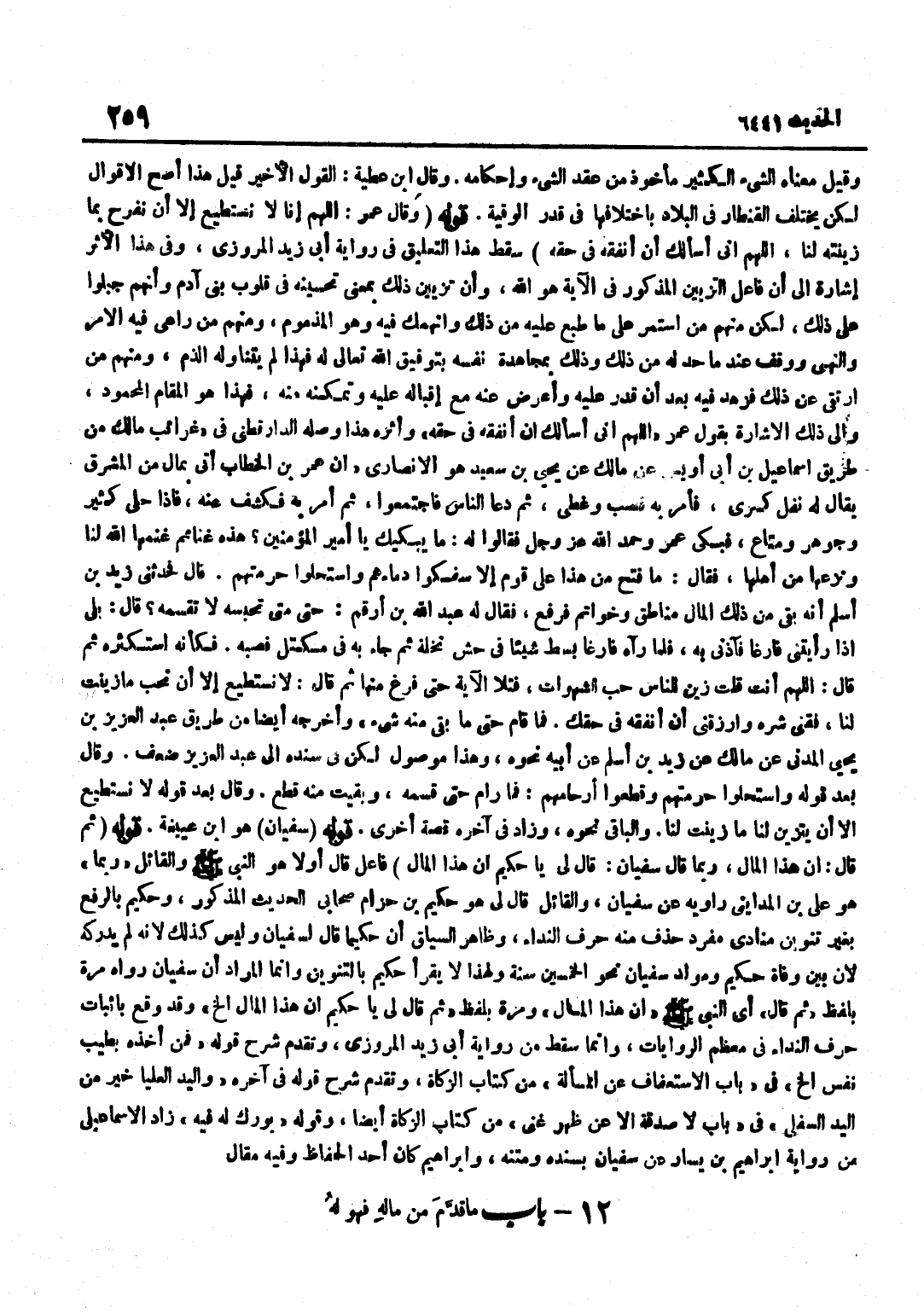 وَقِيلَ مَعْنَاهُ الشَّيْءُ الْكَثِيرُ مَأْخُوذٌ مِنْ عَقْدِ الشَّيْء واحكامه وَقَالَ بن عَطِيَّةَ الْقَوْلُ الْأَخِيرُ قِيلَ هَذَا أَصَحُّ الْأَقْوَالِ لَكِنْ يَخْتَلِفُ الْقِنْطَارُ فِي الْبِلَادِ بِاخْتِلَافِهَا فِي قَدْرِ الْوُقِيَّةِ قَوْلُهُ وَقَالَ عُمَرُ اللَّهُمَّ إِنَّا لَا نَسْتَطِيعُ إِلَّا أَنْ نَفْرَحَ بِمَا زَيَّنْتَهُ لَنَا اللَّهُمَّ إِنِّي أَسْأَلُكَ أَنْ أُنْفِقَهُ فِي حَقِّهِ سَقَطَ هَذَا التَّعْلِيقُ فِي رِوَايَةِ أَبِي زَيْدٍ الْمَرْوَزِيِّ وَفِي هَذَا الْأَثَرِ إِشَارَةٌ إِلَى أَنَّ فَاعِلَ التَّزْيِينِ الْمَذْكُورَ فِي الْآيَةِ هُوَ اللَّهُ وَأَنَّ تَزْيِينَ ذَلِكَ بِمَعْنَى تَحْسِينِهِ فِي قُلُوبِ بَنِي آدَمَ وَأَنَّهُمْ جُبِلُوا عَلَى ذَلِكَ لَكِنَّ مِنْهُمْ مَنِ اسْتَمَرَّ عَلَى مَا طُبِعَ عَلَيْهِ مَنْ ذَلِكَ وَانْهَمَكَ فِيهِ وَهُوَ الْمَذْمُومُ وَمِنْهُمْ مَنْ رَاعَى فِيهِ الْأَمْرَ وَالنَّهْيَ وَوَقَفَ عِنْدَ مَا حُدَّ لَهُ مِنْ ذَلِكَ وَذَلِكَ بِمُجَاهَدَةِ نَفْسِهِ بِتَوْفِيقِ اللَّهِ تَعَالَى لَهُ فَهَذَا لَمْ يَتَنَاوَلْهُ الذَّمُّ وَمِنْهُمْ مَنِ ارْتَقَى عَنْ ذَلِكَ فَزَهِدَ فِيهِ بَعْدَ أَنْ قَدَرَ عَلَيْهِ وَأَعْرَضَ عَنْهُ مَعَ إِقْبَالِهِ عَلَيْهِ وَتَمَكُّنِهِ مِنْهُ فَهَذَا هُوَ الْمَقَامُ الْمَحْمُودُ وَإِلَى ذَلِكَ الْإِشَارَةُ بِقَوْلِ عُمَرَ اللَّهُمَّ إِنِّي أَسْأَلُكَ أَنْ أُنْفِقَهُ فِي حَقِّهِ وَأَثَرُهُ هَذَا وَصَلَهُ الدَّارَقُطْنِيُّ فِي غَرَائِبِ مَالِكٍ مِنْ طَرِيقِ إِسْمَاعِيلَ بْنِ أَبِي أُوَيْسٍ عَنْ مَالِكٍ عَنْ يَحْيَى بْنِ سَعِيدٍ هُوَ الْأَنْصَارِيُّ أَنَّ عُمَرَ بْنَ الْخَطَّابِ أَتَى بِمَالٍ مِنَ الْمَشْرِقِ يُقَالُ لَهُ نَفْلُ كِسْرَى فَأَمَرَ بِهِ فَصُبَّ وَغُطِّيَ ثُمَّ دَعَا النَّاسَ فَاجْتَمَعُوا ثُمَّ أَمَرَ بِهِ فَكُشِفَ عَنْهُ فَإِذَا حُلِيٌّ كَثِيرٌ وَجَوْهَرٌ وَمَتَاعٌ فَبَكَى عُمَرُ وَحَمِدَ اللَّهَ عَزَّ وَجَلَّ فَقَالُوا لَهُ مَا يُبْكِيكَ يَا أَمِيرَ الْمُؤْمِنِينَ هَذِهِ غَنَائِمُ غَنِمَهَا اللَّهُ لَنَا وَنَزَعَهَا مِنْ أَهْلِهَا فَقَالَ مَا فُتِحَ مِنْ هَذَا عَلَى قَوْمٍ إِلَّا سَفَكُوا دِمَاءَهُمْ وَاسْتَحَلُّوا حُرْمَتَهُمْ قَالَ فَحَدَّثَنِي زَيْدُ بْنُ أَسْلَمَ أَنَّهُ بَقِيَ مِنْ ذَلِكَ الْمَالِ مَنَاطِقُ وَخَوَاتِمُ فَرُفِعَ فَقَالَ لَهُ عَبْدُ اللَّهِ بْنُ أَرْقَمَ حَتَّى مَتَى تَحْبِسُهُ لَا تُقَسِّمُهُ قَالَ بَلَى إِذَا رَأَيْتَنِي فَارِغًا فَآذِنِّي بِهِ فَلَمَّا رَآهُ فَارِغًا بَسَطَ شَيْئًا فِي حُشِّ نَخْلَةٍ ثُمَّ جَاءَ بِهِ فِي مِكْتَلٍ فَصَبَّهُ فَكَأَنَّهُ اسْتَكْثَرَهُ ثُمَّ قَالَ اللَّهُمَّ أَنْتَ قُلْتَ زُيِّنَ لِلنَّاسِ حب الشَّهَوَات فَتَلَا الْآيَةَ حَتَّى فَرَغَ مِنْهَا ثُمَّ قَالَ لَا نَسْتَطِيعُ إِلَّا أَنْ نُحِبَّ مَا زَيَّنْتَ لَنَا فَقِنِي شَرَّهُ وَارْزُقْنِي أَنْ أُنْفِقَهُ فِي حَقِّكَ فَمَا قَامَ حَتَّى مَا بَقِيَ مِنْهُ شَيْءٌ وَأَخْرَجَهُ أَيْضًا مِنْ طَرِيقِ عَبْدِ الْعَزِيزِ بْنِ يَحْيَى الْمَدَنِيِّ عَنْ مَالِكٍ عَنْ زَيْدِ بْنِ أَسْلَمَ عَنْ أَبِيهِ نَحْوَهُ وَهَذَا مَوْصُولٌ لَكِنْ فِي سَنَدِهِ إِلَى عَبْدِ الْعَزِيزِ ضَعْفٌ وَقَالَ بَعْدَ قَوْلِهِ وَاسْتَحَلُّوا حُرْمَتَهُمْ وَقَطَعُوا أَرْحَامَهُمْ فَمَا رَامَ حَتَّى قَسَمَهُ وَبَقِيَتْ مِنْهُ قِطَعٌ وَقَالَ بَعْدَ قَوْلِهِ لَا نَسْتَطِيعُ إِلَّا أَنْ يَتَزَيَّنَ لَنَا مَا زَيَّنْتُ لَنَا وَالْبَاقِي نَحْوُهُ وَزَادَ فِي آخِرِهِ قِصَّةً أُخْرَى