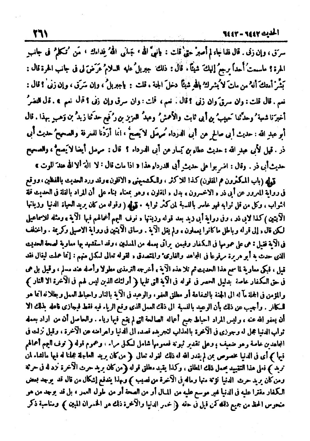كَذَا لِلْأَكْثَرِ وَلِلْكُشْمِيهَنِيِّ الْأَقَلُّونَ وَقَدْ وَرَدَ الْحَدِيثُ بِاللَّفْظَيْنِ وَوَقَعَ فِي رِوَايَةِ الْمَعْرُورِ عَنْ أَبِي ذَرٍّ الْأَخْسَرُونَ بَدَلَ الْمُقِلُّونَ وَهُوَ بِمَعْنَاهُ بِنَاءٌ عَلَى أَنَّ الْمُرَادَ بِالْقِلَّةِ فِي الْحَدِيثِ قِلَّةُ الثَّوَابِ وَكُلُّ مَنْ قَلَّ ثَوَابُهُ فَهُوَ خَاسِرٌ بِالنِّسْبَةِ لِمَنْ كَثُرَ ثَوَابُهُ قَوْلُهُ وَقَوْلُهُ مَنْ كَانَ يُرِيدُ الْحَيَاة الدُّنْيَا وَزينتهَا الْآيَتَيْنِ كَذَا لِأَبِي ذَرٍّ وَفِي رِوَايَةِ أَبِي زَيْدٍ بَعْدَ قَوْلِهِ وَزِينَتَهَا نُوَفِّ إِلَيْهِمْ أَعْمَالَهُمْ فِيهَا الْآيَةَ وَمِثْلُهُ لِلْإِسْمَاعِيلِيِّ لَكِنْ قَالَ إِلَى قَوْلِهِ وباطل مَا كَانُوا يعْملُونَ وَلَمْ يَقُلِ الْآيَةَ وَسَاقَ الْآيَتَيْنِ فِي رِوَايَةِ الْأَصِيلِيِّ وَكَرِيمَةَ وَاخْتُلِفَ فِي الْآيَةِ فَقِيلَ هِيَ عَلَى عُمُومِهَا فِي الْكُفَّارِ وَفِيمَنْ يُرَائِي بِعَمَلِهِ مِنَ الْمُسْلِمِينَ وَقَدِ اسْتَشْهَدَ بِهَا مُعَاوِيَةُ لِصِحَّةِ الْحَدِيثِ الَّذِي حَدَّثَ بِهِ أَبُو هُرَيْرَةَ مَرْفُوعًا فِي الْمُجَاهِد والقاريء وَالْمُتَصَدِّقِ لِقولِهِ تَعَالَى لِكُلٍّ مِنْهُمْ إِنَّمَا عَمِلْتَ لِيُقَالَ فَقَدْ قِيلَ فَبَكَى مُعَاوِيَةُ لَمَّا سَمِعَ هَذَا الْحَدِيثَ ثُمَّ تَلَا هَذِهِ الْآيَةَ أَخْرَجَهُ التِّرْمِذِيُّ مُطَوَّلًا وَأَصْلُهُ عِنْدَ مُسْلِمٍ وَقِيلَ بَلْ هِيَ فِي حَقِّ الْكُفَّارِ خَاصَّةً بِدَلِيلِ الْحَصْرِ فِي قَوْلِهِ فِي الْآيَةِ الَّتِي تَلِيهَا أُولَئِكَ الَّذِينَ لَيْسَ لَهُمْ فِي الْآخِرَةِ إِلَّا النَّارُ وَالْمُؤْمِنُ فِي الْجُمْلَةِ مَآلُهُ إِلَى الْجَنَّةِ بِالشَّفَاعَةِ أَوْ مُطْلَقِ الْعَفْوِ وَالْوَعِيدُ فِي الْآيَةِ بِالنَّارِ وَإِحْبَاطِ الْعَمَلِ وَبُطْلَانِهِ إِنَّمَا هُوَ لِلْكَافِرِ وَأُجِيبَ عَنْ ذَلِكَ بِأَنَّ الْوَعِيدَ بِالنِّسْبَةِ إِلَى ذَلِكَ الْعَمَلِ الَّذِي وَقَعَ الرِّيَاءُ فِيهِ فَقَطْ فَيُجَازَى فَاعِلُهُ بِذَلِكَ إِلَّا أَنْ يَعْفُوَ اللَّهُ عَنْهُ وَلَيْسَ الْمُرَادُ إِحْبَاطَ جَمِيعِ أَعْمَالِهِ الصَّالِحَةِ الَّتِي لَمْ يَقَعْ فِيهَا رِيَاءٌ وَالْحَاصِلُ أَنَّ مَنْ أَرَادَ بِعَمَلِهِ ثَوَابَ الدُّنْيَا عُجِّلَ لَهُ وَجُوزِيَ فِي الْآخِرَةِ بِالْعَذَابِ لِتَجْرِيدِهِ قَصْدَهُ إِلَى الدُّنْيَا وَإِعْرَاضِهِ عَنِ الْآخِرَةِ وَقِيلَ نَزَلَتْ فِي الْمُجَاهِدِينَ خَاصَّةً وَهُوَ ضَعِيفٌ وَعَلَى تَقْدِيرِ ثُبُوتِهِ فَعُمُومُهَا شَامِلٌ لِكُلِّ مُرَاءٍ وَعُمُومُ قَوْلِهِ نُوَفِّ إِلَيْهِمْ أَعْمَالهم فِيهَا أَيْ فِي الدُّنْيَا مَخْصُوصٌ بِمَنْ لَمْ يُقَدِّرِ اللَّهَ لَهُ ذَلِكَ لِقولِهِ تَعَالَى مَنْ كَانَ يُرِيدُ الْعَاجِلَةَ عَجَّلْنَا لَهُ فِيهَا مَا نَشَاءُ لمن نُرِيد فَعَلَى هَذَا التَّقْيِيدِ يُحْمَلُ ذَلِكَ الْمُطْلَقُ وَكَذَا يُقَيَّدُ مُطْلَقُ قَوْلِهِ مَنْ كَانَ يُرِيدُ حَرْثَ الْآخِرَةِ نَزِدْ لَهُ فِي حَرْثِهِ وَمَنْ كَانَ يُرِيد حرث الدُّنْيَا نؤته مِنْهَا وَمَاله فِي الْآخِرَة من نصيب وَبِهَذَا يَنْدَفِعُ إِشْكَالُ مَنْ قَالَ قَدْ يُوجَدُ بَعْضُ الْكُفَّارِ مُقَتَّرًا عَلَيْهِ فِي الدُّنْيَا غَيْرَ مُوَسَّعٍ عَلَيْهِ مِنَ الْمَالِ أَوْ مِنَ الصِّحَّةِ أَوْ مِنْ طُولِ الْعُمْرِ بَلْ قَدْ يُوجَدُ مَنْ هُوَ مَنْحُوسُ الْحَظِّ مِنْ جَمِيعِ ذَلِكَ كَمَنْ قِيلَ فِي حَقِّهِ خَسِرَ الدُّنْيَا وَالْآخِرَةَ ذَلِك هُوَ الخسران الْمُبين ومناسبة ذكر