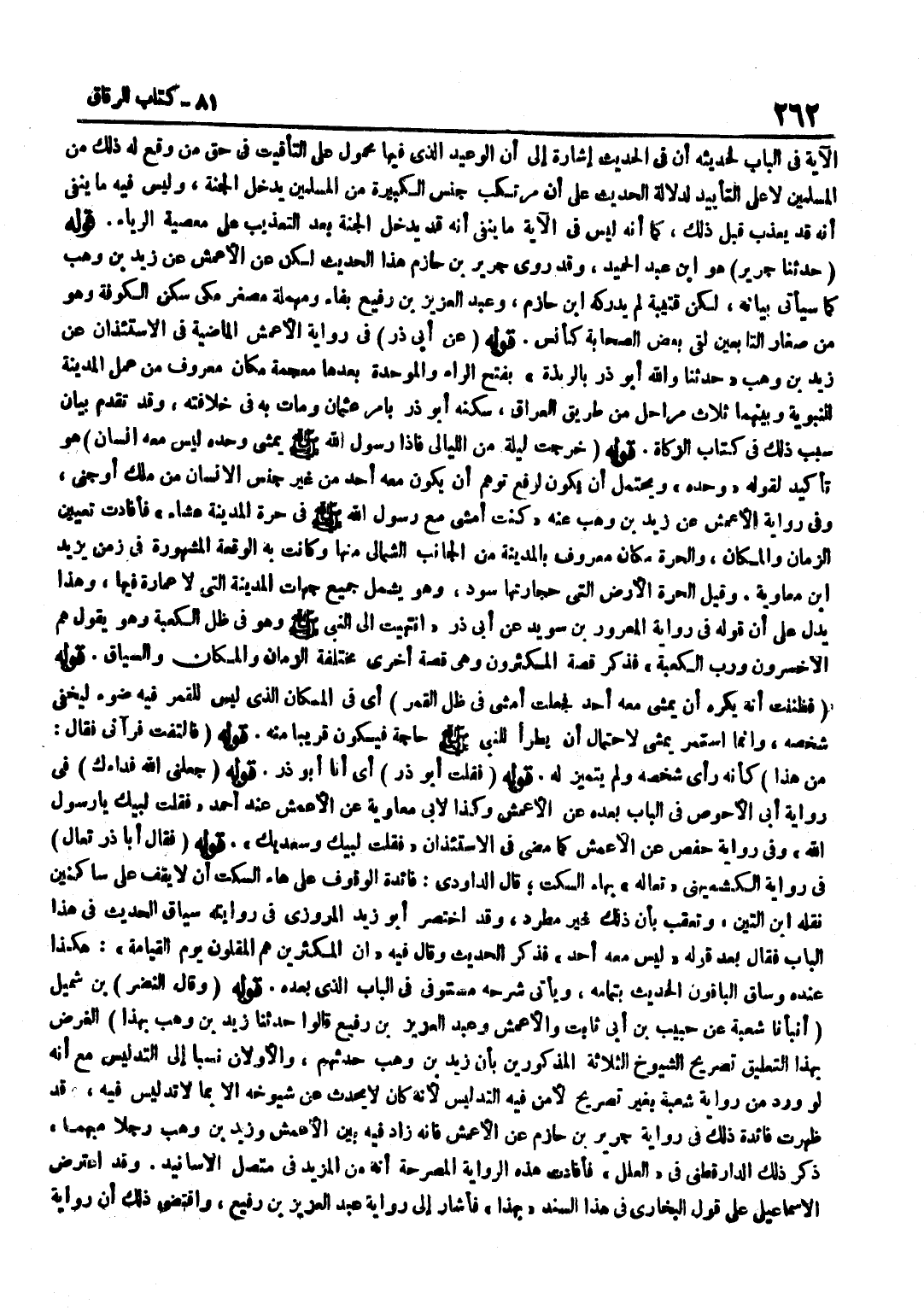 [6443] قَوْله حَدثنَا جرير هُوَ بن عَبْدِ الْحَمِيدِ وَقَدْ رَوَى جَرِيرُ بْنُ حَازِمٍ هَذَا الْحَدِيثَ لَكِنْ عَنِ الْأَعْمَشِ عَنْ زَيْدِ بْنِ وَهْبٍ كَمَا سَيَأْتِي بَيَانُهُ لَكِنْ قُتَيْبَةُ لم يُدْرِكهُ بن حَازِمٍ وَعَبْدُ الْعَزِيزِ بْنُ رُفَيْعٍ بِفَاءٍ وَمُهْمَلَةٍ مُصَغَّرٌ مَكِّيٌّ سَكَنَ الْكُوفَةَ وَهُوَ مِنْ صِغَارِ التَّابِعِينَ لَقِيَ بَعْضَ الصَّحَابَةِ كَأَنَسٍ قَوْلُهُ عَنْ أَبِي ذَرٍّ فِي رِوَايَةِ الْأَعْمَشِ الْمَاضِيَةِ فِي الِاسْتِئْذَانِ عَنْ زَيْدُ بْنُ وَهْبٍ حَدَّثَنَا وَاللَّهِ أَبُو ذَرٍّ بِالرَّبَذَةِ بِفَتْحِ الرَّاءِ وَالْمُوَحَّدَةِ بَعْدَهَا مُعْجَمَةٌ مَكَانٌ مَعْرُوفٌ مِنْ عَمَلِ الْمَدِينَةِ النَّبَوِيَّةِ وَبَيْنَهُمَا ثَلَاثُ مَرَاحِلَ مِنْ طَرِيقِ الْعِرَاقِ سَكَنَهُ أَبُو ذَرٍّ بِأَمْرِ عُثْمَانَ وَمَاتَ بِهِ فِي خِلَافَتِهِ وَقَدْ تَقَدَّمَ بَيَانُ سَبَبِ ذَلِكَ فِي كِتَابِ الزَّكَاةِ قَوْلُهُ خَرَجْتُ لَيْلَةً مِنَ اللَّيَالِي فَإِذَا رَسُولُ اللَّهِ صَلَّى اللَّهُ عَلَيْهِ وَسَلَّمَ يَمْشِي وَحْدَهُ لَيْسَ مَعَهُ إِنْسَانٌ هُوَ تَأْكِيدٌ لِقَوْلِهِ وَحْدَهُ وَيَحْتَمِلُ أَنْ يَكُونَ لِرَفْعِ تَوَهُّمٍ أَنْ يَكُونَ مَعَهُ أَحَدٌ مِنْ غَيْرِ جِنْسِ الْإِنْسَانِ مِنْ مَلَكٍ أَوْ جِنِّيٍّ وَفِي رِوَايَةِ الْأَعْمَشِ عَنْ زَيْدِ بْنِ وَهْبٍ عَنْهُ كُنْتُ أَمْشِي مَعَ رَسُولِ اللَّهِ صَلَّى اللَّهُ عَلَيْهِ وَسَلَّمَ فِي حَرَّةِ الْمَدِينَةِ عِشَاءً فَأَفَادَتْ تَعْيِينَ الزَّمَانِ وَالْمَكَانِ وَالْحَرَّةُ مَكَانٌ مَعْرُوفٌ بِالْمَدِينَةِ مِنَ الْجَانِبِ الشَّمَالِيِّ مِنْهَا وَكَانَتْ بِهِ الْوَقْعَةُ الْمَشْهُورَةُ فِي زَمَنِ يَزِيدَ بْنِ مُعَاوِيَةَ وَقِيلَ الْحَرَّةُ الْأَرْضُ الَّتِي حِجَارَتَهَا سُودٌ وَهُوَ يَشْمَلُ جَمِيعَ جِهَاتِ الْمَدِينَةِ الَّتِي لَا عِمَارَةَ فِيهَا وَهَذَا يَدُلُّ عَلَى أَنَّ قَوْلَهُ فِي رِوَايَةِ الْمَعْرُورِ بْنِ سُوَيْدٍ عَنْ أَبِي ذَرٍّ انْتَهَيْتُ إِلَى النَّبِيِّ صَلَّى اللَّهُ عَلَيْهِ وَسَلَّمَ وَهُوَ فِي ظِلِّ الْكَعْبَةِ وَهُوَ يَقُولُ هُمُ الْأَخْسَرُونَ وَرَبِّ الْكَعْبَة فَذكر قصَّة المكثرون وَهِيَ قِصَّةٌ أُخْرَى مُخْتَلِفَةُ الزَّمَانِ وَالْمَكَانِ وَالسِّيَاقِ قَوْلُهُ فَظَنَنْتُ أَنَّهُ يَكْرَهُ أَنْ يَمْشِيَ مَعَهُ أَحَدٌ فَجَعَلْتُ أَمْشِي فِي ظِلِّ الْقَمَرِ أَيْ فِي الْمَكَانِ الَّذِي لَيْسَ لِلْقَمَرِ فِيهِ ضَوْءٌ لِيُخْفِيَ شَخْصَهُ وَإِنَّمَا اسْتَمَرَّ يَمْشِي لِاحْتِمَالِ أَنْ يَطْرَأَ لِلنَّبِيِّ صَلَّى اللَّهُ عَلَيْهِ وَسَلَّمَ حَاجَةٌ فَيَكُونَ قَرِيبًا مِنْهُ قَوْلُهُ فَالْتَفَتَ فَرَآنِي فَقَالَ مَنْ هَذَا كَأَنَّهُ رَأَى شَخْصَهُ وَلَمْ يَتَمَيَّزْ لَهُ قَوْلُهُ فَقُلْتُ أَبُو ذَرٍّ أَيْ أَنَا أَبُو ذَرٍّ قَوْلُهُ جَعَلَنِي اللَّهُ فِدَاءَكَ فِي رِوَايَةِ أَبِي الْأَحْوَصِ فِي الْبَابِ بَعْدَهُ عَنِ الْأَعْمَشِ وَكَذَا لِأَبِي مُعَاوِيَةَ عَنِ الْأَعْمَشِ عِنْدَ أَحْمَدَ فَقُلْتُ لَبَّيْكَ يَا رَسُولَ اللَّهِ وَفِي رِوَايَةِ حَفْصٍ عَنِ الْأَعْمَشِ كَمَا مَضَى فِي الِاسْتِئْذَانِ فَقُلْتُ لَبَّيْكَ وَسَعْدَيْكَ قَوْلُهُ فَقَالَ أَبَا ذَرٍّ تَعَالَ فِي رِوَايَةِ الْكُشْمِيهَنِيِّ تَعَالَهْ بِهَاءِ السَّكْتِ قَالَ الدَّاوُدِيُّ فَائِدَةُ الْوُقُوفِ عَلَى هَاءِ السَّكْتِ أَنْ لَا يَقِفَ عَلَى سَاكِنَيْنِ نَقَلَهُ بن التِّينِ وَتُعُقِّبَ بِأَنَّ ذَلِكَ غَيْرُ مُطَّرِدٍ وَقَدِ اخْتَصَرَ أَبُو زَيْدٍ الْمَرْوَزِيُّ فِي رِوَايَتِهِ سِيَاقَ الْحَدِيثِ فِي هَذَا الْبَابِ فَقَالَ بَعْدَ قَوْلِهِ لَيْسَ مَعَهُ أَحَدٌ فَذَكَرَ الْحَدِيثَ وَقَال