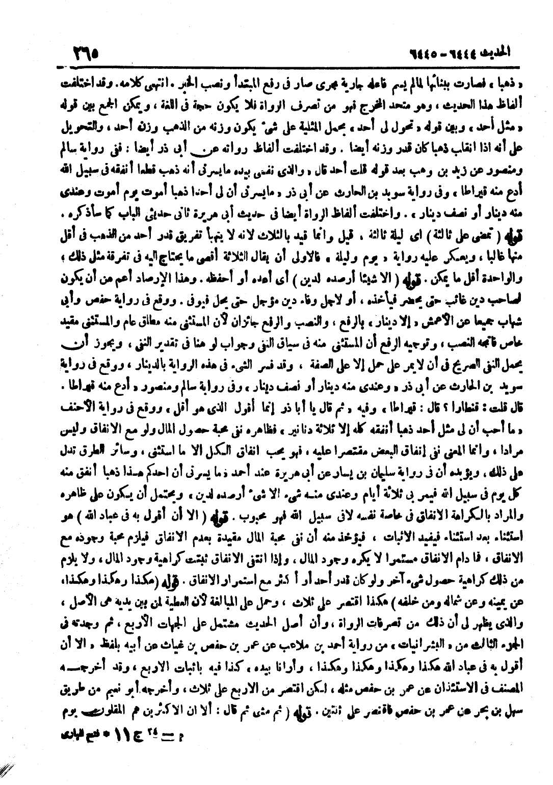 ذَهَبًا فَصَارَتْ بِبِنَائِهَا لِمَا لَمْ يُسَمَّ فَاعِلُهُ جَارِيَةً مَجْرَى صَارَ فِي رَفْعِ الْمُبْتَدَأِ وَنَصْبِ الْخَبَرِ انْتَهَى كَلَامُهُ وَقَدِ اخْتَلَفَتْ أَلْفَاظُ هَذَا الْحَدِيثِ وَهُوَ مُتَّحِدُ الْمَخْرَجِ فَهُوَ مِنْ تَصَرُّفِ الرُّوَاةِ فَلَا يَكُونُ حُجَّةً فِي اللُّغَةِ وَيُمْكِنُ الْجَمْعُ بَيْنَ قَوْلِهِ مِثْلُ أُحُدٍ وَبَيْنَ قَوْلِهِ تَحَوَّلَ لِي أُحُدٌ بِحَمْلِ الْمِثْلِيَّةِ عَلَى شَيْءٍ يَكُونُ وَزْنُهُ مِنَ الذَّهَبِ وَزْنَ أُحُدٍ وَالتَّحْوِيلُ عَلَى أَنَّهُ إِذَا انْقَلَبَ ذَهَبًا كَانَ قَدْرَ وَزْنِهِ أَيْضًا وَقَدِ اخْتَلَفَتْ أَلْفَاظُ رُوَاتِهِ عَنْ أَبِي ذَرٍّ أَيْضًا فَفِي رِوَايَةِ سَالِمٍ وَمَنْصُورٍ عَنْ زَيْدِ بْنِ وَهْبٍ بَعْدَ قَوْلِهِ قُلْتُ أُحُدٌ قَالَ وَالَّذِي نَفْسِي بِيَدِهِ مَا يَسُرُّنِي أَنَّهُ ذَهَبَ قَطْعًا أُنْفِقُهُ فِي سَبِيلِ اللَّهِ أَدَعُ مِنْهُ قِيرَاطًا وَفِي رِوَايَةِ سُوَيْدِ بْنِ الْحَارِثِ عَنْ أَبِي ذَرٍّ مَا يَسُرُّنِي أَنَّ لِي أُحُدًا ذَهَبًا أَمُوتُ يَوْمَ أَمُوتُ وَعِنْدِي مِنْهُ دِينَارٌ أَوْ نِصْفُ دِينَارٍ وَاخْتَلَفَتْ أَلْفَاظُ الرُّوَاةِ أَيْضًا فِي حَدِيثِ أَبِي هُرَيْرَةَ ثَانِي حَدِيثَيِ الْبَابِ كَمَا سَأَذْكُرُهُ قَوْلُهُ تَمْضِي عَلَيَّ ثَالِثَةٍ أَيْ لَيْلَةٌ ثَالِثَةٌ قِيلَ وَإِنَّمَا قَيَّدَ بِالثلَاثِ لِأَنَّهُ لَا يَتَهَيَّأُ تَفْرِيقُ قَدْرِ أُحُدٍ مِنَ الذَّهَبِ فِي أَقَلَّ مِنْهَا غَالِبًا وَيُعَكِّرُ عَلَيْهِ رِوَايَةُ يَوْمٌ وَلَيْلَةٌ فَالْأَوْلَى أَنْ يُقَالَ الثَّلَاثَةُ أَقْصَى مَا يُحْتَاجُ إِلَيْهِ فِي تَفْرِقَةِ مِثْلِ ذَلِكَ وَالْوَاحِدَةُ أَقَلُّ مَا يُمْكِنُ قَوْلُهُ إِلَّا شَيْئًا أَرْصُدُهُ لِدَيْنٍ أَيْ أَعُدُّهُ أَوْ أَحْفَظُهُ وَهَذَا الْإِرْصَادُ أَعَمُّ مِنْ أَنْ يَكُونَ لِصَاحِبِ دَيْنٍ غَائِبٍ حَتَّى يَحْضُرَ فَيَأْخُذَهُ أَوْ لِأَجْلِ وَفَاءِ دَيْنٍ مُؤَجَّلٍ حَتَّى يَحِلَّ فَيُوَفَّى وَوَقَعَ فِي رِوَايَةِ حَفْصٍ وَأَبِي شِهَابٍ جَمِيعًا عَنِ الْأَعْمَشِ إِلَّا دِينَارٌ بِالرَّفْعِ وَالنَّصْبُ وَالرَّفْعُ جَائِزَانِ لِأَنَّ الْمُسْتَثْنَى مِنْهُ مُطْلَقٌ عَامٌّ وَالْمُسْتَثْنَى مُقَيَّدٌ خَاصٌّ فَاتَّجَهَ النَّصْبُ وَتَوْجِيهُ الرَّفْعِ أَنَّ الْمُسْتَثْنَى مِنْهُ فِي سِيَاقِ النَّفْيِ وَجَوَابُ لَوْ هُنَا فِي تَقْدِيرِ النَّفْيِ وَيَجُوزُ أَنْ يُحْمَلَ النَّفْيُ الصَّرِيحُ فِي أَنْ لَا يَمُرَّ عَلَى حَمْلِ إِلَّا عَلَى الصِّفَةِ وَقَدْ فُسِّرَ الشَّيْءُ فِي هَذِهِ الرِّوَايَةِ بِالدِّينَارِ وَوَقَعَ فِي رِوَايَةِ سُوَيْدِ بْنِ الْحَارِثِ عَنْ أَبِي ذَرٍّ وَعِنْدِي مِنْهُ دِينَارٌ أَوْ نِصْفُ دِينَارٍ وَفِي رِوَايَةِ سَالِمٍ وَمَنْصُورٍ أَدَعُ مِنْهُ قِيرَاطًا قَالَ قُلْتُ قِنْطَارًا قَالَ قِيرَاطًا وَفِيهِ ثُمَّ قَالَ يَا أَبَا ذَرٍّ إِنَّمَا أَقُولُ الَّذِي هُوَ أَقَلُّ وَوَقَعَ فِي رِوَايَةِ الْأَحْنَفِ مَا أُحِبُّ أَنَّ لِي مِثْلَ أُحُدٍ ذَهَبَا أُنْفِقُهُ كُلَّهُ إِلَّا ثَلَاثَةَ دَنَانِيرَ فَظَاهِرُهُ نَفْيُ مَحَبَّةِ حُصُولِ الْمَالِ وَلَوْ مَعَ الْإِنْفَاقِ وَلَيْسَ مُرَادًا وَإِنَّمَا الْمَعْنَى نَفْيُ إِنْفَاقِ الْبَعْضِ مُقْتَصِرًا عَلَيْهِ فَهُوَ يُحِبُّ إِنْفَاقَ الْكُلِّ إِلَّا مَا اسْتَثْنَى وَسَائِرُ الطُّرُقِ تَدُلُّ عَلَى ذَلِكَ وَيُؤَيِّدُهُ أَنَّ فِي رِوَايَةِ سُلَيْمَانَ بْنِ يَسَارٍ عَنْ أَبِي هُرَيْرَةَ عِنْدَ أَحْمَدَ مَا يَسُرُّنِي أَنَّ أُحُدَكُمْ هَذَا ذَهَبًا أُنْفِقُ مِنْهُ كُلَّ يَوْمٍ فِي سَبِيلِ اللَّهِ فَيَمُرُّ بِي ثَلَاثَةُ أَيَّامٍ وَعِنْدِي مِنْهُ شَيْءٌ إِلَّا شَيْءٌ أَرْصُدُهُ لِدَيْن