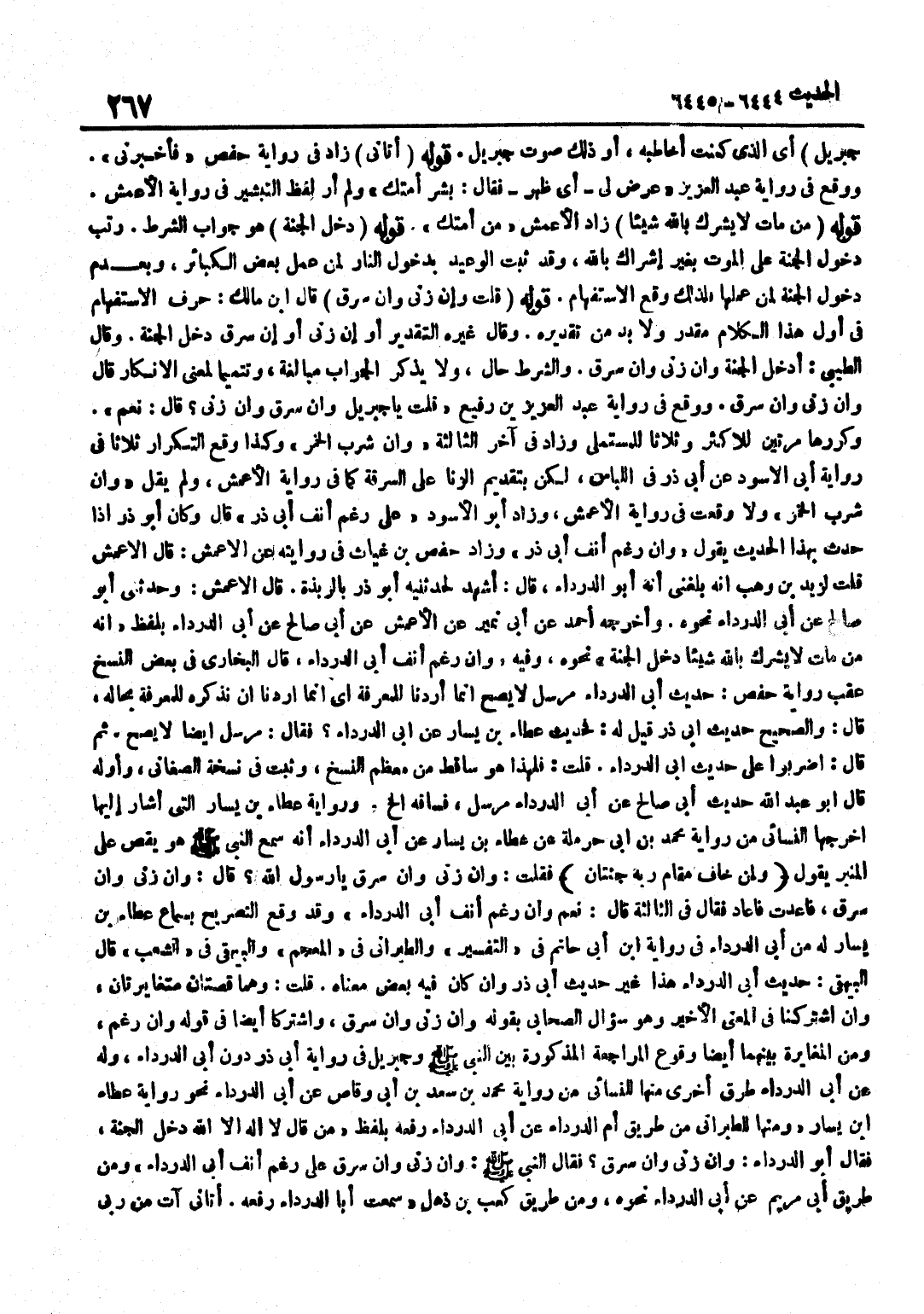 جِبْرِيلُ أَيِ الَّذِي كُنْتُ أُخَاطِبُهُ أَوْ ذَلِكَ صَوْتُ جِبْرِيلَ قَوْلُهُ أَتَانِي زَادَ فِي رِوَايَةِ حَفْصٍ فَأَخْبَرَنِي وَوَقَعَ فِي رِوَايَةِ عَبْدِ الْعَزِيزِ عَرَضَ لِي أَيْ ظَهَرَ فَقَالَ بَشِّرْ أُمَّتَكَ وَلَمْ أَرَ لَفْظَ التَّبْشِيرِ فِي رِوَايَةِ الْأَعْمَشِ قَوْلُهُ مَنْ مَاتَ لَا يُشْرِكُ بِاللَّهِ شَيْئًا زَادَ الْأَعْمَشُ مِنْ أُمَّتِكَ قَوْلُهُ دَخَلَ الْجَنَّةَ هُوَ جَوَابُ الشَّرْطِ رَتَّبَ دُخُولَ الْجَنَّةِ عَلَى الْمَوْتِ بِغَيْرِ إِشْرَاكِ بِاللَّهِ وَقَدْ ثَبَتَ الْوَعِيدُ بِدُخُولِ النَّارِ لِمَنْ عَمِلَ بَعْضَ الْكَبَائِرِ وَبِعَدَمِ دُخُولِ الْجَنَّةِ لِمَنْ عَمِلَهَا فَلِذَلِكَ وَقَعَ الِاسْتِفْهَامُ قَوْلُهُ قُلْتُ وَإِنْ زَنَى وَإِنْ سَرَقَ قَالَ بن مَالِكٍ حَرْفُ الِاسْتِفْهَامِ فِي أَوَّلِ هَذَا الْكَلَامِ مُقَدَّرٌ وَلَا بُدَّ مِنْ تَقْدِيرِهِ وَقَالَ غَيْرُهُ التَّقْدِيرُ أَوَ إِنْ زَنَى أَوَ إِنْ سَرَقَ دَخَلَ الْجَنَّةَ وَقَالَ الطِّيبِيُّ أُدْخِلَ الْجَنَّةَ وَإِنْ زَنَى وَإِنْ سَرَقَ وَالشَّرْطُ حَالٌ وَلَا يَذْكُرُ الْجَوَابَ مُبَالَغَةً وَتَتْمِيمًا لِمَعْنَى الْإِنْكَارِ قَالَ وَإِنْ زَنَى وَإِنْ سَرَقَ وَوَقَعَ فِي رِوَايَةِ عَبْدِ الْعَزِيزِ بْنِ رُفَيْعٍ قُلْتُ يَا جِبْرِيلُ وَإِنْ سَرَقَ وَإِنْ زَنَى قَالَ نَعَمْ وَكَرَّرَهَا مَرَّتَيْنِ لِلْأَكْثَرِ وَثَلَاثًا لِلْمُسْتَمْلِي وَزَادَ فِي آخِرِ الثَّالِثَةِ وَإِنْ شَرِبَ الْخَمْرَ وَكَذَا وَقَعَ التَّكْرَارُ ثَلَاثًا فِي رِوَايَةِ أَبِي الْأَسْوَدِ عَنْ أَبِي ذَرٍّ فِي اللِّبَاسِ لَكِنْ بِتَقْدِيمِ الزِّنَا عَلَى السَّرِقَةِ كَمَا فِي رِوَايَةِ الْأَعْمَشِ وَلَمْ يَقُلْ وَإِنْ شَرِبَ الْخَمْرَ وَلَا وَقَعَتْ فِي رِوَايَةِ الْأَعْمَشِ وَزَادَ أَبُو الْأَسْوَدِ عَلَى رَغْمِ أَنْفِ أَبِي ذَرٍّ قَالَ وَكَانَ أَبُو ذَرٍّ إِذَا حَدَّثَ بِهَذَا الْحَدِيثِ يَقُولُ وَإِنْ رَغِمَ أَنْفُ أَبِي ذَرٍّ وَزَادَ حَفْصُ بْنُ غِيَاثٍ فِي رِوَايَتِهِ عَنِ الْأَعْمَشِ قَالَ الْأَعْمَشُ قُلْتُ لِزَيْدِ بْنِ وَهْبٍ إِنَّهُ بَلَغَنِي أَنَّهُ أَبُو الدَّرْدَاءِ قَالَ أَشْهَدُ لَحَدَّثَنِيهِ أَبُو ذَرٍّ بِالرَّبَذَةِ قَالَ الْأَعْمَشُ وَحَدَّثَنِي أَبُو صَالِحٍ عَنْ أَبِي الدَّرْدَاءِ نَحْوَهُ وَأَخْرَجَهُ أَحْمَدُ عَنْ أَبِي نُمَيْرٍ عَنِ الْأَعْمَشِ عَنْ أَبِي صَالِحٍ عَنْ أَبِي الدَّرْدَاءِ بِلَفْظِ إِنَّهُ مَنْ مَاتَ لَا يُشْرِكُ بِاللَّهِ شَيْئًا دَخَلَ الْجَنَّةَ نَحْوَهُ وَفِيهِ وَإِنْ رَغِمَ أَنْفُ أَبِي الدَّرْدَاءِ قَالَ الْبُخَارِيُّ فِي بَعْضِ النُّسَخِ عَقِبَ رِوَايَةِ حَفْصٍ حَدِيثُ أَبِي الدَّرْدَاءِ مُرْسَلٌ لَا يَصِحُّ إِنَّمَا أَرَدْنَا لِلْمَعْرِفَةِ أَيْ إِنَّمَا أَرَدْنَا أَنْ نَذْكُرَهُ لِلْمَعْرِفَةِ بِحَالِهِ قَالَ وَالصَّحِيحُ حَدِيثُ أَبِي ذَرٍّ قِيلَ لَهُ فَحَدِيثُ عَطَاءِ بْنِ يَسَارٍ عَنْ أَبِي الدَّرْدَاءِ فَقَالَ مُرْسَلٌ أَيْضًا لَا يَصِحُّ ثُمَّ قَالَ اضْرِبُوا عَلَى حَدِيثِ أَبِي الدَّرْدَاءِ قُلْتُ فَلِهَذَا هُوَ سَاقِطٌ مِنْ مُعْظَمِ النُّسَخِ وَثَبَتَ فِي نُسْخَةِ الصَّغَانِيِّ وَأَوَّلَهُ قَالَ أَبُو عَبْدِ اللَّهِ حَدِيثُ أَبِي صَالِحٍ عَنْ أَبِي الدَّرْدَاءِ مُرْسَلٌ فَسَاقَهُ إِلَخْ وَرِوَايَةُ عَطَاءِ بْنِ يَسَارٍ الَّتِي أَشَارَ إِلَيْهَا أَخْرَجَهَا النَّسَائِيُّ مِنْ رِوَايَةِ مُحَمَّدِ بْنِ أَبِي حَرْمَلَةَ عَنْ عَطَاءِ بْنِ يَسَارٍ عَنْ أَبِي الدَّرْدَاءِ أَنَّهُ سَمِعَ النَّبِيَّ صَلَّى اللَّهُ عَلَيْهِ وَسَلَّمَ هُوَ يَقُصُّ عَلَى الْمِنْبَرِ يَقُولُ وَلِمَنْ خَافَ مقَام ربه جنتان فَقُلْتُ وَإِنْ زَنَى وَإِنْ سَرَق