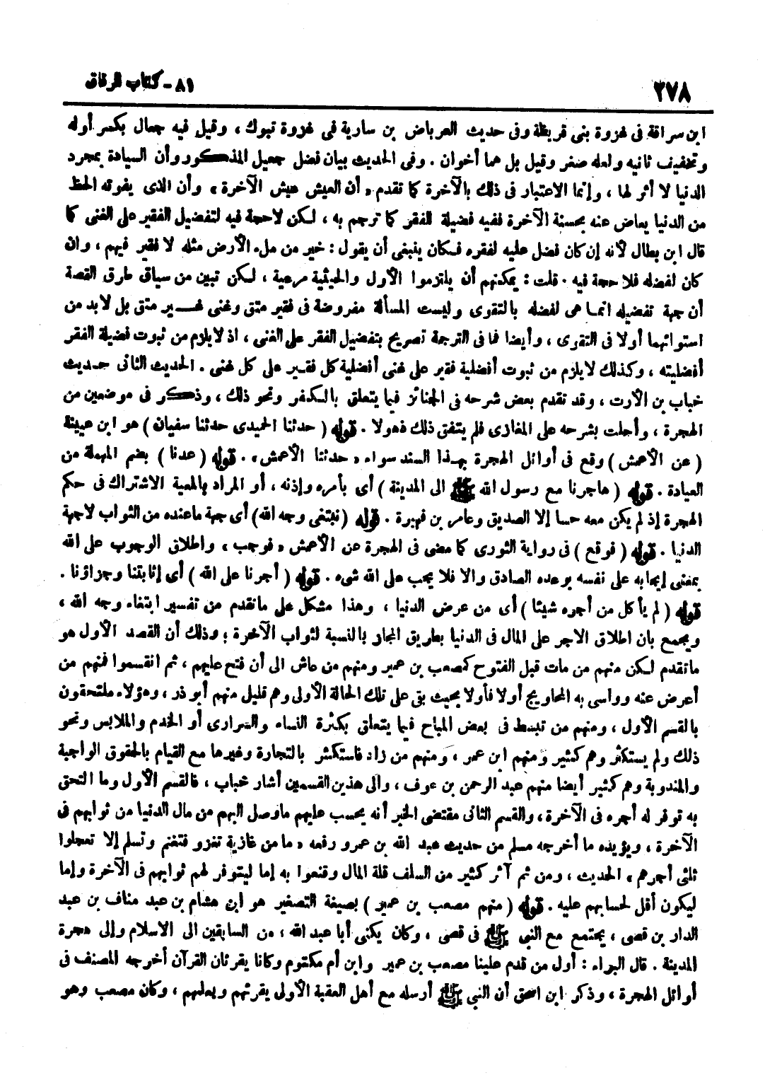 بْنِ سُرَاقَةَ فِي غَزْوَةِ بَنِي قُرَيْظَةَ وَفِي حَدِيثِ الْعِرْبَاضِ بْنِ سَارِيَةَ فِي غَزْوَةِ تَبُوكَ وَقِيلَ فِيهِ جِعَالٌ بِكَسْرِ أَوَّلِهِ وَتَخْفِيفِ ثَانِيهِ وَلَعَلَّهُ صُغِّرَ وَقِيلَ بَلْ هُمَا أَخَوَانِ وَفِي الْحَدِيثِ بَيَانُ فَضْلِ جُعَيْلٍ الْمَذْكُورِ وَأَنَّ السِّيَادَةَ بِمُجَرَّدِ الدُّنْيَا لَا أَثَرَ لَهَا وَإِنَّمَا الِاعْتِبَارُ فِي ذَلِكَ بِالْآخِرَةِ كَمَا تَقَدَّمَ أَنَّ الْعَيْشَ عَيْشُ الْآخِرَةِ وَأَنَّ الَّذِي يَفُوتُهُ الْحَظُّ مِنَ الدُّنْيَا يُعَاضُ عَنْهُ بِحَسَنَةِ الْآخِرَةِ فَفِيهِ فَضِيلَةٌ لِلْفَقْرِ كَمَا تَرْجَمَ بِهِ لَكِنْ لَا حُجَّةَ فِيهِ لتفضيل الْفَقِير على الْغَنِيّ كَمَا قَالَ بن بَطَّالٍ لِأَنَّهُ إِنْ كَانَ فُضِّلَ عَلَيْهِ لِفَقْرِهِ فَكَانَ يَنْبَغِي أَنْ يَقُولَ خَيْرٌ مِنْ مِلْءِ الْأَرْضِ مِثْلَهُ لَا فَقِيرَ فِيهِمْ وَإِنْ كَانَ لِفَضْلِهِ فَلَا حُجَّةَ فِيهِ قُلْتُ يُمْكِنُهُمْ أَنْ يَلْتَزِمُوا الْأَوَّلَ وَالْحَيْثِيَّةُ مَرْعِيَّةٌ لَكِنْ تَبَيَّنَ مِنْ سِيَاقِ طُرُقِ الْقِصَّةِ أَنَّ جِهَةَ تَفْضِيلِهِ إِنَّمَا هِيَ لِفَضْلِهِ بِالتَّقْوَى وَلَيْسَتِ الْمَسْأَلَةُ مَفْرُوضَةً فِي فَقِيرٍ مُتَّقٍ وَغَنِيٍّ غَيْرِ مُتَّقٍ بَلْ لَا بُدَّ مِنِ اسْتِوَائِهِمَا أَوَّلًا فِي التَّقْوَى وَأَيْضًا فَمَا فِي التَّرْجَمَةِ تَصْرِيحٌ بِتَفْضِيلِ الْفَقْرِ عَلَى الْغِنَى إِذْ لَا يَلْزَمُ مِنْ ثُبُوتِ فَضِيلَةِ الْفَقْرِ أَفْضَلِيَّتُهُ وَكَذَلِكَ لَا يَلْزَمُ مِنْ ثُبُوتِ أَفْضَلِيَّةِ فَقِيرٍ عَلَى غَنِيٍّ أَفَضَلِيَّةُ كُلِّ فَقِيرٍ عَلَى كُلِّ غَنِيٍّ الْحَدِيثُ الثَّانِي حَدِيثُ خَبَّابِ بْنِ الْأَرَتِّ وَقَدْ تَقَدَّمَ بَعْضُ شَرْحِهِ فِي الْجَنَائِزِ فِيمَا يَتَعَلَّقُ بِالْكُفْرِ وَنَحْوِ ذَلِكَ وَذُكِرَ فِي مَوْضِعَيْنِ مِنَ الْهِجْرَةِ وَأَحَلْتُ بِشَرْحِهِ عَلَى الْمَغَازِي فَلَمْ يَتَّفِقْ ذَلِكَ ذُهُولًا