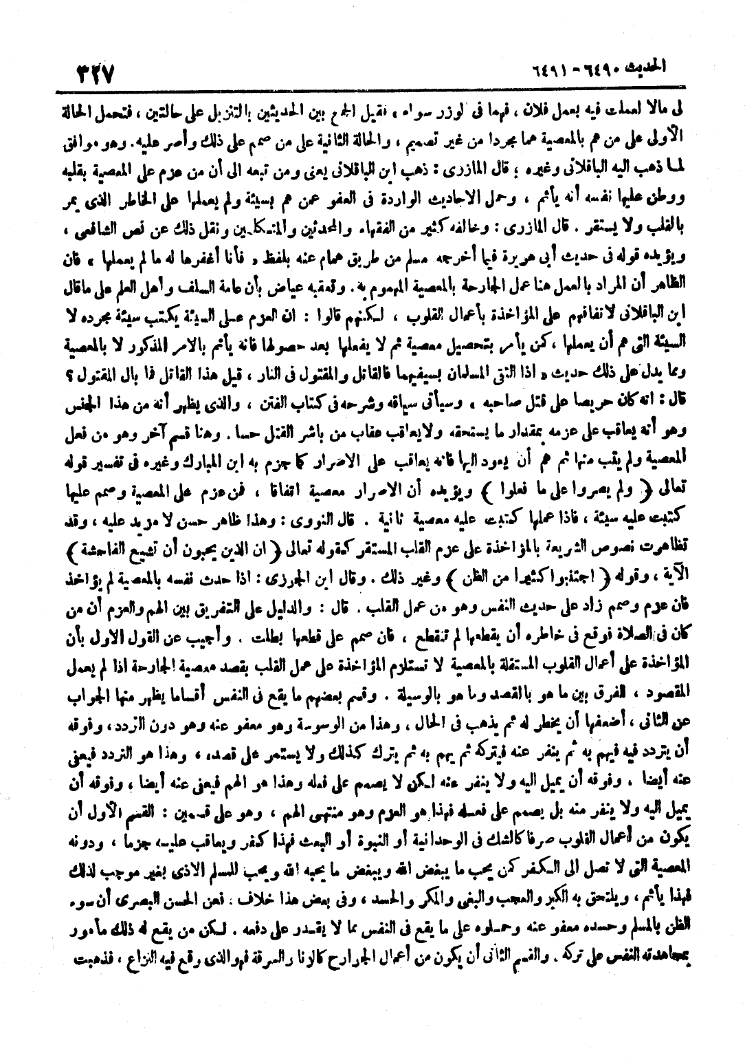 لِي مَالًا لَعَمِلْتُ فِيهِ بِعَمَلِ فُلَانٍ فَهُمَا فِي الْوِزْرِ سَوَاءٌ فَقِيلَ الْجَمْعُ بَيْنَ الْحَدِيثَيْنِ بِالتَّنْزِيلِ عَلَى حَالَتَيْنِ فَتُحْمَلُ الْحَالَةُ الْأُولَى عَلَى مَنْ هَمَّ بِالْمَعْصِيَةِ هَمًّا مُجَرَّدًا مِنْ غَيْرِ تَصْمِيمٍ وَالْحَالَةُ الثَّانِيَةُ عَلَى مَنْ صَمَّمَ عَلَى ذَلِكَ وَأَصَرَّ عَلَيْهِ وَهُوَ مُوَافِقٌ لِمَا ذَهَبَ إِلَيْهِ الباقلاني وَغَيره قَالَ الْمَازرِيّ ذهب بن الْبَاقِلَّانِيِّ يَعْنِي وَمَنْ تَبِعَهُ إِلَى أَنَّ مَنْ عَزَمَ عَلَى الْمَعْصِيَةِ بِقَلْبِهِ وَوَطَّنَ عَلَيْهَا نَفْسَهُ أَنَّهُ يَأْثَمُ وَحَمَلَ الْأَحَادِيثَ الْوَارِدَةَ فِي الْعَفْوِ عَمَّنْ هَمَّ بِسَيِّئَةٍ وَلَمْ يَعْمَلْهَا عَلَى الْخَاطِرِ الَّذِي يَمُرُّ بِالْقَلْبِ وَلَا يَسْتَقِرُّ قَالَ الْمَازِرِيُّ وَخَالَفَهُ كَثِيرٌ مِنَ الْفُقَهَاءِ وَالْمُحَدِّثِينَ وَالْمُتَكَلِّمِينَ وَنَقَلَ ذَلِكَ عَنْ نَصِّ الشَّافِعِيِّ وَيُؤَيِّدُهُ قَوْلُهُ فِي حَدِيثِ أَبِي هُرَيْرَةَ فِيمَا أَخْرَجَهُ مُسْلِمٌ مِنْ طَرِيقِ هَمَّامٍ عَنْهُ بِلَفْظِ فَأَنَا أَغْفِرُهَا لَهُ مَا لَمْ يَعْمَلْهَا فَإِنَّ الظَّاهِرَ أَنَّ الْمُرَادَ بِالْعَمَلِ هُنَا عَمَلُ الْجَارِحَةِ بِالْمَعْصِيَةِ الْمَهْمُومُ بِهِ وَتَعَقَّبَهُ عِيَاضٌ بِأَنَّ عَامَّةَ السَّلَفِ وَأَهْلَ الْعِلْمِ على مَا قَالَ بن الباقلاني لَا تفاقهم عَلَى الْمُؤَاخَذَةِ بِأَعْمَالِ الْقُلُوبِ لَكِنْهُمْ قَالُوا إِنَّ الْعَزْمَ عَلَى السَّيِّئَةِ يُكْتَبُ سَيِّئَةً مُجَرَّدَةً لَا السَّيِّئَةَ الَّتِي هَمَّ أَنْ يَعْمَلَهَا كَمَنْ يَأْمُرُ بِتَحْصِيلِ مَعْصِيَةٍ ثُمَّ لَا يَفْعَلُهَا بَعْدَ حُصُولِهَا فَإِنَّهُ يَأْثَمُ بِالْأَمْرِ الْمَذْكُورِ لَا بِالْمَعْصِيَةِ وَمِمَّا يَدُلُّ عَلَى ذَلِكَ حَدِيثُ إِذَا الْتَقَى الْمُسْلِمَانِ بِسَيْفَيْهِمَا فَالْقَاتِلُ وَالْمَقْتُولُ فِي النَّارِ قِيلَ هَذَا الْقَاتِلُ فَمَا بَالُ الْمَقْتُولِ قَالَ إِنَّهُ كَانَ حَرِيصًا عَلَى قَتْلِ صَاحِبِهِ وَسَيَأْتِي سِيَاقُهُ وَشَرْحُهُ فِي كِتَابِ الْفِتَنِ وَالَّذِي يَظْهَرُ أَنَّهُ مِنْ هَذَا الْجِنْسِ وَهُوَ أَنَّهُ يُعَاقَبُ عَلَى عَزْمِهِ بِمِقْدَارِ مَا يَسْتَحِقُّهُ وَلَا يُعَاقَبُ عِقَابَ مَنْ بَاشَرَ الْقَتْلَ حِسًّا وَهُنَا قِسْمٌ آخَرُ وَهُوَ مَنْ فَعَلَ الْمَعْصِيَةَ وَلَمْ يَتُبْ مِنْهَا ثُمَّ هَمَّ أَنْ يَعُودَ إِلَيْهَا فَإِنَّهُ يُعَاقَبُ عَلَى الاصرار كَمَا جزم بِهِ بن الْمُبَارَكِ وَغَيْرُهُ فِي تَفْسِيرِ قَوْلِهِ تَعَالَى وَلَمْ يصروا على مَا فعلوا وَيُؤَيِّدُهُ أَنَّ الْإِصْرَارَ مَعْصِيَةٌ اتِّفَاقًا فَمَنْ عَزَمَ عَلَى الْمَعْصِيَةِ وَصَمَّمَ عَلَيْهَا كُتِبَتْ عَلَيْهِ سَيِّئَةٌ فَإِذَا عَمِلَهَا كُتِبَتْ عَلَيْهِ مَعْصِيَةٌ ثَانِيَةٌ قَالَ النَّوَوِيُّ وَهَذَا ظَاهِرٌ حَسَنٌ لَا مَزِيدَ عَلَيْهِ وَقَدْ تَظَاهَرَتْ نُصُوصُ الشَّرِيعَةِ بِالْمُؤَاخَذَةِ عَلَى عَزْمِ الْقَلْبِ الْمُسْتَقِرِّ كَقَوْلِهِ تَعَالَى إِنَّ الَّذِينَ يُحِبُّونَ ان تشيع الْفَاحِشَة الْآيَة وَقَوله اجتنبوا كثيرا من الظَّن وَغير ذَلِك وَقَالَ بن الْجَوْزِيِّ إِذَا حَدَّثَ نَفْسَهُ بِالْمَعْصِيَةِ لَمْ يُؤَاخَذْ فَإِنْ عَزَمَ وَصَمَّمَ زَادَ عَلَى حَدِيثِ النَّفْسِ وَهُوَ مِنْ عَمَلِ الْقَلْبِ قَالَ وَالدَّلِيلُ عَلَى التَّفْرِيقِ بَيْنَ الْهَمِّ وَالْعَزْمِ أَنَّ مَنْ كَانَ فِي الصَّلَاةِ فَوَقَعَ فِي خَاطِرِهِ أَنْ يَقْطَعَهَا لَمْ تَنْقَطِعْ فَإِنْ صَمَّمَ عَلَى قَطْعِهَا بَطَلَتْ وَأُجِيبَ عَنِ الْقَوْلِ الْأَوَّلِ بِأَنَّ الْمُؤَاخَذَةَ عَلَى أَعْمَالِ الْقُلُوبِ الْمُسْتَقِلَّةِ بِالْمَعْص