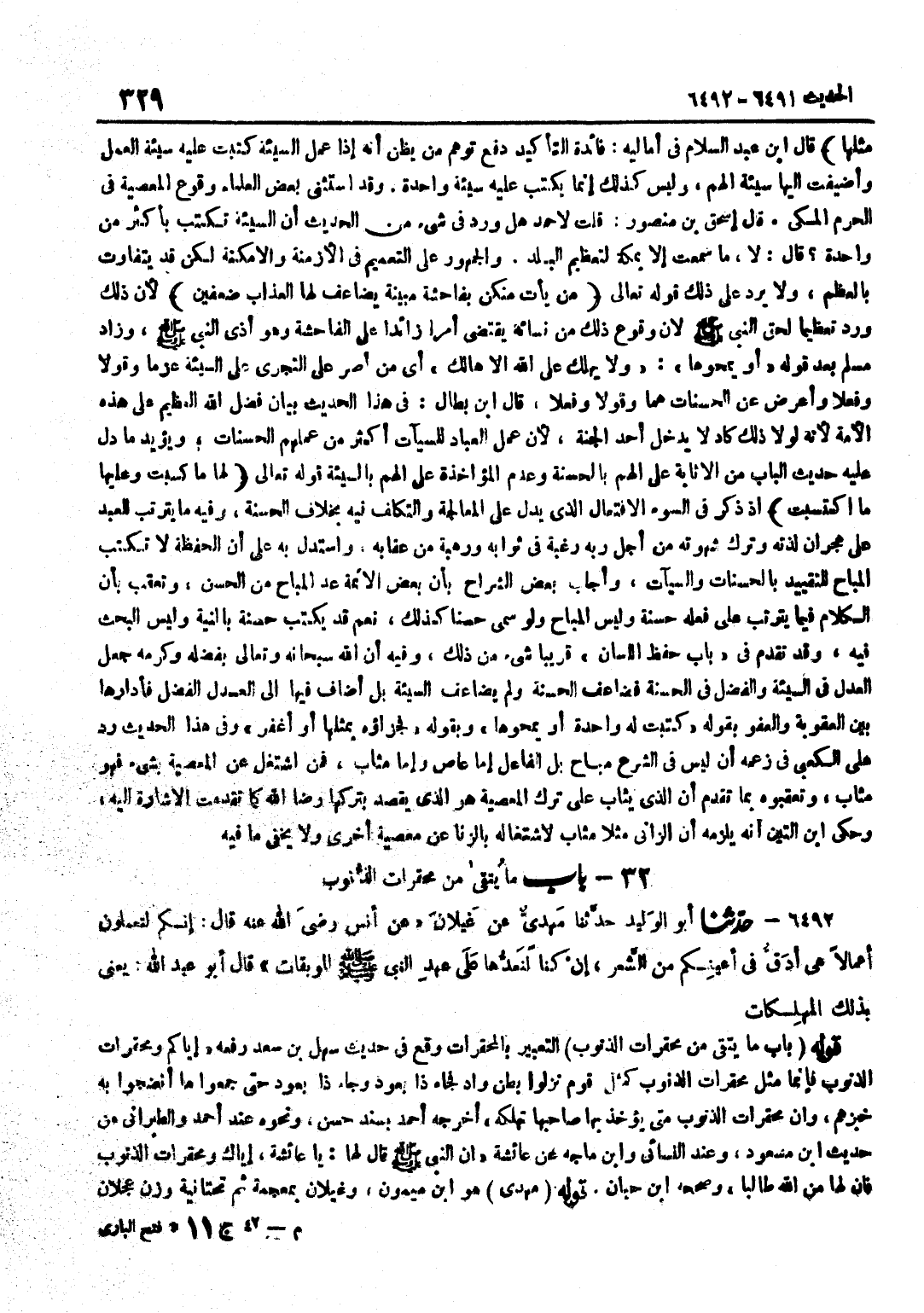 مثلهَا قَالَ بن عَبْدِ السَّلَامِ فِي أَمَالِيهِ فَائِدَةُ التَّأْكِيدِ دَفْعُ تَوَهُّمِ مَنْ يَظُنُّ أَنَّهُ إِذَا عَمِلَ السَّيِّئَةَ كُتِبَتْ عَلَيْهِ سَيِّئَةُ الْعَمَلِ وَأُضِيفَتْ إِلَيْهَا سَيِّئَةُ الْهَمِّ وَلَيْسَ كَذَلِكَ إِنَّمَا يُكْتَبُ عَلَيْهِ سَيِّئَةٌ وَاحِدَةٌ وَقَدِ اسْتَثْنَى بَعْضُ الْعُلَمَاءِ وُقُوعَ الْمَعْصِيَةِ فِي الْحَرَمِ الْمَكِّيِّ قَالَ إِسْحَاقُ بْنُ مَنْصُورٍ قُلْتُ لِأَحْمَدَ هَلْ وَرَدَ فِي شَيْءٍ مِنَ الْحَدِيثِ أَنَّ السَّيِّئَةَ تُكْتَبُ بِأَكْثَرَ مِنْ وَاحِدَةٍ قَالَ لَا مَا سَمِعْتُ إِلَّا بِمَكَّةَ لِتَعْظِيمِ الْبَلَدِ وَالْجُمْهُورُ عَلَى التَّعْمِيمِ فِي الْأَزْمِنَةِ وَالْأَمْكِنَةِ لَكِنْ قَدْ يَتَفَاوَتُ بِالْعِظَمِ وَلَا يَرِدُ عَلَى ذَلِكَ قَوْلُهُ تَعَالَى مَنْ يَأْتِ مِنْكُنَّ بِفَاحِشَةٍ مُبَيِّنَةٍ يُضَاعَفْ لَهَا الْعَذَاب ضعفين لِأَنَّ ذَلِكَ وَرَدَ تَعْظِيمًا لِحَقِّ النَّبِيِّ صَلَّى اللَّهُ عَلَيْهِ وَسَلَّمَ لِأَنَّ وُقُوعَ ذَلِكَ مِنْ نِسَائِهِ يَقْتَضِي أَمْرًا زَائِدًا عَلَى الْفَاحِشَةِ وَهُوَ أَذَى النَّبِيِّ صَلَّى اللَّهُ عَلَيْهِ وَسَلَّمَ وَزَادَ مُسْلِمٌ بَعْدَ قَوْلِهِ أَوْ يَمْحُوهَا وَلَا يَهْلِكُ عَلَى اللَّهِ إِلَّا هَالِكٌ أَيْ مَنْ أَصَرَّ عَلَى التَّجَرِّي عَلَى السَّيِّئَةِ عَزْمًا وَقَوْلًا وَفِعْلًا وَأَعْرَضَ عَنِ الْحَسَنَاتِ هَمًّا وَقَوْلًا وَفِعْلًا قَالَ بن بَطَّالٍ فِي هَذَا الْحَدِيثِ بَيَانُ فَضْلِ اللَّهِ الْعَظِيمِ عَلَى هَذِهِ الْأَمَةِ لِأَنَّهُ لَوْلَا ذَلِكَ كَادَ لَا يَدْخُلُ أَحَدٌ الْجَنَّةَ لِأَنَّ عَمَلَ الْعِبَادِ لِلسَّيِّئَاتِ أَكْثَرُ مِنْ عَمَلِهِمُ الْحَسَنَاتِ وَيُؤَيِّدُ مَا دَلَّ عَلَيْهِ حَدِيثُ الْبَابِ مِنَ الْإِثَابَةِ عَلَى الْهَمِّ بِالْحَسَنَةِ وَعَدَمِ الْمُؤَاخَذَةِ عَلَى الْهَمِّ بِالسَّيِّئَةِ قَوْلُهُ تَعَالَى لَهَا مَا كَسَبَتْ وَعَلَيْهَا مَا اكْتسبت إِذْ ذَكَرَ فِي السُّوءِ الِافْتِعَالَ الَّذِي يَدُلُّ عَلَى الْمُعَالَجَةِ وَالتَّكَلُّفِ فِيهِ بِخِلَافِ الْحَسَنَةِ وَفِيهِ مَا يَتَرَتَّبُ لِلْعَبْدِ عَلَى هِجْرَانِ لَذَّتِهِ وَتَرْكِ شَهْوَتِهِ مِنْ أَجْلِ رَبِّهِ رَغْبَةً فِي ثَوَابِهِ وَرَهْبَةً مِنْ عِقَابِهِ وَاسْتُدِلَّ بِهِ عَلَى أَنَّ الْحَفَظَةَ لَا تَكْتُبُ الْمُبَاحَ لِلتَّقْيِيدِ بِالْحَسَنَاتِ وَالسَّيِّئَاتِ وَأَجَابَ بَعْضُ الشُّرَّاحِ بِأَنَّ بَعْضَ الْأَئِمَّةِ عَدَّ الْمُبَاحَ مِنَ الْحَسَنِ وَتُعُقِّبَ بِأَنَّ الْكَلَامَ فِيمَا يَتَرَتَّبُ عَلَى فِعْلِهِ حَسَنَةٌ وَلَيْسَ الْمُبَاحُ وَلَوْ سُمِّيَ حَسَنًا كَذَلِكَ نَعَمْ قَدْ يُكْتَبُ حَسَنَةً بِالنِّيَّةِ وَلَيْسَ الْبَحْثُ فِيهِ وَقَدْ تَقَدَّمَ فِي بَابِ حِفْظِ اللِّسَانِ قَرِيبًا شَيْءٌ مِنْ ذَلِكَ وَفِيهِ أَنَّ اللَّهَ سُبْحَانَهُ وَتَعَالَى بِفَضْلِهِ وَكَرَمِهِ جَعَلَ الْعَدْلَ فِي السَّيِّئَةِ وَالْفَضْلَ فِي الْحَسَنَةِ فَضَاعَفَ الْحَسَنَةَ وَلَمْ يُضَاعِفِ السَّيِّئَةَ بَلْ أَضَافَ فِيهَا إِلَى الْعَدْلِ الْفَضْلَ فَأَدَارَهَا بَيْنَ الْعُقُوبَةِ وَالْعَفْوِ بِقَوْلِهِ كُتِبَتْ لَهُ وَاحِدَةٌ أَوْ يَمْحُوهَا وَبِقَوْلِهِ فَجَزَاؤُهُ بِمِثْلِهَا أَوْ أَغْفِرُ وَفِي هَذَا الْحَدِيثِ رَدٌّ عَلَى الْكَعْبِيِّ فِي زَعْمِهِ أَنْ لَيْسَ فِي الشَّرْعِ مُبَاحٌ بَلِ الْفَاعِلُ إِمَّا عَاصٍ وَإِمَّا مُثَابٌ فَمَنِ اشْتَغَلَ عَنِ الْمَعْصِيَةِ بِشَيْءٍ فَهُوَ مُثَابٌ وَتَعَقَّبُوهُ بِمَا تَقَدَّمَ أَنَّ الَّذِي يُثَابُ عَلَى تَرْكِ الْمَعْصِيَةِ هُوَ الَّذِي يَقْصِدُ بِتَرْكِهَا رِضَا اللَّهِ كَمَا تَقَدَّمَتِ الْإِشَارَةُ إِلَيْهِ وَ