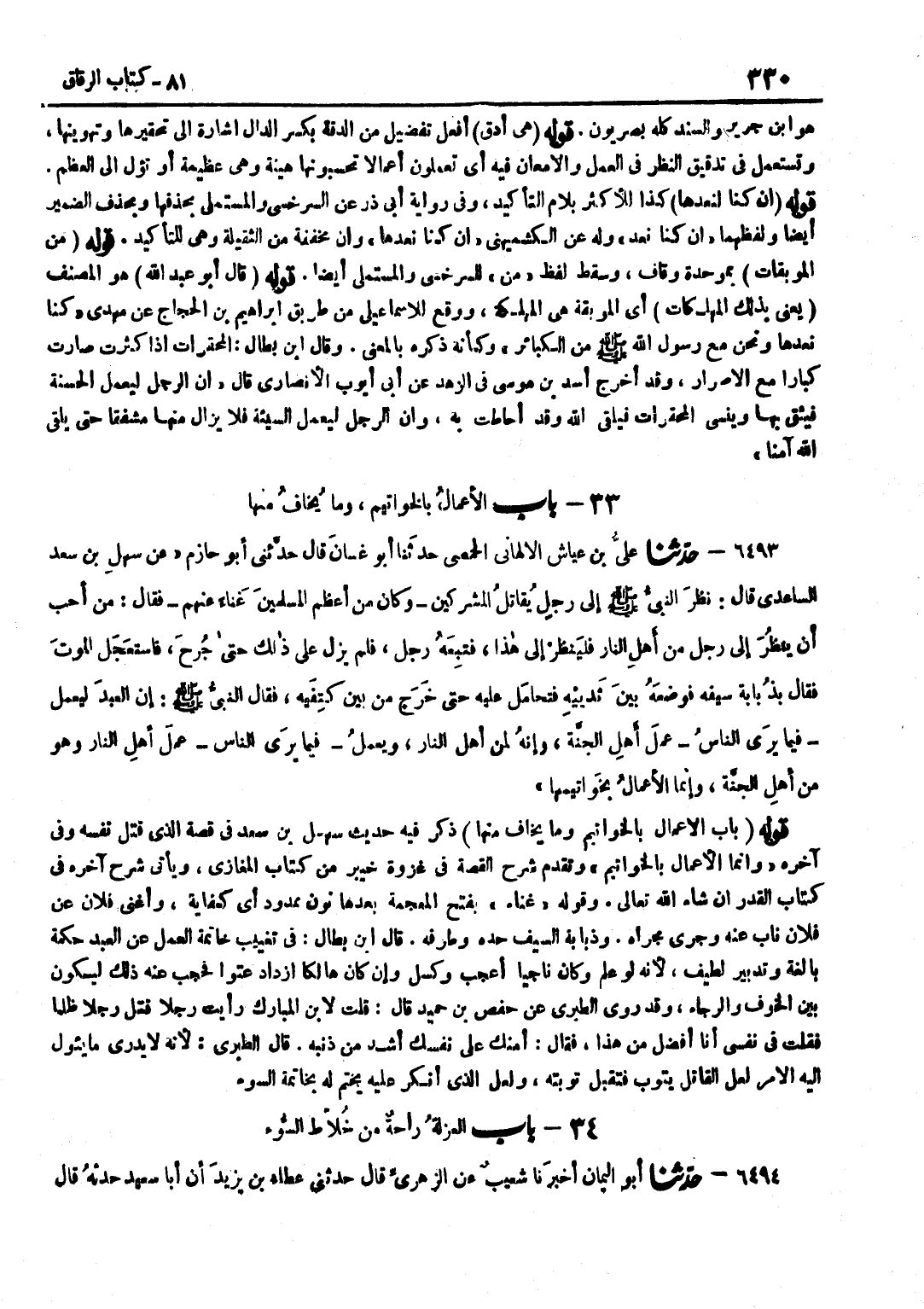 وَمَا يُخَافُ مِنْهَا ذَكَرَ فِيهِ حَدِيثَ سَهْلِ بْنِ سَعْدٍ فِي قِصَّةِ الَّذِي قَتَلَ نَفْسَهُ وَفِي آخِرِهِ وَإِنَّمَا الْأَعْمَالُ بِالْخَوَاتِيمِ وَتَقَدَّمَ شَرْحُ الْقِصَّةِ فِي غَزْوَةِ خَيْبَرَ مِنْ كِتَابِ الْمَغَازِي وَيَأْتِي شَرْحُ آخِرِهِ فِي كِتَابِ الْقَدَرِ إِنْ شَاءَ اللَّهُ تَعَالَى حَدِيثَ سَهْلِ بْنِ سَعْدٍ فِي قِصَّةِ الَّذِي قَتَلَ نَفْسَهُ وَفِي آخِرِهِ وَإِنَّمَا الْأَعْمَالُ بِالْخَوَاتِيمِ وَتَقَدَّمَ شَرْحُ الْقِصَّةِ فِي غَزْوَةِ خَيْبَرَ مِنْ كِتَابِ الْمَغَازِي وَيَأْتِي شَرْحُ آخِرِهِ فِي كِتَابِ الْقَدَرِ إِنْ شَاءَ اللَّهُ تَعَالَى وَقَوْلُهُ
