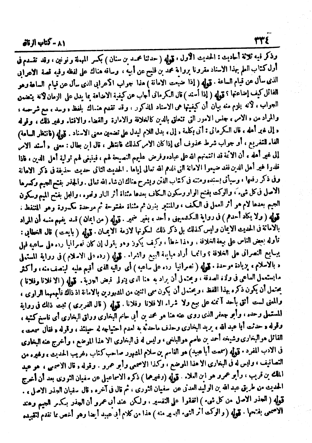 [6496] قَوْلُهُ حَدَّثَنَا مُحَمَّدُ بْنُ سِنَانٍ بِكَسْرِ الْمُهْمَلَةِ وَنُونَيْنِ وَقَدْ تَقَدَّمَ فِي أَوَّلِ كِتَابِ الْعِلْمِ بِهَذَا الْإِسْنَادِ مَقْرُونًا بِرِوَايَةِ مُحَمَّدِ بْنِ فُلَيْحٍ عَنْ أَبِيهِ وَسَاقَهُ هُنَاكَ عَلَى لَفْظِهِ وَفِيهِ قِصَّةُ الْأَعْرَابِيِّ الَّذِي سَأَلَ عَنْ قِيَامِ السَّاعَةِ قَوْلُهُ إِذَا ضُيِّعَتِ الْأَمَانَةُ هَذَا جَوَابُ الْأَعْرَابِيِّ الَّذِي سَأَلَ عَنْ قِيَامِ السَّاعَةِ وَهُوَ الْقَائِلُ كَيْفَ إِضَاعَتُهَا قَوْلُهُ إِذَا أُسْنِدَ قَالَ الْكِرْمَانِيُّ أَجَابَ عَنْ كَيْفِيَّةِ الْإِضَاعَةِ بِمَا يَدُلُّ عَلَى الزَّمَانِ لِأَنَّهُ يَتَضَمَّنُ الْجَوَابَ لِأَنَّهُ يَلْزَمُ مِنْهُ بَيَانُ أَنَّ كَيْفِيَّتَهَا هِيَ الْإِسْنَادُ الْمَذْكُورُ وَقَدْ تَقَدَّمَ هُنَاكَ بِلَفْظِ وُسِّدَ مَعَ شَرْحِهِ وَالْمُرَادُ مِنَ الْأَمْرِ جِنْسُ الْأُمُورِ الَّتِي تَتَعَلَّقُ بِالدِّينِ كَالْخِلَافَةِ وَالْإِمَارَةِ وَالْقَضَاءِ وَالْإِفْتَاءِ وَغَيْرِ ذَلِكَ وَقَوْلُهُ إِلَى غَيْرِ أَهْلِهِ قَالَ الْكِرْمَانِيُّ أَتَى بِكَلِمَةِ إِلَى بَدَلَ اللَّامِ لِيَدُلَّ عَلَى تَضْمِينِ مَعْنَى الْإِسْنَادِ قَوْلُهُ فَانْتَظِرِ السَّاعَةَ الْفَاءُ لِلتَّفْرِيعِ أَوْ جَوَابُ شَرْطٍ مَحْذُوفٍ أَيْ إِذَا كَانَ الْأَمْرُ كَذَلِكَ فانتظر قَالَ بن بَطَّالٍ مَعْنَى أُسْنِدَ الْأَمْرُ إِلَى غَيْرِ أَهْلِهِ أَنَّ الْأَئِمَّةَ قَدِ ائْتَمَنَهُمُ اللَّهُ عَلَى عِبَادِهِ وَفَرَضَ عَلَيْهِمُ النَّصِيحَةَ لَهُمْ فَيَنْبَغِي لَهُمْ تَوْلِيَةُ أَهْلِ الدِّينِ فَإِذَا قَلَّدُوا غَيْرَ أَهْلِ الدِّينِ فَقَدْ ضَيَّعُوا الْأَمَانَةَ الَّتِي قَلَّدَهُمُ اللَّهُ تَعَالَى إِيَّاهَا الْحَدِيثُ الثَّانِي حَدِيثُ حُذَيْفَةَ فِي ذِكْرِ الْأَمَانَةِ وَفِي ذِكْرِ رَفْعِهَا وَسَيَأْتِي بِسَنَدِهِ وَمَتْنِهِ فِي كِتَابِ الْفِتَنِ وَيُشْرَحُ هُنَاكَ إِنْ شَاءَ اللَّهُ تَعَالَى وَالْجَذْرُ بِفَتْحِ الْجِيمِ وَكَسْرِهَا الْأَصْلُ فِي كُلِّ شَيْءٍ وَالْوَكْتُ بِفَتْحِ الْوَاوِ وَسُكُونِ الْكَافِ بَعْدَهَا مُثَنَّاةٌ أَثَرُ النَّارِ وَنَحْوُهُ وَالْمَجْلُ بِفَتْحِ الْمِيمِ وَسُكُونِ الْجِيمِ بَعْدَهَا لَامٌ هُوَ أَثَرُ الْعَمَلِ فِي الْكَفِّ وَالْمُنْتَبِرُ بِنُونٍ ثُمَّ مُثَنَّاةٍ مَفْتُوحَةٍ ثُمَّ مُوَحَّدَةٍ مَكْسُورَةٍ وَهُوَ الْمُتَنَفِّطُ