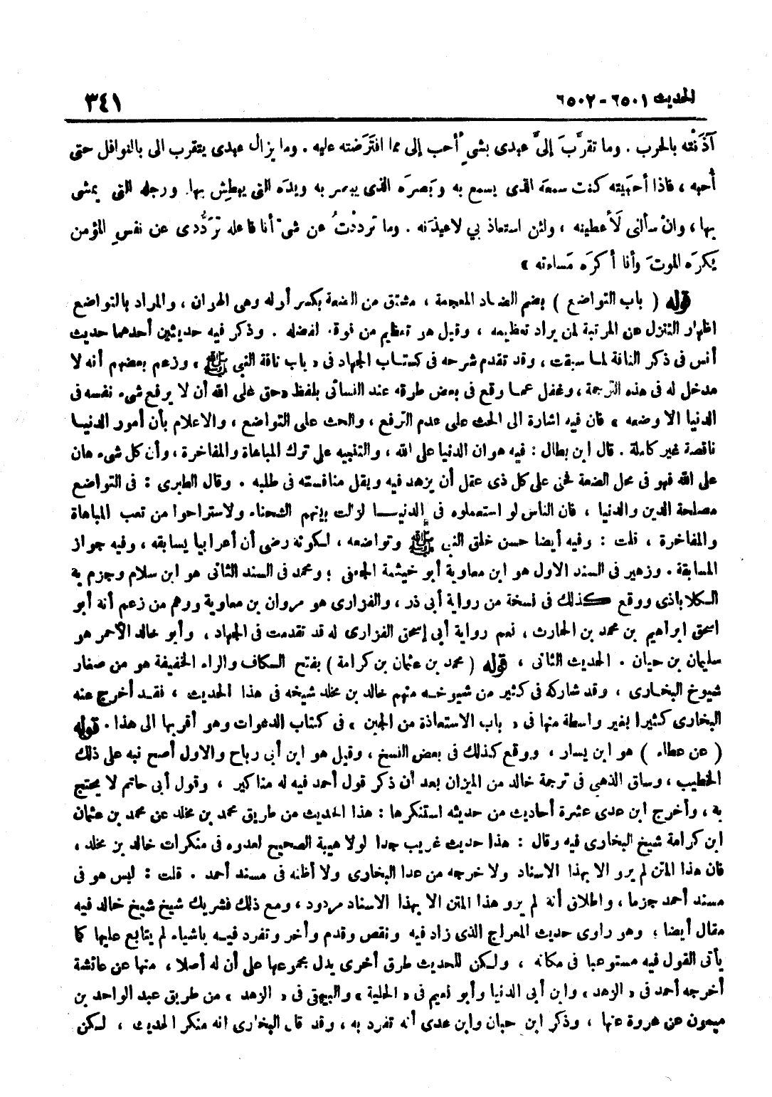 [6502] قَوْلُهُ مُحَمَّدُ بْنُ عُثْمَانَ بْنِ كَرَامَةَ بِفَتْحِ الْكَافِ وَالرَّاءِ الْخَفِيفَةِ هُوَ مِنْ صِغَارِ شُيُوخِ الْبُخَارِيِّ وَقَدْ شَارَكَهُ فِي كَثِيرٍ مِنْ شُيُوخِهِ مِنْهُمْ خَالِدُ بْنُ مَخْلَدٍ شَيْخُهُ فِي هَذَا الْحَدِيثِ فَقَدْ أَخْرَجَ عَنْهُ الْبُخَارِيُّ كَثِيرًا بِغَيْرِ وَاسِطَةٍ مِنْهَا فِي بَابِ الِاسْتِعَاذَةِ مِنَ الْجُبْنِ فِي كِتَابِ الدَّعَوَاتِ وَهُوَ أَقْرَبُهَا إِلَى هَذَا قَوْلُهُ عَنْ عَطاء هُوَ بن يَسَارٍ وَوَقَعَ كَذَلِكَ فِي بَعْضِ النَّسْخِ وَقِيلَ هُوَ بن أَبِي رَبَاحٍ وَالْأَوَّلُ أَصَحُّ نَبَّهَ عَلَى ذَلِكَ الْخَطِيبُ وَسَاقَ الذَّهَبِيُّ فِي تَرْجَمَةِ خَالِدٍ مِنَ الْمِيزَانِ بَعْدَ أَنْ ذَكَرَ قَوْلَ أَحْمَدَ فِيهِ لَهُ مَنَاكِيرُ وَقَوْلُ أَبِي حَاتِمٍ لَا يُحْتَجُّ بِهِ وَأخرج بن عَدِيٍّ عَشَرَةَ أَحَادِيثَ مِنْ حَدِيثِهِ اسْتَنْكَرَهَا هَذَا الْحَدِيثُ مِنْ طَرِيقِ مُحَمَّدِ بْنِ مَخْلَدٍ عَنْ مُحَمَّدِ بْنِ عُثْمَانَ بْنِ كَرَامَةَ شَيْخِ الْبُخَارِيِّ فِيهِ وَقَالَ هَذَا حَدِيثٌ غَرِيبٌ جِدًّا لَوْلَا هَيْبَةُ الصَّحِيحِ لَعَدُّوهُ فِي مُنْكَرَاتِ خَالِدِ بْنِ مَخْلَدٍ فَإِنَّ هَذَا الْمَتْنَ لَمْ يُرْوَ إِلَّا بِهَذَا الْإِسْنَادِ وَلَا خَرَّجَهُ مَنْ عَدَا الْبُخَارِيَّ وَلَا أَظُنُّهُ فِي مُسْنَدِ أَحْمَدَ قُلْتُ لَيْسَ هُوَ فِي مُسْنَدِ أَحْمَدَ جَزْمًا وَإِطْلَاقُ أَنَّهُ لَمْ يُرْوَ هَذَا الْمَتْنُ إِلَّا بِهَذَا الْإِسْنَادِ مَرْدُودٌ وَمَعَ ذَلِكَ فَشَرِيكٌ شَيْخُ شَيْخِ خَالِدٍ فِيهِ مَقَالٌ أَيْضًا وَهُوَ رَاوِي حَدِيثِ الْمِعْرَاجِ الَّذِي زَادَ فِيهِ وَنَقَصَ وَقَدَّمَ وَأَخَّرَ وَتَفَرَّدَ فِيهِ بِأَشْيَاءَ لَمْ يُتَابَعْ عَلَيْهَا كَمَا يَأْتِي الْقَوْلُ فِيهِ مُسْتَوْعَبًا فِي مَكَانِهِ وَلَكِنْ لِلْحَدِيثِ طُرُقٌ أُخْرَى يَدُلُّ مَجْمُوعُهَا عَلَى أَنْ لَهُ أَصْلًا مِنْهَا عَنْ عَائِشَةَ أَخْرَجَهُ أَحْمَدُ فِي الزّهْد وبن أَبِي الدُّنْيَا وَأَبُو نُعَيْمٍ فِي الْحِلْيَةِ وَالْبَيْهَقِيُّ فِي الزُّهْدِ مِنْ طَرِيقِ عَبْدِ الْوَاحِدِ بْنِ مَيْمُون عَن عُرْوَة عَنْهَا وَذكر بن حبَان وبن عَدِيٍّ أَنَّهُ تَفَرَّدَ بِهِ وَقَدْ قَالَ الْبُخَارِيُّ إِنَّهُ مُنْكَرُ الْحَدِيثِ لَكِنْ
