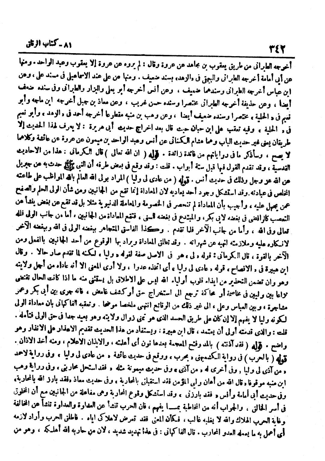 أَخْرَجَهُ الطَّبَرَانِيُّ مِنْ طَرِيقِ يَعْقُوبَ بْنِ مُجَاهِدٍ عَنْ عُرْوَةَ وَقَالَ لَمْ يَرْوِهِ عَنْ عُرْوَةَ إِلَّا يَعْقُوبُ وَعَبْدُ الْوَاحِدِ وَمِنْهَا عَنْ أَبِي أُمَامَةَ أَخْرَجَهُ الطَّبَرَانِيُّ وَالْبَيْهَقِيُّ فِي الزُّهْدِ بِسَنَدٍ ضَعِيفٍ وَمِنْهَا عَنْ عَلِيٍّ عِنْدَ الْإِسْمَاعِيلِيِّ فِي مُسْند عَليّ وَعَن بن عَبَّاسٍ أَخْرَجَهُ الطَّبَرَانِيُّ وَسَنَدُهُمَا ضَعِيفٌ وَعَنْ أَنَسٍ أَخْرَجَهُ أَبُو يَعْلَى وَالْبَزَّارُ وَالطَّبَرَانِيُّ وَفِي سَنَدِهِ ضَعْفٌ أَيْضًا وَعَنْ حُذَيْفَةَ أَخْرَجَهُ الطَّبَرَانِيُّ مُخْتَصَرًا وَسَنَدُهُ حَسَنٌ غَرِيبٌ وَعَنْ مُعَاذِ بْنِ جَبَلٍ أخرجه بن مَاجَهْ وَأَبُو نُعَيْمٍ فِي الْحِلْيَةِ مُخْتَصَرًا وَسَنَدُهُ ضَعِيفٌ أَيْضًا وَعَنْ وَهْبِ بْنِ مُنَبِّهٍ مَقْطُوعًا أَخْرَجَهُ أَحْمَدُ فِي الزُّهْدِ وَأَبُو نُعَيْمٍ فِي الْحِلْيَةِ وَفِيه تعقب على بن حِبَّانَ حَيْثُ قَالَ بَعْدَ إِخْرَاجِ حَدِيثِ أَبِي هُرَيْرَةَ لَا يُعْرَفُ لِهَذَا الْحَدِيثِ إِلَّا طَرِيقَانِ يَعْنِي غَيْرَ حَدِيثِ الْبَابِ وَهُمَا هِشَامٌ الْكِنَانِيُّ عَنْ أَنَسٍ وَعَبْدُ الْوَاحِدِ بْنُ مَيْمُونٍ عَنْ عُرْوَةَ عَنْ عَائِشَةَ وَكِلَاهُمَا لَا يَصِحُّ وَسَأَذْكُرُ مَا فِي رِوَايَاتِهِمْ مِنْ فَائِدَةٍ زَائِدَةٍ قَوْلُهُ إِنَّ اللَّهَ تَعَالَى قَالَ الْكِرْمَانِيُّ هَذَا مِنَ الْأَحَادِيثِ الْقُدْسِيَّةِ وَقَدْ تَقَدَّمَ الْقَوْلُ فِيهَا قَبْلَ سِتَّةِ أَبْوَابٍ قُلْتُ وَقَدْ وَقَعَ فِي بَعْضِ طُرُقِهِ أَنَّ النَّبِيَّ صَلَّى اللَّهُ عَلَيْهِ وَسَلَّمَ حَدَّثَ بِهِ عَنْ جِبْرِيلَ عَنِ اللَّهِ عَزَّ وَجَلَّ وَذَلِكَ فِي حَدِيثِ أَنَسٍ قَوْلُهُ مِنْ عَادَى لِي وَلِيًّا الْمُرَادُ بِوَلِيِّ اللَّهِ الْعَالِمُ بِاللَّهِ الْمُوَاظِبُ عَلَى طَاعَتِهِ الْمُخْلِصُ فِي عِبَادَتِهِ وَقَدِ اسْتُشْكِلَ وُجُودُ أَحَدٍ يُعَادِيهِ لِأَنَّ الْمُعَادَاةَ إِنَّمَا تَقَعُ مِنَ الْجَانِبَيْنِ وَمَنْ شَأْنِ الْوَلِيِّ الْحِلْمُ وَالصَّفْحُ عَمَّنْ يَجْهَلُ عَلَيْهِ وَأُجِيبَ بِأَنَّ الْمُعَادَاةَ لَمْ تَنْحَصِرْ فِي الْخُصُومَةِ وَالْمُعَامَلَةِ الدُّنْيَوِيَّةِ مَثَلًا بَلْ قَدْ تَقَعُ عَنْ بُغْضٍ يَنْشَأُ عَنِ التَّعَصُّبِ كَالرَّافِضِيِّ فِي بُغْضِهِ لِأَبِي بَكْرٍ وَالْمُبْتَدِعِ فِي بُغْضِهِ لِلسُّنِّيِّ فَتَقَعُ الْمُعَادَاةُ مِنَ الْجَانِبَيْنِ أَمَّا مِنْ جَانِبِ الْوَلِيِّ فَلِلَّهِ تَعَالَى وَفِي اللَّهِ وَأَمَّا مِنْ جَانِبِ الْآخَرِ فَلِمَا تَقَدَّمَ وَكَذَا الْفَاسِقُ الْمُتَجَاهِرُ بِبُغْضِهِ الْوَلِيَّ فِي اللَّهِ وَبِبُغْضِهِ الْآخَرَ لِإِنْكَارِهِ عَلَيْهِ وَمُلَازَمَتِهِ لِنَهْيِهِ عَنْ شَهَوَاتِهِ وَقَدْ تُطْلَقُ الْمُعَادَاةُ وَيُرَادُ بِهَا الْوُقُوعُ مِنْ أَحَدِ الْجَانِبَيْنِ بِالْفِعْلِ وَمِنَ الْآخَرِ بِالْقُوَّةِ قَالَ الْكِرْمَانِيُّ قَوْلُهُ لِي هُوَ فِي الْأَصْلِ صِفَةٌ لِقولِهِ وَلِيًّا لَكِنَّهُ لَمَّا تَقَدَّمَ صَار حَالا وَقَالَ بن هُبَيْرَةَ فِي الْإِفْصَاحِ قَوْلُهُ عَادَى لِي وَلِيًّا أَيِ اتَّخَذَهُ عَدُوًّا وَلَا أَرَى الْمَعْنَى إِلَّا انه عَادَاهُ من أجل ولَايَته وَهُوَ وان تَضَمَّنَ التَّحْذِيرَ مِنْ إِيذَاءِ قُلُوبِ أَوْلِيَاءِ اللَّهِ لَيْسَ عَلَى الْإِطْلَاقِ بَلْ يُسْتَثْنَى مِنْهُ مَا إِذَا كَانَتِ الْحَالُ تَقْتَضِي نِزَاعًا بَيْنَ وَلِيَّيْنِ فِي مُخَاصَمَةٍ أَوْ مُحَاكَمَةٍ تَرْجِعُ إِلَى اسْتِخْرَاجِ حَقٍّ أَوْ كَشْفِ غَامِضٍ فَإِنَّهُ جَرَى بَيْنَ أَبِي بَكْرٍ وَعُمَرَ مُشَاجَرَةٌ وَبَيْنَ الْعَبَّاسِ وَعَلِيٍّ إِلَى غَيْرِ ذَلِكَ مِنَ الْوَقَائِعِ انْتَهَى مُلَخَّصًا مُوَضَ