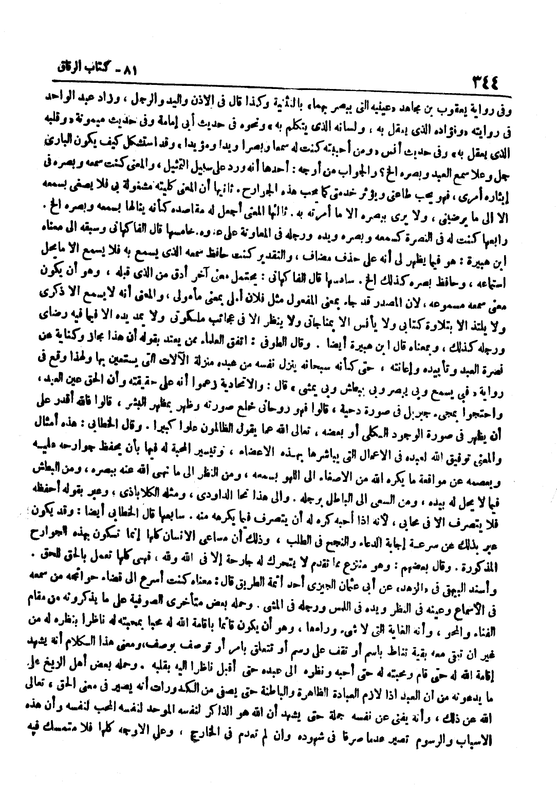 وَفِي رِوَايَةِ يَعْقُوبَ بْنِ مُجَاهِدٍ عَيْنَيْهِ الَّتِي يُبْصِرُ بِهِمَا بِالتَّثْنِيَةِ وَكَذَا قَالَ فِي الْأُذُنِ وَالْيَدِ وَالرِّجْلِ وَزَادَ عَبْدُ الْوَاحِدِ فِي رِوَايَتِهِ وَفُؤَادَهُ الَّذِي يَعْقِلُ بِهِ وَلِسَانَهُ الَّذِي يَتَكَلَّمُ بِهِ وَنَحْوُهُ فِي حَدِيثِ أَبِي أُمَامَةَ وَفِي حَدِيثِ مَيْمُونَةَ وَقَلْبَهُ الَّذِي يَعْقِلُ بِهِ وَفِي حَدِيثِ أَنَسٍ وَمَنْ أَحْبَبْتُهُ كُنْتُ لَهُ سَمْعًا وَبَصَرًا وَيَدًا وَمُؤَيِّدًا وَقَدِ اسْتُشْكِلَ كَيْفَ يَكُونُ الْبَارِي جَلَّ وَعَلَا سَمْعَ الْعَبْدِ وَبَصَرَهُ إِلَخْ وَالْجَوَابُ مِنْ أَوْجُهٍ أَحَدُهَا أَنَّهُ وَرَدَ عَلَى سَبِيلِ التَّمْثِيلِ وَالْمَعْنَى كُنْتُ سَمْعَهُ وَبَصَرَهُ فِي إِيثَارِهِ أَمْرِي فَهُوَ يُحِبُّ طَاعَتِي وَيُؤْثِرُ خِدْمَتِي كَمَا يُحِبُّ هَذِهِ الْجَوَارِحَ ثَانِيهَا أَنَّ الْمَعْنَى كُلِّيَّتَهُ مَشْغُولَةٌ بِي فَلَا يُصْغِي بِسَمْعِهِ إِلَّا إِلَى مَا يُرْضِينِي وَلَا يَرَى بِبَصَرِهِ إِلَّا مَا أَمرته بِهِ ثَالِثهَا الْمَعْنى أجعَل لَهُ مَقَاصِدَهُ كَأَنَّهُ يَنَالُهَا بِسَمْعِهِ وَبَصَرِهِ إِلَخْ رَابِعُهَا كُنْتُ لَهُ فِي النُّصْرَةِ كَسَمْعِهِ وَبَصَرِهِ وَيَدِهِ وَرِجْلِهِ فِي الْمُعَاوَنَةِ عَلَى عَدُوِّهِ خَامِسُهَا قَالَ الْفَاكِهَانِيّ وَسَبقه إِلَى مَعْنَاهُ بن هُبَيْرَةَ هُوَ فِيمَا يَظْهَرُ لِي أَنَّهُ عَلَى حَذْفِ مُضَافٍ وَالتَّقْدِيرُ كُنْتُ حَافِظَ سَمْعِهِ الَّذِي يَسْمَعُ بِهِ فَلَا يَسْمَعُ إِلَّا مَا يَحِلُّ اسْتِمَاعُهُ وَحَافِظُ بَصَرِهِ كَذَلِكَ إِلَخْ سَادِسُهَا قَالَ الْفَاكِهَانِيُّ يَحْتَمِلُ مَعْنًى آخَرَ أَدَقَّ مِنَ الَّذِي قَبْلَهُ وَهُوَ أَنْ يَكُونَ مَعْنَى سَمْعِهِ مَسْمُوعَهُ لِأَنَّ الْمَصْدَرَ قَدْ جَاءَ بِمَعْنَى الْمَفْعُولِ مِثْلُ فُلَانٌ أَمَلِي بِمَعْنَى مَأْمُولِي وَالْمَعْنَى أَنَّهُ لَا يَسْمَعُ إِلَّا ذِكْرِي وَلَا يَلْتَذُّ إِلَّا بِتِلَاوَةِ كِتَابِي وَلَا يَأْنَسُ إِلَّا بِمُنَاجَاتِي وَلَا يَنْظُرُ إِلَّا فِي عَجَائِبِ مَلَكُوتِي وَلَا يَمُدُّ يَدَهُ إِلَّا فِيمَا فِيهِ رِضَايَ وَرِجْلَهُ كَذَلِكَ وَبِمَعْنَاهُ قَالَ بن هُبَيْرَةَ أَيْضًا وَقَالَ الطُّوفِيُّ اتَّفَقَ الْعُلَمَاءُ مِمَّنْ يُعْتَدُّ بِقَوْلِهِ أَنَّ هَذَا مَجَازٌ وَكِنَايَةٌ عَنْ نُصْرَةِ الْعَبْدِ وَتَأْيِيدِهِ وَإِعَانَتِهِ حَتَّى كَأَنَّهُ سُبْحَانَهُ يُنَزِّلُ نَفْسَهُ مِنْ عَبْدِهِ مَنْزِلَةَ الْآلَاتِ الَّتِي يَسْتَعِينُ بِهَا وَلِهَذَا وَقَعَ فِي رِوَايَةٍ فَبِي يَسْمَعُ وَبِي يُبْصِرُ وَبِي يَبْطِشُ وَبِي يَمْشِي قَالَ وَالِاتِّحَادِيَّةُ زَعَمُوا أَنَّهُ عَلَى حَقِيقَتِهِ وَأَنَّ الْحَقَّ عَيْنُ الْعَبْدِ وَاحْتَجُّوا بِمَجِيءِ جِبْرِيلَ فِي صُورَةِ دِحْيَةَ قَالُوا فَهُوَ رُوحَانِيٌّ خَلَعَ صُورَتَهُ وَظَهَرَ بِمَظْهَرِ الْبَشَرِ قَالُوا فَاللَّهُ أَقْدَرُ عَلَى أَنْ يَظْهَرَ فِي صُورَةِ الْوُجُودِ الْكُلِّيِّ أَوْ بَعْضِهِ تَعَالَى اللَّهُ عَمَّا يَقُولُ الظَّالِمُونَ عُلُوًّا كَبِيرًا وَقَالَ الْخَطَّابِيُّ هَذِهِ أَمْثَالٌ وَالْمَعْنَى تَوْفِيقُ اللَّهِ لِعَبْدِهِ فِي الْأَعْمَالِ الَّتِي يُبَاشِرُهَا بِهَذِهِ الْأَعْضَاءِ وَتَيْسِيرُ الْمَحَبَّةِ لَهُ فِيهَا بِأَنْ يَحْفَظَ جَوَارِحَهُ عَلَيْهِ وَيَعْصِمَهُ عَنْ مُوَاقَعَةِ مَا يَكْرَهُ اللَّهُ مِنَ الْإِصْغَاءِ إِلَى اللَّهْوِ بِسَمْعِهِ وَمِنَ النَّظَرِ إِلَى مَا نَهَى اللَّهُ عَنْهُ بِبَصَرِهِ وَمِنَ الْبَطْشِ فِيمَا لَا يَحِلُّ لَهُ بِيَدِهِ وَمِنَ السَّعْيِ إِلَى الْبَاطِلِ بِرِجْلِهِ وَإِلَى هَذَا نَحَا الدَّاوُدِيُّ وَمِثْلُهُ الْكَلَابَاذِيُّ وَعَ
