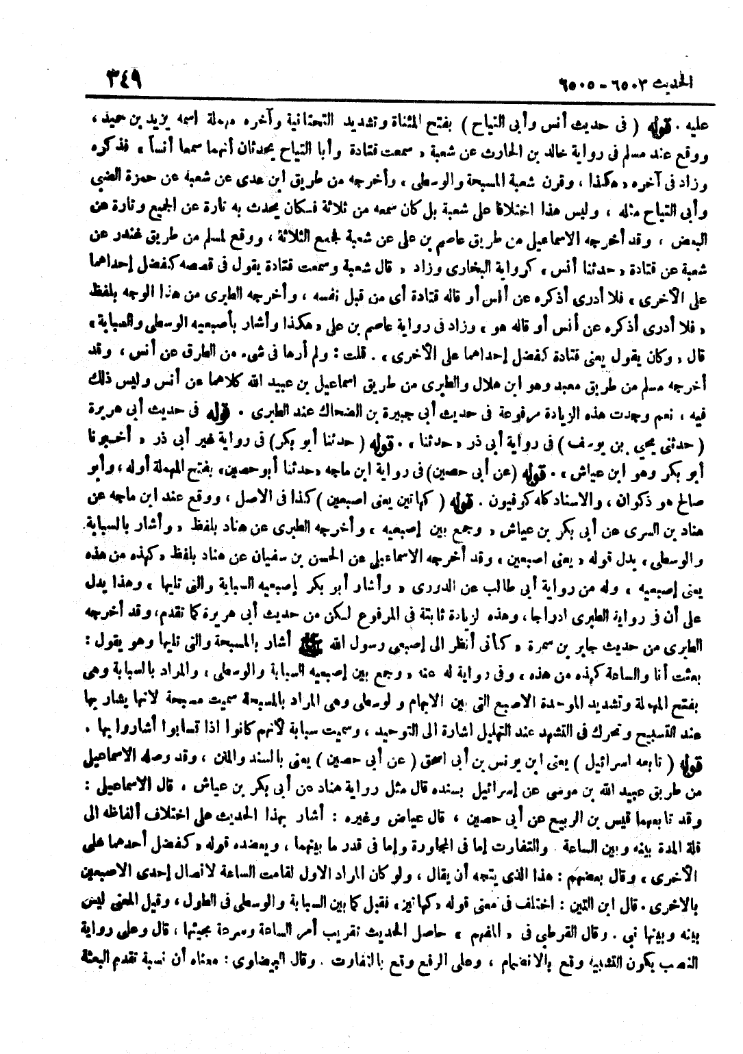 [6504] قَوْلُهُ فِي حَدِيثِ أَنَسٍ وَأَبِي التَّيَّاحِ بِفَتْحِ الْمُثَنَّاةِ وَتَشْدِيدِ التَّحْتَانِيَّةِ وَآخِرَهُ مُهْمَلَةٌ اسْمُهُ يَزِيدُ بْنُ حُمَيْدٍ وَوَقَعَ عِنْدَ مُسْلِمٍ فِي رِوَايَةِ خَالِدِ بْنِ الْحَارِثِ عَنْ شُعْبَةَ سَمِعْتُ قَتَادَةَ وَأَبَا التَّيَّاحِ يُحَدِّثَانِ أَنَّهُمَا سَمِعَا أَنَسًا فَذَكَرَهُ وَزَادَ فِي آخِرِهِ هَكَذَا وَقَرَنَ شُعْبَةُ المسبحة وَالْوُسْطَى وَأخرجه من طَرِيق بن عَدِيٍّ عَنْ شُعْبَةَ عَنْ حَمْزَةَ الضَّبِّيِّ وَأَبِي التَّيَّاحِ مِثْلَهُ وَلَيْسَ هَذَا اخْتِلَافًا عَلَى شُعْبَةَ بَلْ كَانَ سَمِعَهُ مِنْ ثَلَاثَةٍ فَكَانَ يُحَدِّثُ بِهِ تَارَةً عَنِ الْجَمِيعِ وَتَارَةً عَنِ الْبَعْضِ وَقَدْ أَخْرَجَهُ الْإِسْمَاعِيلِيِّ مِنْ طَرِيقِ عَاصِمِ بْنِ عَلِيٍّ عَنْ شُعْبَةَ فَجَمَعَ الثَّلَاثَةَ وَوَقَعَ لِمُسْلِمٍ مِنْ طَرِيقِ غُنْدَرٍ عَنْ شُعْبَةَ عَنْ قَتَادَةَ حَدَّثَنَا أَنَسٌ كَرِوَايَةِ الْبُخَارِيِّ وَزَادَ قَالَ شُعْبَةُ وَسَمِعْتُ قَتَادَةَ يَقُولُ فِي قَصَصِهِ كَفَضْلِ إِحْدَاهُمَا عَلَى الْأُخْرَى فَلَا أَدْرِي أَذَكَرَهُ عَنْ أَنَسٍ أَوْ قَالَهُ قَتَادَةُ أَيْ مِنْ قِبَلِ نَفْسِهِ وَأَخْرَجَهُ الطَّبَرِيُّ مِنْ هَذَا الْوَجْهِ بِلَفْظِ فَلَا أَدْرِي أَذَكَرَهُ عَنْ أَنَسٍ أَوْ قَالَهُ هُوَ وَزَادَ فِي رِوَايَةِ عَاصِمِ بْنِ عَلِيٍّ هَكَذَا وَأَشَارَ بِأُصْبُعَيْهِ الْوُسْطَى وَالسَّبَّابَةِ قَالَ وَكَانَ يَقُولُ يَعْنِي قَتَادَةَ كَفَضْلِ إِحْدَاهُمَا عَلَى الْأُخْرَى قُلْتُ وَلَمْ أَرَهَا فِي شَيْءٍ مِنَ الطُّرُقِ عَنْ أَنَسٍ وَقَدْ أَخْرَجَهُ مُسْلِمٌ مِنْ طَرِيقِ مَعْبَدٍ وَهُوَ بن هِلَالٍ وَالطَّبَرِيُّ مِنْ طَرِيقِ إِسْمَاعِيلَ بْنِ عُبَيْدِ اللَّهِ كِلَاهُمَا عَنْ أَنَسٍ وَلَيْسَ ذَلِكَ فِيهِ نَعَمْ وَجَدْتُ هَذِهِ الزِّيَادَةَ مَرْفُوعَةً فِي حَدِيثِ أَبِي جَبِيرَةَ بْنِ الضَّحَّاكِ عِنْدَ الطَّبَرِيِّ قَوْلُهُ فِي حَدِيثِ أَبِي هُرَيْرَةَ