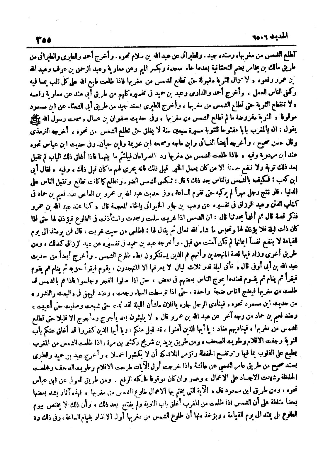 تطلع الشَّمْسُ مِنْ مَغْرِبِهَا وَسَنَدُهُ جَيِّدٌ وَلِلطَّبَرَانِيِّ عَنْ عَبْدِ اللَّهِ بْنِ سَلَامٍ نَحْوُهُ وَأَخْرَجَ أَحْمَدُ وَالطَّبَرِيُّ وَالطَّبَرَانِيُّ مِنْ طَرِيقِ مَالِكِ بْنِ يُخَامِرَ بِضَمِّ التَّحْتَانِيَّةِ بَعْدَهَا خَاءٌ مُعْجَمَةٌ وَبِكَسْرِ الْمِيمِ وَعَنْ مُعَاوِيَةَ وَعَبْدِ الرَّحْمَنِ بْنِ عَوْفٍ وَعَبْدِ اللَّهِ بْنِ عَمْرٍو رَفَعُوهُ لَا تَزَالُ التَّوْبَةُ مَقْبُولَةً حَتَّى تَطْلُعَ الشَّمْسُ مِنْ مَغْرِبِهَا فَإِذَا طَلَعَتْ طَبَعَ اللَّهُ عَلَى كُلِّ قَلْبٍ بِمَا فِيهِ وَكَفَى النَّاسَ الْعَمَلَ وَأَخْرَجَ أَحْمَدُ وَالدَّارِمِيُّ وَعَبْدُ بْنُ حُمَيْدٍ فِي تَفْسِيرِهِ كُلُّهُمْ مِنْ طَرِيقِ أَبِي هِنْدٍ عَنْ مُعَاوِيَةَ رَفَعَهُ لَا تَنْقَطِعُ التَّوْبَةُ حَتَّى تَطْلُعَ الشَّمْسُ مِنْ مَغْرِبِهَا وَأَخْرَجَ الطَّبَرِيُّ بِسَنَدٍ جَيِّدٍ مِنْ طَرِيقِ أَبِي الشعْثَاء عَن بن مَسْعُودٍ مَوْقُوفًا التَّوْبَةُ مَفْرُوضَةٌ مَا لَمْ تَطْلُعِ الشَّمْسُ مِنْ مَغْرِبِهَا وَفِي حَدِيثِ صَفْوَانَ بْنِ عَسَّالٍ سَمِعْتُ رَسُولَ اللَّهِ صَلَّى اللَّهُ عَلَيْهِ وَسَلَّمَ يَقُولُ إِنَّ بِالْمَغْرِبِ بَابًا مَفْتُوحًا لِلتَّوْبَةِ مَسِيرَةَ سَبْعِينَ سَنَةً لَا يُغْلَقُ حَتَّى تَطْلُعَ الشَّمْسُ مِنْ نَحْوِهِ أَخْرَجَهُ التِّرْمِذِيُّ وَقَالَ حَسَنٌ صَحِيح وَأخرجه أَيْضا النَّسَائِيّ وبن ماجة وَصَححهُ بن خُزَيْمَة وبن حبَان وَفِي حَدِيث بن عَبَّاس نَحوه عِنْد بن مَرْدَوَيْهِ وَفِيهِ فَإِذَا طَلَعَتِ الشَّمْسُ مِنْ مَغْرِبِهَا رُدَّ الْمِصْرَاعَانِ فَيَلْتَئِمُ مَا بَيْنَهُمَا فَإِذَا أُغْلِقَ ذَلِكَ الْبَابُ لَمْ تُقْبَلْ بَعْدَ ذَلِكَ تَوْبَةٌ وَلَا تَنْفَعُ حَسَنَةٌ إِلَّا مَنْ كَانَ يَعْمَلُ الْخَيْرَ قَبْلَ ذَلِكَ فَإِنَّهُ يَجْرِي لَهُمْ مَا كَانَ قَبْلَ ذَلِكَ وَفِيهِ فَقَالَ أُبَيُّ بْنُ كَعْبٍ فَكَيْفَ بِالشَّمْسِ وَالنَّاسِ بَعْدَ ذَلِكَ قَالَ تُكْسَى الشَّمْسُ الضَّوْءَ وَتَطْلُعُ كَمَا كَانَتْ تَطْلُعُ وَتُقْبِلُ النَّاسُ عَلَى الدُّنْيَا فَلَوْ نَتَجَ رَجُلٌ مُهْرًا لَمْ يَرْكَبْهُ حَتَّى تَقُومَ السَّاعَةُ وَفِي حَدِيثِ عَبْدِ اللَّهِ بْنِ عَمْرِو بْنِ الْعَاصِ عِنْدَ نُعَيْمِ بْنِ حَمَّادٍ فِي كِتَابِ الْفِتَنِ وَعَبْدِ الرَّزَّاقِ فِي تَفْسِيرِهِ عَنْ وَهْبِ بْنِ جَابِرٍ الْخَيْوَانِيِّ بِالْخَاءِ الْمُعْجَمَةِ قَالَ كُنَّا عِنْدَ عَبْدِ اللَّهِ بْنِ عَمْرٍو فَذَكَرَ قِصَّةً قَالَ ثُمَّ أَنْشَأَ يُحَدِّثُنَا قَالَ إِنَّ الشَّمْسَ إِذَا غَرَبَتْ سَلَّمَتْ وَسَجَدَتْ وَاسْتَأْذَنَتْ فِي الطُّلُوعِ فَيُؤْذَنُ لَهَا حَتَّى إِذَا كَانَ ذَاتَ لَيْلَةٍ فَلَا يُؤْذَنُ لَهَا وَتُحْبَسُ مَا شَاءَ اللَّهُ تَعَالَى ثُمَّ يُقَالُ لَهَا اطْلُعِي مِنْ حَيْثُ غَرَبْتِ قَالَ فَمِنْ يَوْمِئِذٍ إِلَى يَوْمِ الْقِيَامَةِ لَا يَنْفَعُ نَفْسًا إِيمَانُهَا لَمْ تَكُنْ آمَنَتْ مِنْ قَبْلُ وَأَخْرَجَهُ عَبْدُ بْنُ حُمَيْدٍ فِي تَفْسِيرِهِ عَنْ عَبْدِ الرَّزَّاقِ كَذَلِكَ وَمِنْ طَرِيقٍ أُخْرَى وَزَادَ فِيهَا قِصَّةَ الْمُتَهَجِّدِينَ وَأَنَّهُمْ هُمُ الَّذِينَ يَسْتَنْكِرُونَ بُطْءَ طُلُوعِ الشَّمْسِ وَأَخْرَجَ أَيْضًا مِنْ حَدِيثِ عَبْدِ اللَّهِ بْنِ أَبِي أَوْفَى قَالَ تَأْتِي لَيْلَةُ قَدْرٍ ثَلَاثَ لَيَالٍ لَا يَعْرِفُهَا إِلَّا الْمُتَهَجِّدُونَ يَقُومُ فَيَقْرَأُ حِزْبَهُ ثُمَّ يَنَامُ ثُمَّ يَقُومُ فَيَقْرَأُ ثُمَّ يَنَامُ ثُمَّ يَقُومُ فَعِنْدَهَا يَمُوجُ النَّاسُ بَعْضُهُمْ فِي بَعْضٍ حَتَّى إِذَا صَلَّوُا الْفَجْرَ وَجَلَسُوا فَإِذَا هُمْ بِالشَّمْسِ قَدْ طَلَعَتْ مِنْ مَغْرِبِهَا فَيَضِجُّ النَّاسُ ضَجَّةً وَاحِدَةً 