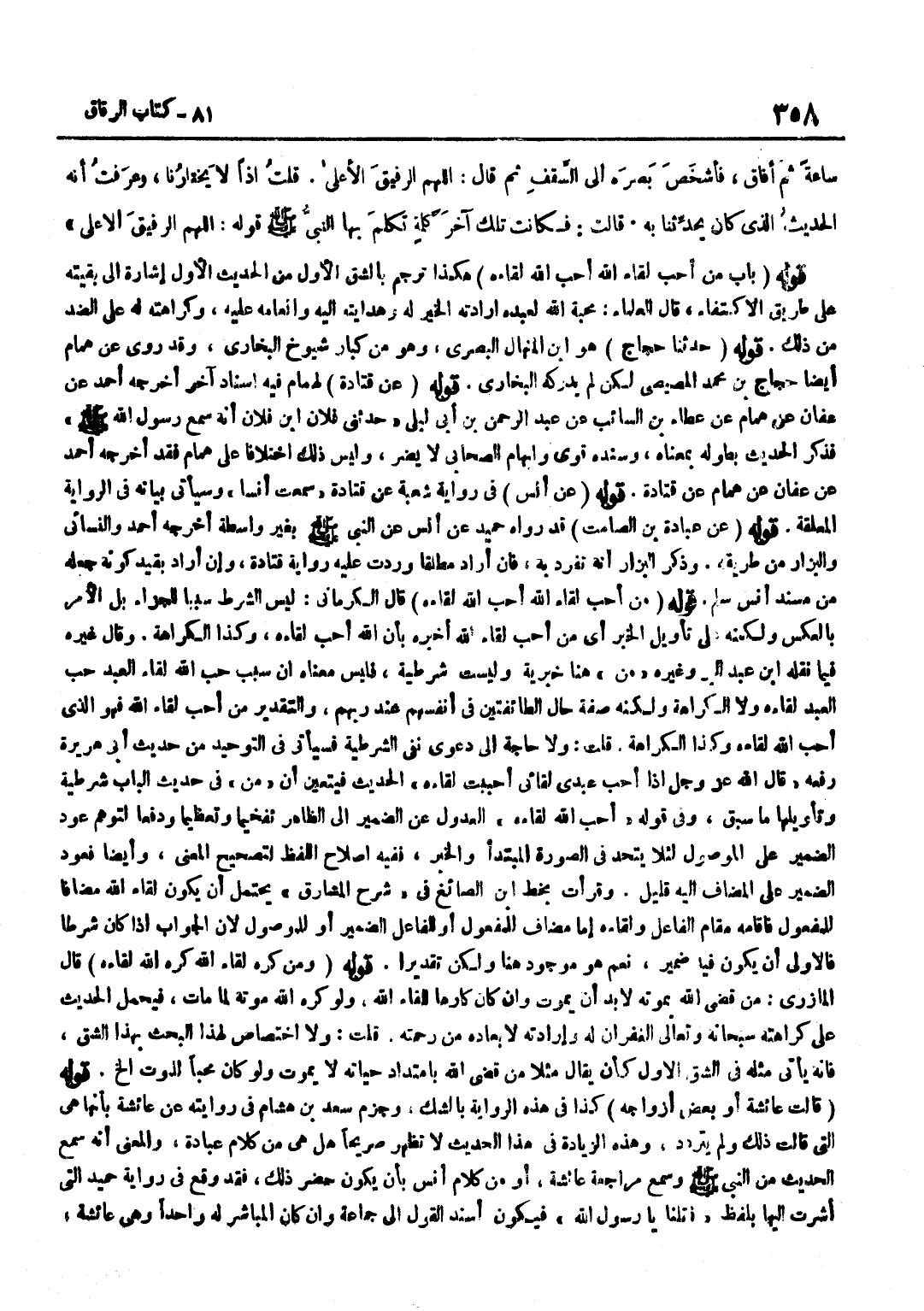 [6507] قَوْلُهُ حَدَّثَنَا حجاج هُوَ بن الْمِنْهَالِ الْبَصْرِيُّ وَهُوَ مِنْ كِبَارِ شُيُوخِ الْبُخَارِيِّ وَقَدْ رَوَى عَنْ هَمَّامٍ أَيْضًا حَجَّاجُ بْنُ مُحَمَّدٍ الْمِصِّيصِيُّ لَكِنْ لَمْ يُدْرِكْهُ الْبُخَارِيُّ قَوْلُهُ عَنْ قَتَادَةَ لِهَمَّامٍ فِيهِ إِسْنَادٌ آخَرُ أَخْرَجَهُ أَحْمَدُ عَنْ عَفَّانَ عَنْ هَمَّامٍ عَنْ عَطَاءِ بْنِ السَّائِبِ عَنْ عَبْدِ الرَّحْمَنِ بْنِ أَبِي ليلى حَدثنِي فلَان بن فُلَانٍ أَنَّهُ سَمِعَ رَسُولَ اللَّهِ صَلَّى اللَّهُ عَلَيْهِ وَسَلَّمَ فذكرالحديث بِطُولِهِ بِمَعْنَاهُ وَسَنَدُهُ قَوِيٌّ وَإِبْهَامُ الصَّحَابِيِّ لَا يَضُرُّ وَلَيْسَ ذَلِكَ اخْتِلَافًا عَلَى هَمَّامٍ فَقَدْ أَخْرَجَهُ أَحْمَدُ عَنْ عَفَّانَ عَنْ هَمَّامٍ عَنْ قَتَادَةَ قَوْلُهُ عَنْ أَنَسٍ فِي رِوَايَةِ شُعْبَةَ عَنْ قَتَادَةَ سَمِعْتُ أَنَسًا وَسَيَأْتِي بَيَانُهُ فِي الرِّوَايَةِ الْمُعَلَّقَةِ قَوْلُهُ عَنْ عُبَادَةَ بْنِ الصَّامِتِ قَدْ رَوَاهُ حُمَيْدٌ عَنْ أَنَسٌ عَنْ النَّبِيِّ صَلَّى اللَّهُ عَلَيْهِ وَسَلَّمَ بِغَيْرِ وَاسِطَةٍ أَخْرَجَهُ أَحْمَدُ وَالنَّسَائِيُّ وَالْبَزَّارُ مِنْ طَرِيقِهِ وَذَكَرَ الْبَزَّارُ أَنَّهُ تَفَرَّدَ بِهِ فَإِنْ أَرَادَ مُطْلَقًا وَرَدَتْ عَلَيْهِ رِوَايَةُ قَتَادَةَ وَإِنْ أَرَادَ بِقَيْدِ كَوْنِهِ جَعَلَهُ مِنْ مُسْنَدِ أَنَسٍ سَلِمَ قَوْلُهُ مَنْ أَحَبَّ لِقَاءَ اللَّهِ أَحَبَّ اللَّهُ لِقَاءَهُ قَالَ الْكَرْمَانِيُّ لَيْسَ الشَّرْطُ سَبَبًا لِلْجَزَاءِ بَلِ الْأَمْرُ بِالْعَكْسِ وَلَكِنَّهُ عَلَى تَأْوِيلِ الْخَبَرِ أَيْ مَنْ أَحَبَّ لِقَاءَ اللَّهِ أَخْبِرْهُ بِأَنَّ اللَّهَ أَحَبَّ لِقَاءَهُ وَكَذَا الْكَرَاهَةُ وَقَالَ غَيْرُهُ فِيمَا نَقَلَهُ بن عَبْدِ الْبَرِّ وَغَيْرُهُ مَنْ هُنَا خَبَرِيَّةٌ وَلَيْسَتْ شَرْطِيَّةً فَلَيْسَ مَعْنَاهُ أَنَّ سَبَبَ حُبِّ اللَّهِ لِقَاءَ الْعَبْدِ حُبُّ الْعَبْدِ لِقَاءَهُ وَلَا الْكَرَاهَةُ وَلَكِنَّهُ صِفَةُ حَالِ الطَّائِفَتَيْنِ فِي أَنْفُسِهِمْ عِنْدَ رَبِّهِمْ وَالتَّقْدِيرُ مَنْ أَحَبَّ لِقَاءَ اللَّهِ فَهُوَ الَّذِي أَحَبَّ اللَّهُ لِقَاءَهُ وَكَذَا الْكَرَاهَةُ قُلْتُ وَلَا حَاجَةَ إِلَى دَعْوَى نَفْيِ الشَّرْطِيَّةِ فَسَيَأْتِي فِي التَّوْحِيدِ مِنْ حَدِيثِ أَبِي هُرَيْرَةَ رَفَعَهُ قَالَ اللَّهُ عَزَّ وَجَلَّ إِذَا أَحَبَّ عَبْدِي لقائي أَحْبَبْت لقاءه الحَدِيث فَيتَعَيَّن أَنَّ مَنْ فِي حَدِيثِ الْبَابِ شَرْطِيَّةٌ وَتَأْوِيلُهَا مَا سَبَقَ وَفِي قَوْلِهِ أَحَبَّ اللَّهُ لِقَاءَهُ الْعُدُولُ عَنِ الضَّمِيرِ إِلَى الظَّاهِرِ تَفْخِيمًا وَتَعْظِيمًا وَدَفْعًا لِتَوَهُّمِ عَوْدِ الضَّمِيرِ عَلَى الْمَوْصُولِ لِئَلَّا يَتَّحِدَ فِي الصُّورَةِ الْمُبْتَدَأُ وَالْخَبَرُ فَفِيهِ إِصْلَاحُ اللَّفْظِ لِتَصْحِيحِ الْمَعْنَى وَأَيْضًا فَعَوْدُ الضَّمِيرِ عَلَى الْمُضَاف إِلَيْهِ قَلِيل وقرأت بِخَط بن الصَّائِغِ فِي شَرْحِ الْمَشَارِقِ يَحْتَمِلُ أَنْ يَكُونَ لِقَاءُ اللَّهِ مُضَافًا لِلْمَفْعُولِ فَأَقَامَهُ مَقَامَ الْفَاعِلِ وَلِقَاءَهُ إِمَّا مُضَافٌ لِلْمَفْعُولِ أَوْ لِلْفَاعِلِ الضَّمِيرِ أَوْ لِلْمَوْصُولِ لِأَنَّ الْجَوَابَ إِذَا كَانَ شَرْطًا فَالْأَوْلَى أَنْ يَكُونَ فِيهِ ضَمِيرٌ نَعَمْ هُوَ مَوْجُودٌ هُنَا وَلَكِنْ تَقْدِيرًا قَوْلُهُ وَمَنْ كَرِهَ لِقَاءَ اللَّهِ كَرِهَ اللَّهُ لِقَاءَهُ قَالَ الْمَازِرِيُّ مَنْ قَضَى اللَّهُ بِمَوْتِهِ لَا بُدَّ أَنْ يَمُوتَ وَإِنْ كَانَ كَارِهًا لِلِقَاءِ اللَّهِ وَلَوْ كَرِهَ اللَّهُ مَوْتَهُ لَمَا مَاتَ فَيُحْمَلُ الْحَدِيثُ عَلَى كَرَاهَتِهِ سُبْحَانَهُ وَتَعَالَى الْغُفْرَانَ لَهُ وَإِرَادَتِه