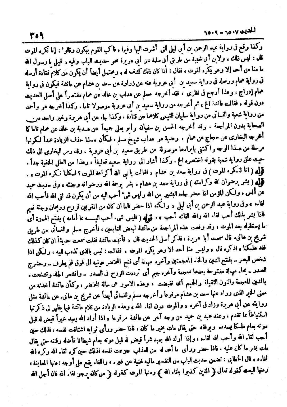 وَكَذَا وَقَعَ فِي رِوَايَةِ عَبْدِ الرَّحْمَنِ بْنِ أَبِي لَيْلَى الَّتِي أَشَرْتُ إِلَيْهَا وَفِيهَا فَأَكَبَّ الْقَوْمُ يَبْكُونَ وَقَالُوا إِنَّا نَكْرَهُ الْمَوْتَ قَالَ لَيْسَ ذَلِكَ وَلِابْنِ أَبِي شَيْبَةَ مِنْ طَرِيقِ أَبِي سَلَمَةَ عَنْ أَبِي هُرَيْرَةَ نَحْوُ حَدِيثِ الْبَابِ وَفِيهِ قِيلَ يَا رَسُولَ اللَّهِ مَا مِنَّا مِنْ أَحَدٍ إِلَّا وَهُوَ يَكْرَهُ الْمَوْتَ فَقَالَ إِذَا كَانَ ذَلِكَ كُشِفَ لَهُ وَيَحْتَمِلُ أَيْضًا أَنْ يَكُونَ مِنْ كَلَامِ قَتَادَةَ أَرْسَلَهُ فِي رِوَايَةِ هَمَّامٍ وَوَصَلَهُ فِي رِوَايَةِ سَعِيدِ بْنِ أَبِي عَرُوبَةَ عَنْهُ عَنْ زُرَارَةَ عَنْ سَعْدِ بْنِ هِشَامٍ عَنْ عَائِشَةَ فَيَكُونُ فِي رِوَايَةِ هَمَّامٍ إِدْرَاجٌ وَهَذَا أَرْجَحُ فِي نَظَرِي فَقَدْ أَخْرَجَهُ مُسْلِمٌ عَنْ هَدَّابِ بْنِ خَالِدٍ عَنْ هَمَّامٍ مُقْتَصِرًا عَلَى أَصْلِ الْحَدِيثِ دُونَ قَوْلِهِ فَقَالَتْ عَائِشَةُ إِلَخْ ثُمَّ أَخْرَجَهُ مِنْ رِوَايَةِ سَعِيدِ بْنِ أَبِي عَرُوبَةَ مَوْصُولًا تَامًّا وَكَذَا أَخْرَجَهُ هُوَ وَأَحْمَدُ مِنْ رِوَايَةِ شُعْبَةَ وَالنَّسَائِيِّ مِنْ رِوَايَةِ سُلَيْمَانَ التَّيْمِيِّ كِلَاهُمَا عَنْ قَتَادَةَ وَكَذَا جَاءَ عَنْ أَبِي هُرَيْرَةَ وَغَيْرِ وَاحِدٍ مِنَ الصَّحَابَةِ بِدُونِ الْمُرَاجَعَةِ وَقَدْ أَخْرَجَهُ الْحَسَنُ بْنُ سُفْيَانَ وَأَبُو يَعْلَى جَمِيعًا عَنْ هُدْبَةَ بْنِ خَالِدٍ عَنْ هَمَّامٍ تَامًّا كَمَا أَخْرَجَهُ الْبُخَارِيُّ عَنْ حَجَّاجٍ عَنْ هَمَّامٍ وَهُدْبَةُ هُوَ هداب شيخ مُسْلِمٍ فَكَأَنَّ مُسْلِمًا حَذَفَ الزِّيَادَةَ عَمْدًا لِكَوْنِهَا مُرْسَلَةً مِنْ هَذَا الْوَجْهِ وَاكْتَفَى بِإِيرَادِهَا مَوْصُولَةً مِنْ طَرِيقِ سَعِيدِ بْنِ أَبِي عَرُوبَةَ وَقَدْ رَمَزَ الْبُخَارِيُّ إِلَى ذَلِكَ حَيْثُ عَلَّقَ رِوَايَةَ شُعْبَةَ بِقَوْلِهِ اخْتَصَرَهُ إِلَخْ وَكَذَا أَشَارَ إِلَى رِوَايَةِ سَعِيدٍ تَعْلِيقًا وَهَذَا مِنَ الْعِلَلِ الْخَفِيَّةِ جِدًّا قَوْلُهُ إِنَّا لَنَكْرَهُ الْمَوْتَ فِي رِوَايَةِ سَعْدِ بْنِ هِشَامٍ فَقَالَتْ يَا نَبِيَّ اللَّهِ أَكَرَاهَةُ الْمَوْتِ فَكُلُّنَا نَكْرَهُ الْمَوْتَ قَوْلُهُ بُشِّرَ بِرِضْوَانِ اللَّهِ وَكَرَامَتِهِ فِي رِوَايَةِ سَعْدِ بْنِ هِشَامٍ بُشِّرَ بِرَحْمَةِ اللَّهِ وَرِضْوَانِهِ وَجَنَّتِهِ وَفِي حَدِيثِ حُمَيْدٍ عَنْ أَنَسٍ وَلَكِنَّ الْمُؤْمِنَ إِذَا حُضِرَ جَاءَهُ الْبَشِيرُ مِنَ اللَّهِ وَلَيْسَ شَيْءٌ أَحَبَّ إِلَيْهِ مِنْ أَنْ يَكُونَ قَدْ لَقِيَ اللَّهَ فَأَحَبَّ اللَّهُ لِقَاءَهُ وَفِي رِوَايَةِ عَبْدِ الرَّحْمَنِ بْنِ أَبِي لَيْلَى وَلَكِنَّهُ إِذَا حَضَرَ فَأَمَّا إِنْ كَانَ مِنَ الْمُقَرَّبِينَ فَرَوْحٌ وَرَيْحَانٌ وَجَنَّةُ نَعِيمٍ فَإِذَا بُشِّرَ بِذَلِكَ أَحَبَّ لِقَاءَ اللَّهِ وَاللَّهُ لِلِقَائِهِ أَحَبُّ قَوْلُهُ فَلَيْسَ شَيْءٌ أَحَبَّ إِلَيْهِ مِمَّا أَمَامَهُ بِفَتْحِ الْهَمْزَةِ أَيْ مَا يَسْتَقْبِلُهُ بَعْدَ الْمَوْتِ وَقَدْ وَقَعَتْ هَذِهِ الْمُرَاجَعَةُ مِنْ عَائِشَةَ لِبَعْضِ التَّابِعِينَ فَأَخْرَجَ مُسْلِمٌ وَالنَّسَائِيّ من طَرِيق شُرَيْح بن هَانِيء قَالَ سَمِعْتُ أَبَا هُرَيْرَةَ فَذَكَرَ أَصْلَ الْحَدِيثِ قَالَ فَأَتَيْتُ عَائِشَةَ فَقُلْتُ سَمِعْتُ حَدِيثًا إِنْ كَانَ كَذَلِكَ فَقَدْ هَلَكْنَا فَذَكَرَهُ قَالَ وَلَيْسَ مِنَّا أَحَدٌ إِلَّا وَهُوَ يَكْرَهُ الْمَوْتَ فَقَالَتْ لَيْسَ بِالَّذِي تَذْهَبُ إِلَيْهِ وَلَكِنْ إِذَا شَخَصَ الْبَصَرُ بِفَتْحِ الشِّينِ وَالْخَاءِ الْمُعْجَمَتَيْنِ وَآخِرُهُ مُهْمَلَةٌ أَيْ فَتَحَ الْمُحْتَضَرُ عَيْنَيْهِ إِلَى فَوْقُ فَلَمْ يَطْرِفْ وَحَشْرَجَ الصَّدْرُ بِحَاءٍ م