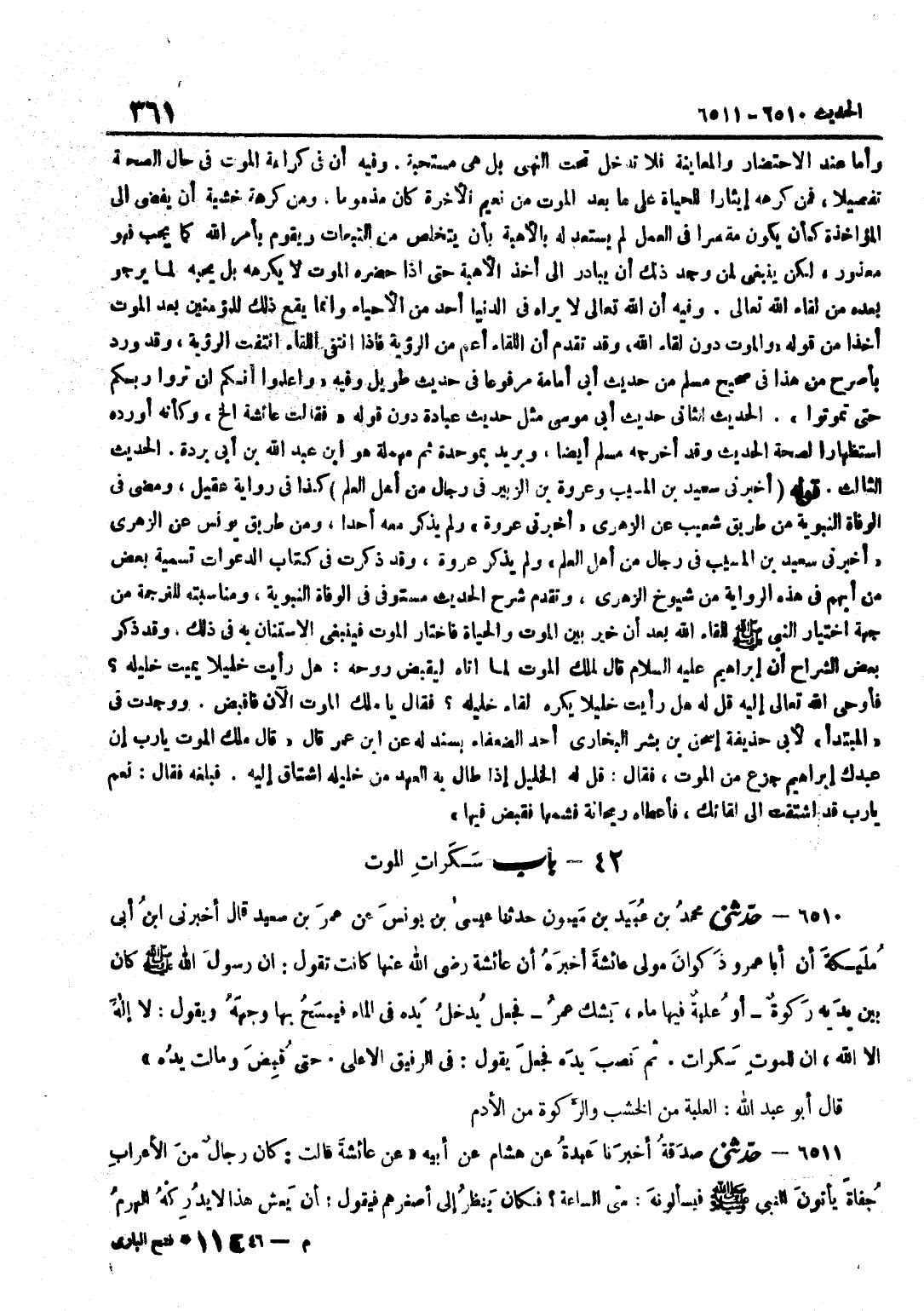 [6509] قَوْلُهُ أَخْبَرَنِي سَعِيدُ بْنُ الْمُسَيَّبِ وَعُرْوَةُ بْنُ الزُّبَيْرِ فِي رِجَالٍ مِنْ أَهْلِ الْعِلْمِ كَذَا فِي رِوَايَةِ عَقِيلٍ وَمَضَى فِي الْوَفَاةِ النَّبَوِيَّةِ مِنْ طَرِيقِ شُعَيْبٍ عَنِ الزُّهْرِيِّ أَخْبَرَنِي عُرْوَةُ وَلَمْ يَذْكُرْ مَعَهُ أَحَدًا وَمِنْ طَرِيقِ يُونُسَ عَنِ الزُّهْرِيِّ أَخْبَرَنِي سَعِيدُ بْنُ الْمُسَيَّبِ فِي رِجَالِ مِنْ أَهْلِ الْعِلْمِ وَلَمْ يَذْكُرْ عُرْوَةَ وَقَدْ ذَكَرْتُ فِي كِتَابِ الدَّعَوَاتِ تَسْمِيَةَ بَعْضِ مَنْ أُبْهِمَ فِي هَذِهِ الرِّوَايَةِ مِنْ شُيُوخِ الزُّهْرِيِّ وَتَقَدَّمَ شَرْحُ الْحَدِيثِ مُسْتَوْفًى فِي الْوَفَاةِ النَّبَوِيَّةِ وَمُنَاسَبَتُهُ لِلتَّرْجَمَةِ مِنْ جِهَةِ اخْتِيَارِ النَّبِيِّ صَلَّى اللَّهُ عَلَيْهِ وَسَلَّمَ لِلِقَاءِ اللَّهِ بَعْدَ أَنْ خُيِّرَ بَيْنَ الْمَوْتِ وَالْحَيَاةِ فَاخْتَارَ الْمَوْتَ فَيَنْبَغِي الِاسْتِنَانُ بِهِ فِي ذَلِكَ وَقَدْ ذَكَرَ بَعْضُ الشُّرَّاحِ أَنَّ إِبْرَاهِيمَ عَلَيْهِ السَّلَامُ قَالَ لِمَلَكِ الْمَوْتِ لَمَّا أَتَاهُ لِيَقْبِضَ رُوحَهُ هَلْ رَأَيْتَ خَلِيلًا يُمِيتُ خَلِيلَهُ فَأَوْحَى اللَّهُ تَعَالَى إِلَيْهِ قُلْ لَهُ هَلْ رَأَيْتَ خَلِيلًا يَكْرَهُ لِقَاءَ خَلِيلِهِ فَقَالَ يَا مَلَكَ الْمَوْتِ الْآنَ فَاقْبِضْ وَوَجَدْتُ فِي الْمُبْتَدَأِ لِأَبِي حُذَيْفَةَ إِسْحَاقَ بْنِ بِشْرٍ الْبُخَارِيِّ أَحَدِ الضُّعَفَاءِ بِسَنَدٍ لَهُ عَن بن عُمَرَ قَالَ قَالَ مَلَكُ الْمَوْتِ يَا رَبِّ إِنَّ عَبْدَكَ إِبْرَاهِيمَ جَزِعَ مِنَ الْمَوْتِ فَقَالَ قُلْ لَهُ الْخَلِيلُ إِذَا طَالَ بِهِ الْعَهْدُ مِنْ خَلِيلِهِ اشْتَاقَ إِلَيْهِ فَبَلَّغَهُ فَقَالَ نَعَمْ يَا رَبِّ قَدِ اشْتَقْتُ إِلَى لِقَائِكَ فَأَعْطَاهُ رَيْحَانَة فشمها فَقبض فِيهَا