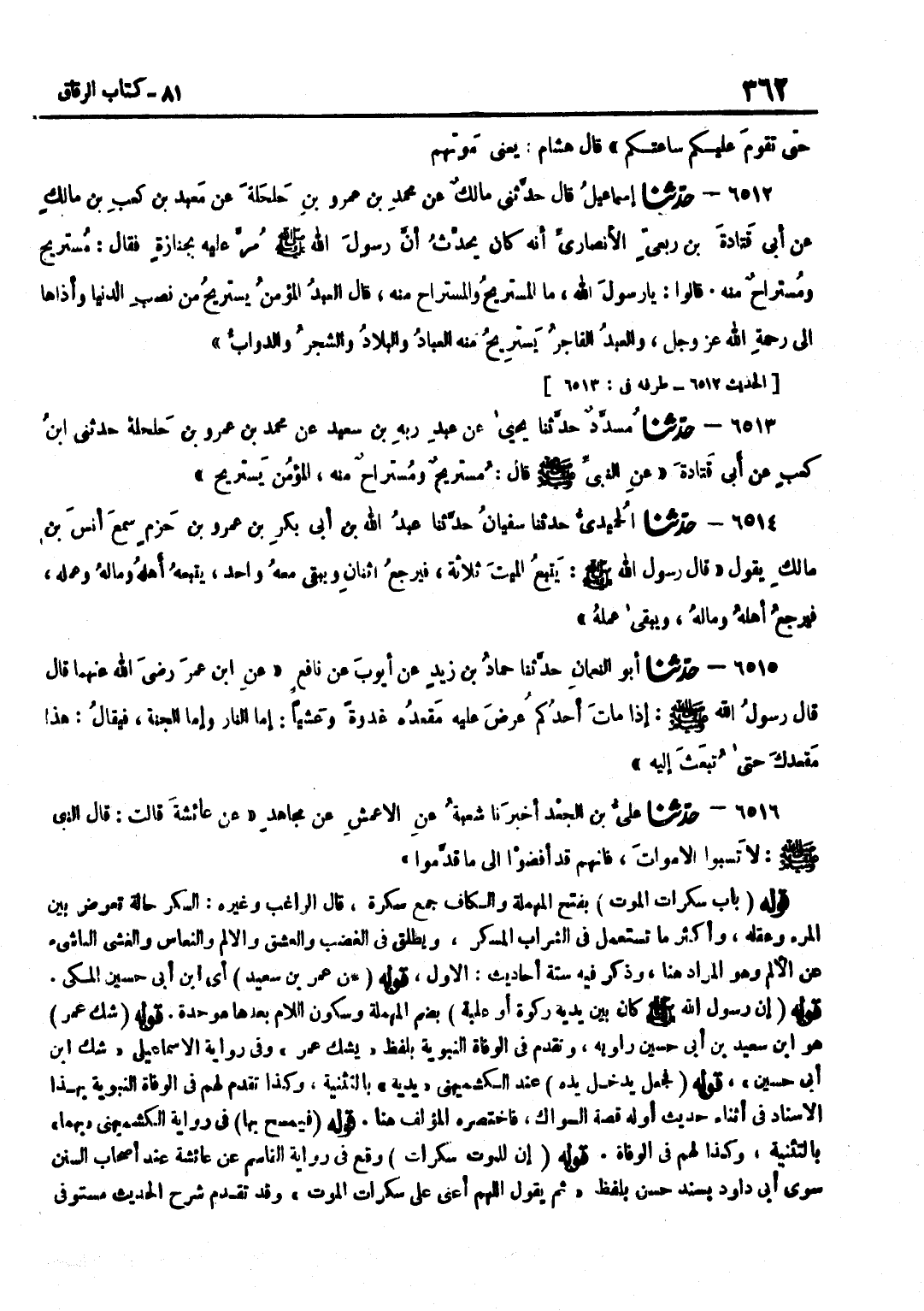 [6510] قَوْلُهُ عَنْ عُمَرَ بْنِ سعيد أَي بن أَبِي حُسَيْنٍ الْمَكِّيِّ قَوْلُهُ أَنَّ رَسُولَ اللَّهِ صَلَّى اللَّهُ عَلَيْهِ وَسَلَّمَ كَانَ بَيْنَ يَدَيْهِ رَكْوَةٌ أَوْ عُلْبَةُ بِضَمِّ الْمُهْمَلَةِ وَسُكُونِ اللَّامِ بَعْدَهَا مُوَحَّدَةٌ قَوْله شكّ عمر هُوَ بن سَعِيدِ بْنِ أَبِي حُسَيْنٍ رَاوِيهِ وَتَقَدَّمَ فِي الْوَفَاةِ النَّبَوِيَّةِ بِلَفْظِ يَشُكُّ عُمَرُ وَفِي رِوَايَةِ الْإِسْمَاعِيلِيّ شكّ بن أَبِي حُسَيْنٍ قَوْلُهُ فَجَعَلَ يُدْخِلُ يَدَهُ عِنْدَ الْكُشْمِيهَنِيِّ يَدَيْهِ بِالتَّثْنِيَةِ وَكَذَا تَقَدَّمَ لَهُمْ فِي الْوَفَاةِ النَّبَوِيَّةِ بِهَذَا الْإِسْنَادِ فِي أَثْنَاءِ حَدِيثٍ أَوَّلُهُ قِصَّةُ السِّوَاكِ فَاخْتَصَرَهُ الْمُؤَلِّفُ هُنَا قَوْلُهُ فَيَمْسَحُ بِهَا فِي رِوَايَةِ الْكُشْمِيهَنِيِّ بِهِمَا بِالتَّثْنِيَةِ وَكَذَا لَهُمْ فِي الْوَفَاةِ قَوْلُهُ إِنَّ لِلْمَوْتِ سَكَرَاتٍ وَقَعَ فِي رِوَايَةِ الْقَاسِمِ عَنْ عَائِشَةَ عِنْدَ أَصْحَابِ السُّنَنِ سِوَى أَبِي دَاوُدَ بِسَنَدٍ حَسَنٍ بِلَفْظِ ثُمَّ يَقُول اللَّهُمَّ أَعِنِّي عَلَى سَكَرَات الْمَوْت وَقَدْ تَقَدَّمَ شَرْحُ الْحَدِيثِ مُسْتَوْفًى