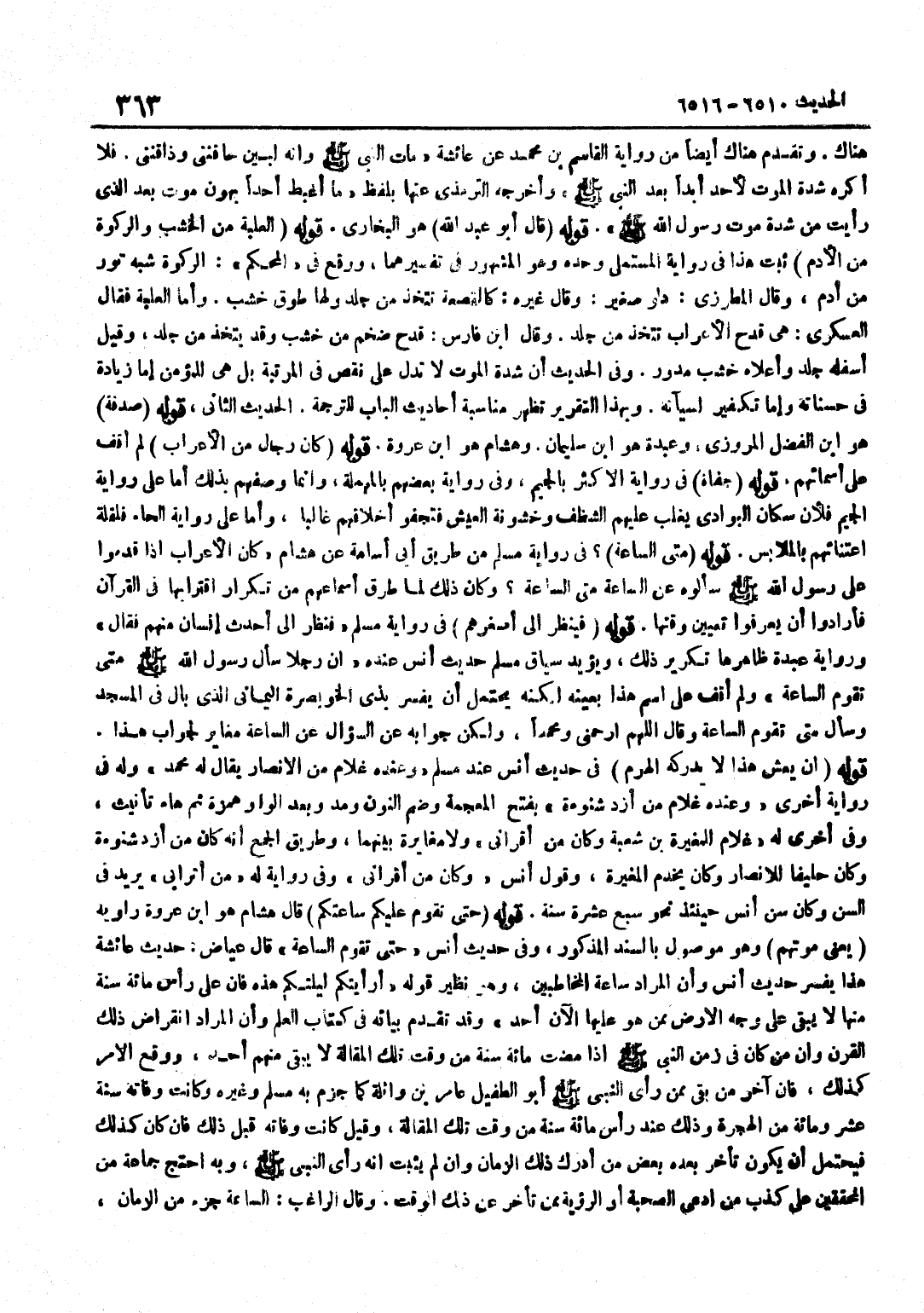 [6511] قَوْله صَدَقَة هُوَ بن الْفضل الْمروزِي وَعَبدَة هُوَ بن سُلَيْمَان وَهِشَام هُوَ بن عُرْوَةَ قَوْلُهُ كَانَ رِجَالٌ مِنَ الْأَعْرَابِ لَمْ أَقِفْ عَلَى أَسْمَائِهِمْ قَوْلُهُ جُفَاة فِي رِوَايَةِ الْأَكْثَرِ بِالْجِيمِ وَفِي رِوَايَةِ بَعْضِهِمْ بِالْمُهْمَلَةِ وَإِنَّمَا وَصَفَهُمْ بِذَلِكَ أَمَّا عَلَى رِوَايَةِ الْجِيمِ فَلِأَنَّ سُكَّانَ الْبَوَادِي يَغْلِبُ عَلَيْهِمُ الشَّظَفُ وَخُشُونَةُ الْعَيْشِ فَتَجْفُو أَخْلَاقُهُمْ غَالِبًا وَأَمَّا عَلَى رِوَايَةِ الْحَاءِ فَلِقِلَّةِ اعْتِنَائِهِمْ بِالْمَلَابِسِ قَوْلُهُ مَتَى السَّاعَةُ فِي رِوَايَةِ مُسْلِمٌ مِنْ طَرِيقِ أَبِي أُسَامَةَ عَنْ هِشَامٍ كَانَ الْأَعْرَابُ إِذَا قَدِمُوا عَلَى رَسُولِ اللَّهِ صَلَّى اللَّهُ عَلَيْهِ وَسَلَّمَ سَأَلُوهُ عَنِ السَّاعَةِ مَتَى السَّاعَةُ وَكَانَ ذَلِكَ لَمَّا طَرَقَ أَسْمَاعَهُمْ مِنْ تَكْرَارِ اقْتِرَابِهَا فِي الْقُرْآنِ فَأَرَادُوا أَنْ يَعْرِفُوا تَعْيِينَ وَقْتِهَا قَوْلُهُ فَيَنْظُرُ إِلَى أَصْغَرِهِمْ فِي رِوَايَةِ مُسْلِمٍ فَنَظَرَ إِلَى أَحْدَثِ إِنْسَانٍ مِنْهُمْ فَقَالَ وَرِوَايَةُ عَبْدَةَ ظَاهِرُهَا تَكْرِيرُ ذَلِكَ وَيُؤَيِّدُ سِيَاقَ مُسْلِمٍ حَدِيثُ أَنَسٍ عِنْدَهُ أَنَّ رَجُلًا سَأَلَ رَسُولَ اللَّهِ صَلَّى اللَّهُ عَلَيْهِ وَسَلَّمَ مَتَى تَقُومُ السَّاعَةُ وَلَمْ أَقِفْ عَلَى اسْمِ هَذَا بِعَيْنِهِ لَكِنَّهُ يَحْتَمِلُ أَنْ يُفَسَّرَ بِذِي الْخُوَيْصِرَةِ الْيَمَانِيِّ الَّذِي بَالَ فِي الْمَسْجِدِ وَسَأَلَ مَتَى تَقُومُ السَّاعَةُ وَقَالَ اللَّهُمَّ ارْحَمْنِي وَمُحَمَّدًا وَلَكِنَّ جَوَابَهُ عَنِ السُّؤَالِ عَنِ السَّاعَةِ مُغَايِرٌ لِجَوَابِ هَذَا قَوْلُهُ إِنْ يَعِشْ هَذَا لَا يُدْرِكْهُ الْهَرَمُ فِي حَدِيثِ أَنَسٍ عِنْدَ مُسْلِمٍ وَعِنْدَهُ غُلَامٌ مِنْ الْأَنْصَارِ يُقَالُ لَهُ مُحَمَّدٌ وَلَهُ فِي رِوَايَةٍ أُخْرَى وَعَنْدَهُ غُلَامٌ مِنْ أَزْدِ شَنُوءَةَ بِفَتْحِ الْمُعْجَمَةِ وَضَمِّ النُّونِ وَمَدٍّ وَبَعْدَ الْوَاوِ هَمْزَةٌ ثُمَّ هَاءُ تَأْنِيثٍ وَفِي أُخْرَى لَهُ غُلَامٌ لِلْمُغِيرَةِ بْنِ شُعْبَةَ وَكَانَ مِنْ أَقْرَانِي وَلَا مُغَايَرَةَ بَيْنَهُمَا وَطَرِيقُ الْجَمْعِ أَنَّهُ كَانَ مِنْ أَزْدِ شَنُوءَةَ وَكَانَ حَلِيفًا لِلْأَنْصَارِ وَكَانَ يَخْدُمُ الْمُغِيرَةَ وَقَوْلُ أَنَسٍ وَكَانَ مِنْ أَقْرَانِي وَفِي رِوَايَةٍ لَهُ من اترابي يُرِيد فِي السِّنِّ وَكَانَ سِنُّ أَنَسٍ حِينَئِذٍ نَحْوَ سَبْعَ عَشْرَةَ سَنَةً قَوْلُهُ حَتَّى تَقُومَ عَلَيْكُمْ سَاعَتكُمْ قَالَ هِشَام هُوَ بن عُرْوَةَ رَاوِيهِ يَعْنِي مَوْتَهُمْ وَهُوَ مَوْصُولٌ بِالسَّنَدِ الْمَذْكُورِ وَفِي حَدِيثِ أَنَسٍ حَتَّى تَقُومَ السَّاعَةُ قَالَ عِيَاضٌ حَدِيثُ عَائِشَةَ هَذَا يُفَسِّرُ حَدِيثَ أَنَسٍ وَأَنَّ الْمُرَادَ سَاعَةُ الْمُخَاطَبِينَ وَهُوَ نَظِيرُ قَوْلِهِ أَرَأَيْتُكُمْ لَيْلَتَكُمْ هَذِهِ فَإِنَّ عَلَى رَأْسِ مِائَةِ سَنَةٍ مِنْهَا لَا يَبْقَى عَلَى وَجْهِ الْأَرْضِ مِمَّنْ هُوَ عَلَيْهَا الْآنَ أَحَدٌ وَقَدْ تَقَدَّمَ بَيَانُهُ فِي كِتَابِ الْعِلْمِ وَأَنَّ الْمُرَادَ انْقِرَاضُ ذَلِكَ الْقَرْنِ وَأَنَّ مَنْ كَانَ فِي زَمَنِ النَّبِيِّ صَلَّى اللَّهُ عَلَيْهِ وَسَلَّمَ إِذَا مَضَتْ مِائَةُ سَنَةٍ مِنْ وَقْتِ تِلْكَ الْمَقَالَةِ لَا يَبْقَى مِنْهُمْ أَحَدٌ وَوَقَعَ الْأَمْرُ كَذَلِكَ فَإِنَّ آخِرَ مَنْ بَقِيَ مِمَّنْ رَأَى النَّبِيَّ صَلَّى اللَّهُ عَلَيْهِ وَسَلَّمَ أَبُو الطُّفَيْلِ عَامِرُ بْنُ وَاثِلَةَ كَمَا جَزَمَ بِهِ مُسْلِمٌ وَغَيْرُهُ وَكَانَتْ وَفَاتُهُ سَنَةَ عَشْرٍ وَمِائَةٍ مِنَ الْهِجْرَةِ وَذَلِكَ عِنْدَ رَأْ
