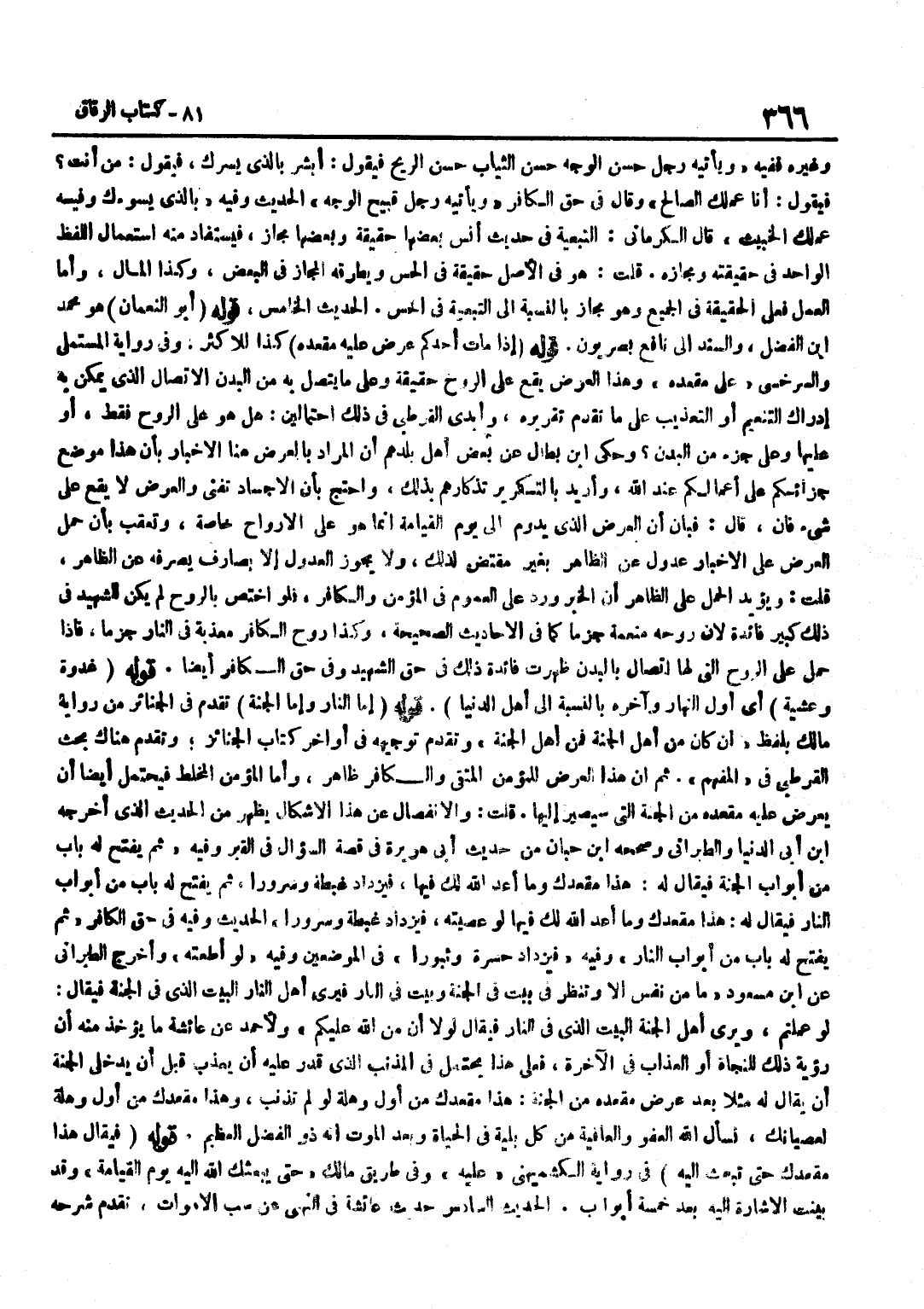 [6515] قَوْلُهُ أَبُو النُّعْمَانِ هُوَ مُحَمَّدُ بْنُ الْفَضْلِ وَالسَّنَدُ إِلَى نَافِعٍ بَصْرِيُّونَ قَوْلُهُ إِذَا مَاتَ أَحَدُكُمْ عُرِضَ عَلَيْهِ مَقْعَدُهُ كَذَا لِلْأَكْثَرِ وَفِي رِوَايَةِ الْمُسْتَمْلِي وَالسَّرَخْسِيِّ عَلَى مَقْعَدِهِ وَهَذَا الْعَرْضُ يَقَعُ عَلَى الرُّوحِ حَقِيقَةً وَعَلَى مَا يَتَّصِلُ بِهِ مِنَ الْبَدَنِ الِاتِّصَالَ الَّذِي يُمْكِنُ بِهِ إِدْرَاكُ التَّنْعِيمِ أَوِ التَّعْذِيبِ عَلَى مَا تَقَدَّمَ تَقْرِيرُهُ وَأَبْدَى الْقُرْطُبِيُّ فِي ذَلِكَ احْتِمَالَيْنِ هَلْ هُوَ عَلَى الرُّوحِ فَقَطْ أَوْ عَلَيْهَا وَعَلَى جُزْءٍ مِنَ الْبدن وَحكى بن بَطَّالٍ عَنْ بَعْضِ أَهْلِ بَلَدِهِمْ أَنَّ الْمُرَادَ بِالْعَرْضِ هُنَا الْإِخْبَارُ بِأَنَّ هَذَا مَوْضِعَ جَزَائِكُمْ عَلَى أَعْمَالِكُمْ عِنْدَ اللَّهِ وَأُرِيدَ بِالتَّكْرِيرِ تَذْكَارُهُمْ بِذَلِكَ وَاحْتَجَّ بِأَنَّ الْأَجْسَادَ تَفْنَى وَالْعَرْضُ لَا يَقَعُ عَلَى شَيْءٍ فَإِنْ قَالَ فَبَانَ أَنَّ الْعَرْضَ الَّذِي يَدُومُ إِلَى يَوْمِ الْقِيَامَةِ إِنَّمَا هُوَ عَلَى الْأَرْوَاحِ خَاصَّةً وَتُعُقِّبَ بِأَنَّ حَمْلَ الْعَرْضِ عَلَى الْإِخْبَارِ عُدُولٌ عَنِ الظَّاهِرِ بِغَيْرِ مُقْتَضٍ لِذَلِكَ وَلَا يَجُوزُ الْعُدُولُ إِلَّا بِصَارِفٍ يَصْرِفُهُ عَنِ الظَّاهِرِ قُلْتُ وَيُؤَيِّدُ الْحَمْلَ عَلَى الظَّاهِرِ أَنَّ الْخَبَرَ وَرَدَ عَلَى الْعُمُومِ فِي الْمُؤْمِنِ وَالْكَافِرِ فَلَوِ اخْتُصَّ بِالرُّوحِ لَمْ يَكُنْ لِلشَّهِيدِ فِي ذَلِكَ كَبِيرُ فَائِدَةٍ لِأَنَّ رُوحَهُ مُنَعَّمَةٌ جَزْمًا كَمَا فِي الْأَحَادِيثِ الصَّحِيحَةِ وَكَذَا رُوحُ الْكَافِرِ مُعَذَّبَةٌ فِي النَّارِ جَزْمًا فَإِذَا حُمِلَ عَلَى الرُّوحِ الَّتِي لَهَا اتِّصَالٌ بِالْبَدَنِ ظَهَرَتْ فَائِدَةُ ذَلِكَ فِي حَقِّ الشَّهِيدِ وَفِي حَقِّ الْكَافِرِ أَيْضًا قَوْلُهُ غُدْوَةً وَعَشِيَّةً أَيْ أَوَّلَ النَّهَارِ وَآخِرَهُ بِالنِّسْبَةِ إِلَى أَهْلِ الدُّنْيَا قَوْلُهُ إِمَّا النَّارُ وَإِمَّا الْجَنَّةُ تَقَدَّمَ فِي الْجَنَائِزِ مِنْ رِوَايَةِ مَالِكٍ بِلَفْظِ إِنْ كَانَ مِنْ أَهْلِ الْجَنَّةِ فَمِنْ أَهْلِ الْجَنَّةِ وَتَقَدَّمَ تَوْجِيهُهُ فِي أَوَاخِرِ كِتَابِ الْجَنَائِزِ وَتَقَدَّمَ هُنَاكَ بَحْثُ الْقُرْطُبِيِّ فِي الْمُفْهِمِ ثُمَّ إِنَّ هَذَا الْعَرْضَ لِلْمُؤْمِنِ الْمُتَّقِي وَالْكَافِرِ ظَاهِرٌ وَأَمَّا الْمُؤْمِنُ الْمُخَلِّطُ فَيَحْتَمِلُ أَيْضًا أَنْ يُعْرَضَ عَلَيْهِ مَقْعَدُهُ مِنَ الْجَنَّةِ الَّتِي سَيَصِيرُ إِلَيْهَا قُلْتُ وَالِانْفِصَالُ عَنْ هَذَا الْإِشْكَالِ يَظْهَرُ مِنَ الْحَدِيثِ الَّذِي أخرجه بن أبي الدُّنْيَا وَالطَّبَرَانِيّ وَصَححهُ بن حِبَّانَ مِنْ حَدِيثِ أَبِي هُرَيْرَةَ فِي قِصَّةِ السُّؤَالِ فِي الْقَبْرِ وَفِيهِ ثُمَّ يُفْتَحُ لَهُ بَابٌ مِنْ أَبْوَابِ الْجَنَّةِ فَيُقَالُ لَهُ هَذَا مَقْعَدُكَ وَمَا أَعَدَّ اللَّهُ لَكَ فِيهَا فَيَزْدَادُ غِبْطَةً وَسُرُورًا ثُمَّ يُفْتَحُ لَهُ بَابٌ مِنْ أَبْوَابِ النَّارِ فَيُقَالُ لَهُ هَذَا مَقْعَدُكَ وَمَا أَعَدَّ اللَّهُ لَكَ فِيهَا لَوْ عَصَيْتَهُ فَيَزْدَادُ غِبْطَةً وَسُرُورًا الْحَدِيثَ وَفِيهِ فِي حَقِّ الْكَافِرِ ثُمَّ يُفْتَحُ لَهُ بَابٌ مِنْ أَبْوَابِ النَّارِ وَفِيهِ فَيَزْدَادُ حَسْرَةً وَثُبُورًا فِي الْمَوْضِعَيْنِ وَفِيهِ لَو اطعته واخرج الطَّبَرَانِيّ عَن بن مَسْعُودٍ مَا مِنْ نَفْسٍ إِلَّا وَتَنْظُرُ فِي بَيْتٍ فِي الْجَنَّةِ وَبَيْتٍ فِي النَّارِ فَيَرَى أَهْلُ النَّارِ الْبَيْتَ الَّذِي فِي الْجَنَّةِ فَيُقَالُ لَوْ عَمِلْتُمْ وَيَرَى أَهْلُ الْجَنَّةِ الْبَيْتَ الَّذِي فِي النَّارِ فَيُقَالُ لَوْل