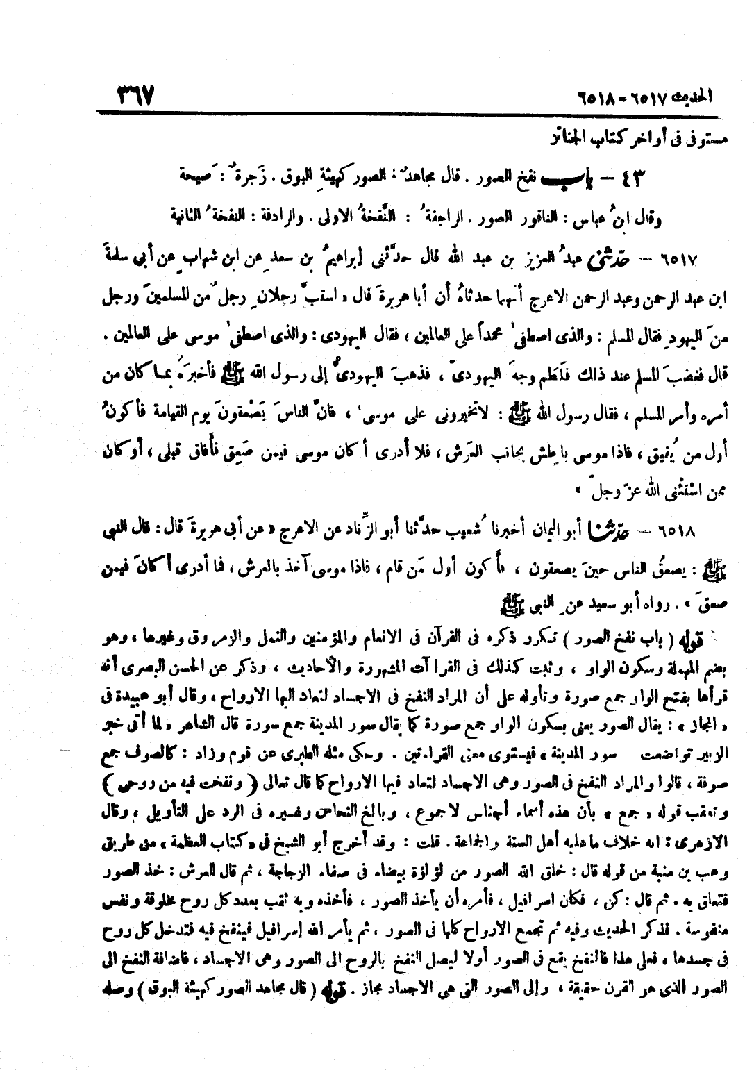 ذِكْرُهُ فِي الْقُرْآنِ فِي الْأَنْعَامِ وَالْمُؤْمِنِينَ وَالنَّمْلِ وَالزُّمَرِ وَق وَغَيْرِهَا وَهُوَ بِضَمِّ الْمُهْمَلَةِ وَسُكُونِ الْوَاوِ وَثَبَتَ كَذَلِكَ فِي الْقِرَاءَاتِ الْمَشْهُورَةِ وَالْأَحَادِيثِ وَذُكِرَ عَنِ الْحَسَنِ الْبَصْرِيِّ أَنَّهُ قَرَأَهَا بِفَتْحِ الْوَاوِ جَمْعُ صُورَةٍ وَتَأَوَّلَهُ عَلَى أَنَّ الْمُرَادَ النَّفْخُ فِي الْأَجْسَادِ لِتُعَادَ إِلَيْهَا الْأَرْوَاحُ وَقَالَ أَبُو عُبَيْدَةَ فِي الْمَجَازِ يُقَالُ الصُّورُ يَعْنِي بِسُكُونِ الْوَاوِ جَمْعُ صُورَةٍ كَمَا يُقَالُ سُورُ الْمَدِينَةِ جَمْعُ سُورَة قَالَ الشَّاعِر لما اتى خبر الزبير تَوَاضَعَتْ سُوَرُ الْمَدِينَةِ فَيَسْتَوِي مَعْنَى الْقِرَاءَتَيْنِ وَحَكَى مِثْلَهُ الطَّبَرِيُّ عَنْ قَوْمٍ وَزَادَ كَالصُّوفِ جَمْعِ صُوفَةٍ قَالُوا وَالْمُرَادُ النَّفْخُ فِي الصُّورِ وَهِيَ الأجساد لتعاد فها الْأَرْوَاحُ كَمَا قَالَ تَعَالَى وَنَفَخْتُ فِيهِ مِنْ روحي وَتُعُقِّبَ قَوْلُهُ جَمْعٌ بِأَنَّ هَذِهِ أَسْمَاءُ أَجْنَاسٍ لَا جُمُوعٌ وَبَالَغَ النَّحَّاسُ وَغَيْرُهُ فِي الرَّدِّ عَلَى التَّأْوِيلِ وَقَالَ الْأَزْهَرِيُّ إِنَّهُ خِلَافُ مَا عَلَيْهِ أَهْلِ السُّنَّةِ وَالْجَمَاعَةِ قُلْتُ وَقَدْ أَخْرَجَ أَبُو الشَّيْخِ فِي كِتَابِ الْعَظَمَةِ مِنْ طَرِيقِ وَهْبِ بْنِ مُنَبِّهٍ مِنْ قَوْلِهِ قَالَ خَلَقَ اللَّهُ الصُّورَ مِنْ لُؤْلُؤَةٍ بَيْضَاءَ فِي صَفَاءِ الزُّجَاجَةِ ثُمَّ قَالَ لِلْعَرْشِ خُذِ الصُّورَ فَتَعَلَّقْ بِهِ ثُمَّ قَالَ كُنْ فَكَانَ إِسْرَافِيلُ فَأَمَرَهُ أَنْ يَأْخُذَ الصُّورَ فَأَخَذَهُ وَبِهِ ثُقْبٌ بِعَدَدِ كل روح مخلوقة وَنَفس منفوسة فذكرالحديث وَفِيهِ ثُمَّ تُجْمَعُ الْأَرْوَاحُ كُلُّهَا فِي الصُّورِ ثُمَّ يَأْمُرُ اللَّهُ إِسْرَافِيلَ فَيَنْفُخُ فِيهِ فَتَدْخُلُ كُلُّ رُوحٍ فِي جَسَدِهَا فَعَلَى هَذَا فَالنَّفْخُ يَقَعُ فِي الصُّورِ أَوَّلًا لِيَصِلَ النَّفْخُ بِالرُّوحِ إِلَى الصُّورِ وَهِيَ الْأَجْسَادُ فَإِضَافَةُ النَّفْخِ إِلَى الصُّورِ الَّذِي هُوَ الْقَرْنُ حَقِيقَةً وَإِلَى الصُّورِ الَّتِي هِيَ الْأَجْسَادُ مَجَازٌ قَوْلُهُ قَالَ مُجَاهِدٌ الصُّورُ كَهَيْئَةِ الْبُوقِ وَصَلَهُ