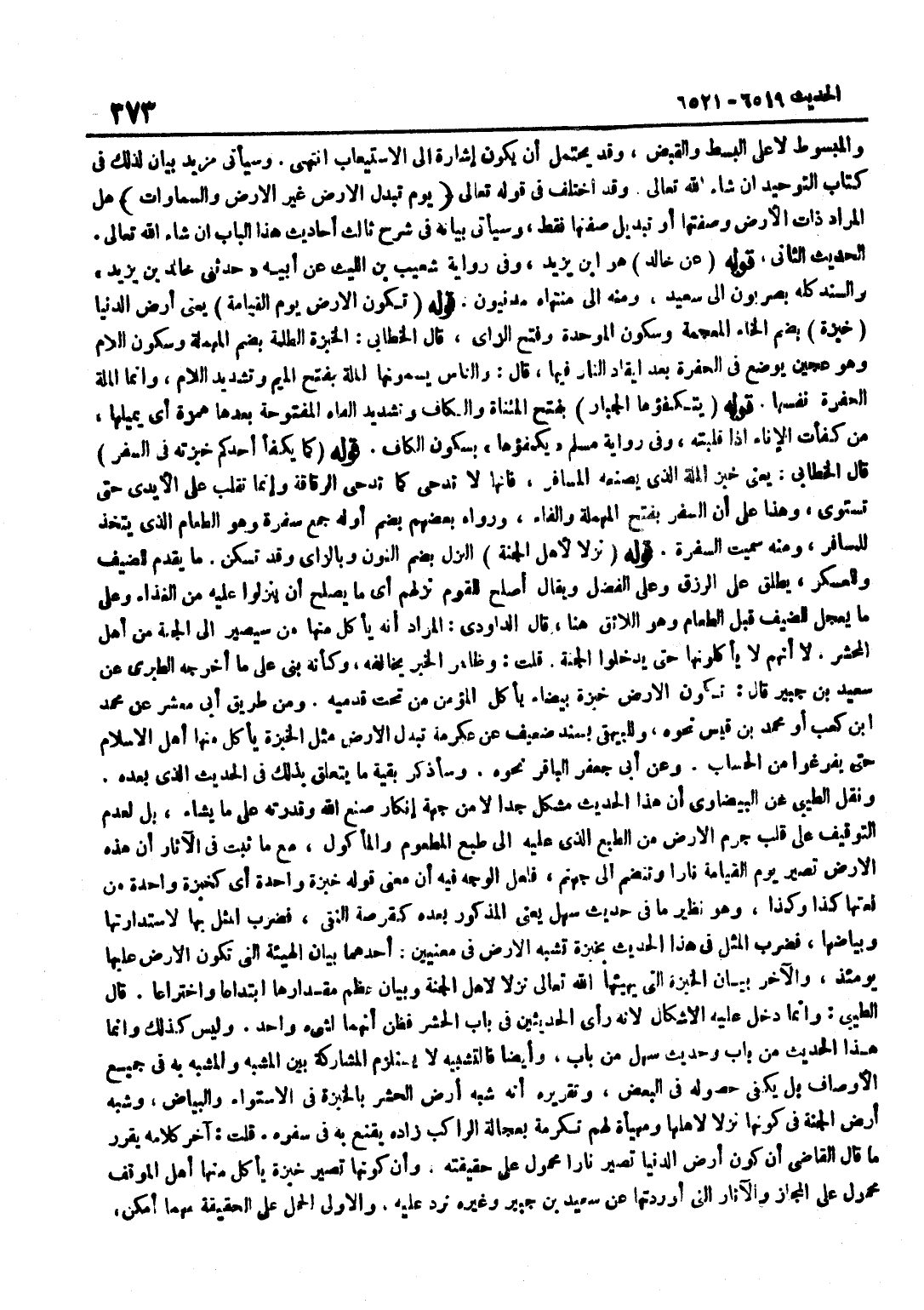[6520] قَوْلُهُ عَن خَالِد هُوَ بن يَزِيدَ وَفِي رِوَايَةِ شُعَيْبِ بْنِ اللَّيْثِ عَنْ أَبِيهِ حَدَّثَنِي خَالِدُ بْنُ يَزِيدَ وَالسَّنَدُ كُلُّهُ بَصْرِيُّونَ إِلَى سَعِيدٍ وَمِنْهُ إِلَى مُنْتَهَاهُ مَدَنِيُّونَ قَوْلُهُ تَكُونُ الْأَرْضُ يَوْمَ الْقِيَامَةِ يَعْنِي أَرْضَ الدُّنْيَا خبْزَة بِضَم الْخَاء الْمُعْجَمَةِ وَسُكُونِ الْمُوَحَّدَةِ وَفَتْحِ الزَّايِ قَالَ الْخَطَّابِيُّ الْخُبْزَةُ الطُّلْمَةُ بِضَمِّ الْمُهْمَلَةِ وَسُكُونِ اللَّامِ وَهُوَ عَجِينٌ يُوضَعُ فِي الْحُفْرَةِ بَعْدَ إِيقَادِ النَّارِ فِيهَا قَالَ وَالنَّاسُ يُسَمُّونَهَا الْمَلَّةَ بِفَتْحِ الْمِيمِ وَتَشْدِيدِ اللَّامِ وَإِنَّمَا الْمَلَّةُ الْحُفْرَةُ نَفْسُهَا قَوْلُهُ يَتَكَفَّؤُهَا الْجَبَّارُ بِفَتْحِ الْمُثَنَّاةِ وَالْكَافِ وَتَشْدِيدِ الْفَاءِ الْمَفْتُوحَةِ بَعْدَهَا هَمْزَةٌ أَيْ يَمِيلُهَا مِنْ كَفَأْتُ الْإِنَاءَ إِذَا قَلَّبْتُهُ وَفِي رِوَايَةِ مُسْلِمٍ يَكْفَؤُهَا بِسُكُونِ الْكَافِ قَوْلُهُ كَمَا يَكْفَأُ أَحَدُكُمْ خُبْزَتَهُ فِي السَّفَرِ قَالَ الْخَطَّابِيُّ يَعْنِي خُبْزَ الْمَلَّةِ الَّذِي يَصْنَعُهُ الْمُسَافِرُ فَإِنَّهَا لَا تُدْحَى كَمَا تُدْحَى الرُّقَاقَةُ وَإِنَّمَا تُقَلَّبُ عَلَى الْأَيْدِي حَتَّى تَسْتَوِيَ وَهَذَا عَلَى أَنَّ السَّفَرَ بِفَتْحِ الْمُهْمَلَةِ وَالْفَاءِ وَرَوَاهُ بَعْضُهُمْ بِضَمِّ أَوَّلِهِ جَمْعُ سُفْرَةٍ وَهُوَ الطَّعَامُ الَّذِي يُتَّخَذُ لِلْمُسَافِرِ وَمِنْهُ سُمِّيَتِ السُّفْرَةُ قَوْلُهُ نُزُلًا لِأَهْلِ الْجَنَّةِ النُّزُلُ بِضَمِّ النُّونِ وَبِالزَّايِ وَقَدْ تُسَكَّنُ مَا يُقَدَّمُ لِلضَّيْفِ وَلِلْعَسْكَرِ يُطْلَقُ عَلَى الرِّزْقِ وَعَلَى الْفَضْلِ وَيُقَالُ أَصْلَحَ لِلْقَوْمِ نُزُلَهُمْ أَيْ مَا يَصْلُحُ أَنْ يَنْزِلُوا عَلَيْهِ مِنَ الْغِذَاءِ وَعَلَى مَا يُعَجَّلُ لِلضَّيْفِ قَبْلَ الطَّعَامِ وَهُوَ اللَّائِقُ هُنَا قَالَ الدَّاوُدِيُّ الْمُرَادُ أَنَّهُ يَأْكُلُ مِنْهَا مَنْ سَيَصِيرُ إِلَى الْجَنَّةِ مِنْ أَهْلِ الْمَحْشَرِ لَا أَنَّهُمْ لَا يَأْكُلُونَهَا حَتَّى يَدْخُلُوا الْجَنَّةَ قُلْتُ وَظَاهِرُ الْخَبَرِ يُخَالِفُهُ وَكَأَنَّهُ بَنَى عَلَى مَا أَخْرَجَهُ الطَّبَرِيُّ عَنْ سَعِيدِ بْنِ جُبَيْرٍ قَالَ تَكُونُ الْأَرْضُ خُبْزَةً بَيْضَاءَ يَأْكُلُ الْمُؤْمِنُ مِنْ تَحْتِ قَدَمَيْهِ وَمِنْ طَرِيقِ أَبِي مَعْشَرٍ عَنْ مُحَمَّدِ بْنِ كَعْبٍ أَوْ مُحَمَّدِ بْنِ قَيْسٍ نَحْوَهُ وَلِلْبَيْهَقِيِّ بِسَنَدٍ ضَعِيفٍ عَنْ عِكْرِمَةَ تُبَدَّلُ الْأَرْضُ مِثْلَ الْخُبْزَةِ يَأْكُلُ مِنْهَا أَهْلُ الْإِسْلَامِ حَتَّى يَفْرَغُوا مِنَ الْحِسَابِ وَعَنْ أَبِي جَعْفَرٍ الْبَاقِرِ نَحْوُهُ وَسَأَذْكُرُ بَقِيَّةَ مَا يَتَعَلَّقُ بِذَلِكَ فِي الْحَدِيثِ الَّذِي بَعْدَهُ وَنَقَلَ الطِّيبِيُّ عَنِ الْبَيْضَاوِيِّ أَنَّ هَذَا الْحَدِيثَ مُشْكِلٌ جِدًّا لَا مِنْ جِهَةِ إِنْكَارِ صُنْعِ اللَّهِ وَقُدْرَتِهِ عَلَى مَا يَشَاءُ بَلْ لِعَدَمِ التَّوْقِيفِ عَلَى قَلْبِ جِرْمِ الْأَرْضِ مِنَ الطَّبْعِ الَّذِي عَلَيْهِ إِلَى طَبْعِ الْمَطْعُومِ وَالْمَأْكُولِ مَعَ مَا ثَبَتَ فِي الْآثَارِ أَنَّ هَذِهِ الْأَرْضَ تَصِيرُ يَوْمَ الْقِيَامَةِ نَارًا وَتَنْضَمُّ إِلَى جَهَنَّمَ فَلَعَلَّ الْوَجْهَ فِيهِ أَنَّ مَعْنَى قَوْلِهِ خُبْزَةً وَاحِدَةً أَيْ كَخُبْزَةٍ وَاحِدَةٍ مِنْ نَعْتِهَا كَذَا وَكَذَا وَهُوَ نَظِيرُ مَا فِي حَدِيثِ سَهْلٍ يَعْنِي الْمَذْكُورَ بَعْدَهُ كَقُرْصَةِ النَّقِيَّ فَضَرَبَ الْمَثَلَ بِهَا لِاسْتِدَارَتِهَا وَبَيَاضِهَا فَضَرْبُ الْمَثَلِ فِي هَذَا الْحَدِيثِ بِخُبْزَةٍ تُشْبِهُ الْأَرْضَ فِي م