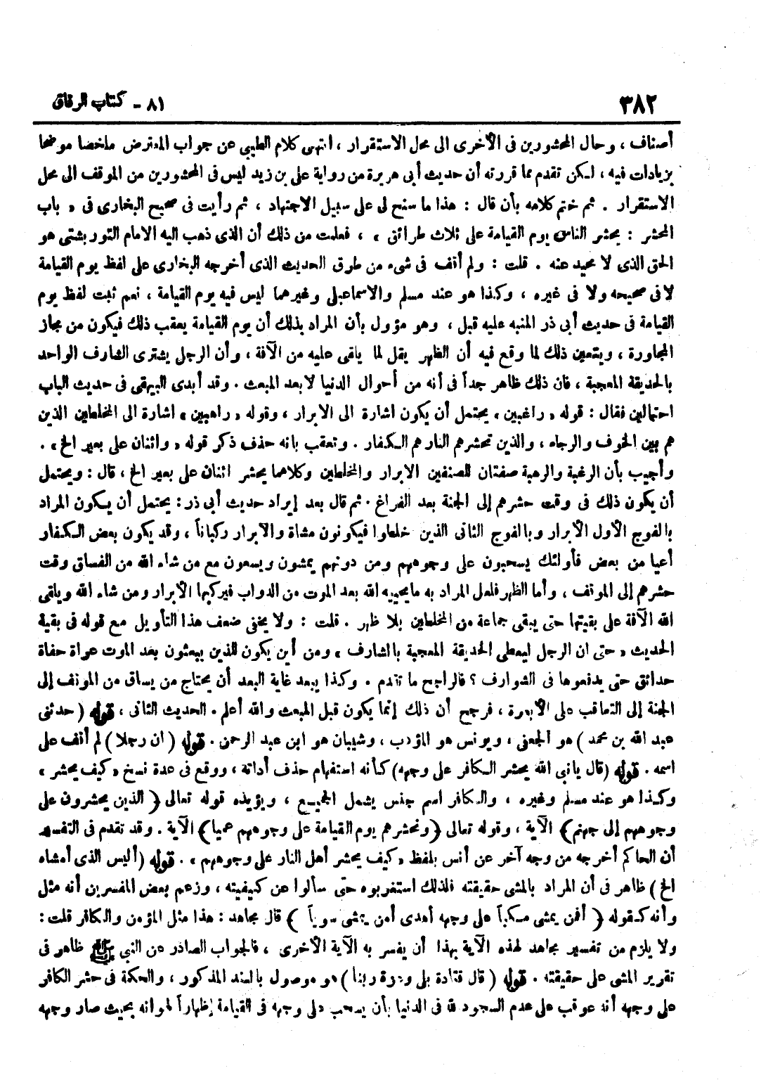 أَصْنَافٍ وَحَالُ الْمَحْشُورِينَ فِي الْأُخْرَى إِلَى مَحِلِّ الِاسْتِقْرَارِ انْتَهَى كَلَامُ الطَّيِّبِيِّ عَنْ جَوَابِ الْمُعْتَرِضِ مُلَخَّصًا مُوَضَّحًا بِزِيَادَاتٍ فِيهِ لَكِنْ تَقَدَّمَ مِمَّا قَرَّرْتُهُ أَنَّ حَدِيثَ أَبِي هُرَيْرَةَ مِنْ رِوَايَةِ عَلِيِّ بْنِ زَيْدٍ لَيْسَ فِي الْمَحْشُورِينَ مِنَ الْمَوْقِفِ إِلَى مَحِلِّ الِاسْتِقْرَارِ ثُمَّ خَتَمَ كَلَامَهُ بِأَنْ قَالَ هَذَا مَا سَنَحَ لِي عَلَى سَبِيلِ الِاجْتِهَادِ ثُمَّ رَأَيْتُ فِي صَحِيحِ الْبُخَارِيِّ فِي بَابِ الْمَحْشَرِ يُحْشَرُ النَّاسُ يَوْمَ الْقِيَامَةِ عَلَى ثَلَاثِ طَرَائِقَ فَعَلِمْتُ مِنْ ذَلِكَ أَنَّ الَّذِي ذَهَبَ إِلَيْهِ الْإِمَامُ التُّورِبِشْتِيُّ هُوَ الْحَقُّ الَّذِي لَا مَحِيدَ عَنْهُ قُلْتُ وَلَمْ أَقِفْ فِي شَيْءٍ مِنْ طُرُقِ الْحَدِيثِ الَّذِي أَخْرَجَهُ البُخَارِيّ على لفظ يَوْم الْقِيَامَة لافي صَحِيحِهِ وَلَا فِي غَيْرِهِ وَكَذَا هُوَ عِنْدَ مُسْلِمٍ وَالْإِسْمَاعِيلِيِّ وَغَيْرُهُمَا لَيْسَ فِيهِ يَوْمُ الْقِيَامَةِ نَعَمْ ثَبَتَ لَفْظُ يَوْمِ الْقِيَامَةِ فِي حَدِيثِ أَبِي ذَرٍّ الْمُنَبَّهِ عَلَيْهِ قَبْلُ وَهُوَ مُؤَوَّلٌ بِأَنَّ الْمُرَادَ بِذَلِكَ أَنَّ يَوْمَ الْقِيَامَةِ يَعْقُبُ ذَلِكَ فَيَكُونُ مِنْ مَجَازِ الْمُجَاوَرَةِ وَيَتَعَيَّنُ ذَلِكَ لِمَا وَقَعَ فِيهِ أَنَّ الظَّهْرَ يَقِلُّ لِمَا يُلْقَى عَلَيْهِ مِنَ الْآفَةِ وَأَنَّ الرَّجُلَ يَشْتَرِي الشَّارِفَ الْوَاحِدَ بِالْحَدِيقَةِ الْمُعْجَبَةِ فَإِنَّ ذَلِكَ ظَاهِرٌ جِدًّا فِي أَنَّهُ مِنْ أَحْوَالِ الدُّنْيَا لَا بَعْدَ الْمَبْعَثِ وَقَدْ أَبْدَى الْبَيْهَقِيُّ فِي حَدِيثِ الْبَابِ احْتِمَالَيْنِ فَقَالَ قَوْلُهُ رَاغِبِينَ يَحْتَمِلُ أَنْ يَكُونَ إِشَارَةً إِلَى الْأَبْرَارِ وَقَوْلُهُ رَاهِبِينَ إِشَارَةً إِلَى الْمُخَلَّطِينَ الَّذِينَ هُمْ بَيْنَ الْخَوْفِ وَالرَّجَاءِ وَالَّذِينَ تَحْشُرُهُمُ النَّارُ هُمُ الْكُفَّارُ وَتُعُقِّبَ بِأَنَّهُ حَذَفَ ذِكْرَ قَوْلِهِ وَاثْنَانِ عَلَى بَعِيرٍ إِلَخْ وَأُجِيبَ بِأَنَّ الرَّغْبَةَ وَالرَّهْبَةَ صِفَتَانِ لِلصِّنْفَيْنِ الْأَبْرَارِ وَالْمُخَلَّطِينَ وَكِلَاهُمَا يُحْشَرُ اثْنَانِ عَلَى بَعِيرٍ إِلَخْ قَالَ وَيَحْتَمِلُ أَنْ يَكُونَ ذَلِكَ فِي وَقْتِ حَشْرِهِمْ إِلَى الْجَنَّةِ بَعْدَ الْفَرَاغِ ثُمَّ قَالَ بَعْدَ إِيرَادِ حَدِيثِ أَبِي ذَرٍّ يَحْتَمِلُ أَنْ يَكُونَ الْمُرَادُ بِالْفَوْجِ الْأَوَّلِ الْأَبْرَارَ وَبِالْفَوْجِ الثَّانِي الَّذِينَ خَلَّطُوا فَيَكُونُونَ مُشَاةً وَالْأَبْرَارُ رُكْبَانًا وَقَدْ يَكُونُ بَعْضُ الْكُفَّارِ أَعْيَا مِنْ بَعْضٍ فَأُولَئِكَ يُسْحَبُونَ عَلَى وُجُوهِهِمْ وَمَنْ دُونَهُمْ يَمْشُونَ وَيَسْعَوْنَ مَعَ مَنْ شَاءَ اللَّهُ مِنَ الْفُسَّاقِ وَقْتَ حَشْرِهِمْ إِلَى الْمَوْقِفِ وَأَمَّا الظَّهْرُ فَلَعَلَّ الْمُرَادَ بِهِ مَا يُحْيِهِ اللَّهُ بَعْدَ الْمَوْتِ مِنَ الدَّوَابِّ فَيَرْكَبُهَا الْأَبْرَارُ وَمَنْ شَاءَ اللَّهُ وَيُلْقِي اللَّهُ الْآفَةَ عَلَى بَقِيَّتِهَا حَتَّى يَبْقَى جَمَاعَةٌ مِنَ الْمُخَلَّطِينَ بِلَا ظَهْرٍ قُلْتُ وَلَا يَخْفَى ضَعْفُ هَذَا التَّأْوِيلِ مَعَ قَوْلِهِ فِي بَقِيَّةِ الْحَدِيثِ حَتَّى إِنَّ الرَّجُلَ لِيُعْطِيَ الْحَدِيقَةَ الْمُعْجَبَةَ بِالشَّارِفِ وَمِنْ أَيْنَ يَكُونُ لِلَّذِينَ يُبْعَثُونَ بَعْدَ الْمَوْتِ عُرَاةً حُفَاةً حَدَائِقَ حَتَّى يَدْفَعُوهَا فِي الشَّوَارِفِ فَالرَّاجِحُ مَا تَقَدَّمَ وَكَذَا يَبْعُدُ غَايَةَ الْبُعْدِ أَنْ يَحْتَاجَ مَنْ يُسَاقُ مِنَ الْمَوْقِفِ إِلَى الْجَنَّةِ إِلَى التَّعَاقُبِ عَلَى الْأَبْعِرَةِ فَرَجَحَ أَنَّ ذ