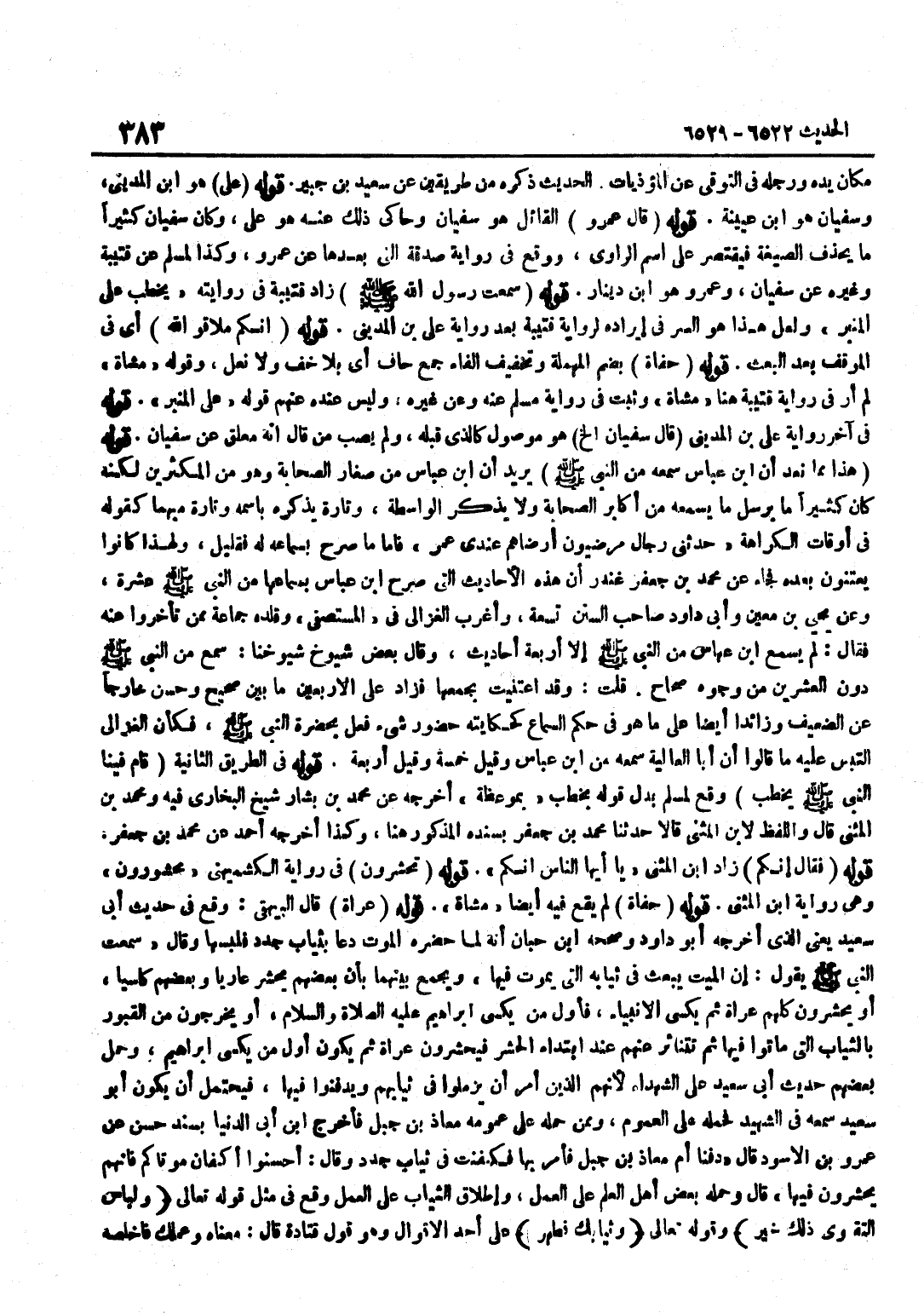 [6525] قَالَ سُفْيَانُ إِلَخْ هُوَ مَوْصُولٌ كَالَّذِي قَبْلَهُ وَلَمْ يُصِبْ مَنْ قَالَ إِنَّهُ مُعَلَّقٌ عَنْ سُفْيَانَ قَوْلُهُ هَذَا مِمَّا نَعُدُّ أَنَّ بن عَبَّاسٍ سَمِعَهُ مِنَ النَّبِيِّ صَلَّى اللَّهُ عَلَيْهِ وَسَلَّمَ يُرِيدُ أَنْ بن عَبَّاسٍ مِنْ صِغَارِ الصَّحَابَةِ وَهُوَ مِنَ الْمُكْثِرِينَ لَكِنَّهُ كَانَ كَثِيرًا مَا يُرْسِلُ مَا يَسْمَعُهُ مِنْ أَكَابِرِ الصَّحَابَةِ وَلَا يَذْكُرُ الْوَاسِطَةَ وَتَارَةً يَذْكُرُهُ بِاسْمِهِ وَتَارَةً مُبْهَمًا كَقَوْلِهِ فِي أَوْقَاتِ الْكَرَاهَةِ حَدَّثَنِي رِجَالٌ مَرْضِيُّونَ أَرْضَاهُمْ عِنْدِي عُمَرُ فَأَمَّا مَا صَرَّحَ بِسَمَاعِهِ لَهُ فَقَلِيلٌ وَلِهَذَا كَانُوا يَعْتَنُونَ بَعْدَهُ فَجَاءَ عَنْ مُحَمَّدِ بْنِ جَعْفَرٍ غُنْدَرٍ أَنَّ هَذِهِ الْأَحَادِيثَ الَّتِي صَرَّحَ بن عَبَّاسٍ بِسَمَاعِهَا مِنَ النَّبِيِّ صَلَّى اللَّهُ عَلَيْهِ وَسَلَّمَ عَشَرَةٌ وَعَنْ يَحْيَى بْنِ مَعِينٍ وَأَبِي دَاوُدَ صَاحِبِ السُّنَنِ تِسْعَةٌ وَأَغْرَبَ الْغَزَالِيُّ فِي الْمُسْتَصْفَى وَقَلَّدَهُ جَمَاعَةٌ مِمَّنْ تَأَخَّرُوا عَنْهُ فَقَالَ لم يسمع بن عَبَّاسٍ مِنَ النَّبِيِّ صَلَّى اللَّهُ عَلَيْهِ وَسَلَّمَ إِلَّا أَرْبَعَةَ أَحَادِيثَ وَقَالَ بَعْضُ شُيُوخِ شُيُوخِنَا سَمِعَ مِنَ النَّبِيِّ صَلَّى اللَّهُ عَلَيْهِ وَسَلَّمَ دُونَ الْعِشْرِينَ مِنْ وُجُوهٍ صِحَاحٍ قُلْتُ وَقَدِ اعْتَنَيْتُ بِجَمْعِهَا فَزَادَ عَلَى الْأَرْبَعِينَ مَا بَيْنَ صَحِيحٍ وَحَسْنٍ خَارِجًا عَنِ الضَّعِيفِ وَزَائِدًا أَيْضًا عَلَى مَا هُوَ فِي حُكْمِ السَّمَاعِ كَحِكَايَتِهِ حُضُورَ شَيْءٍ فُعِلَ بِحَضْرَةِ النَّبِيِّ صَلَّى اللَّهُ عَلَيْهِ وَسَلَّمَ فَكَأَنَّ الْغَزَالِيَّ الْتَبَسَ عَلَيْهِ مَا قَالُوا أَن أَبَا الْعَالِيَة سَمعه من بن عَبَّاس وَقيل خَمْسَة وَقيل أَرْبَعَة