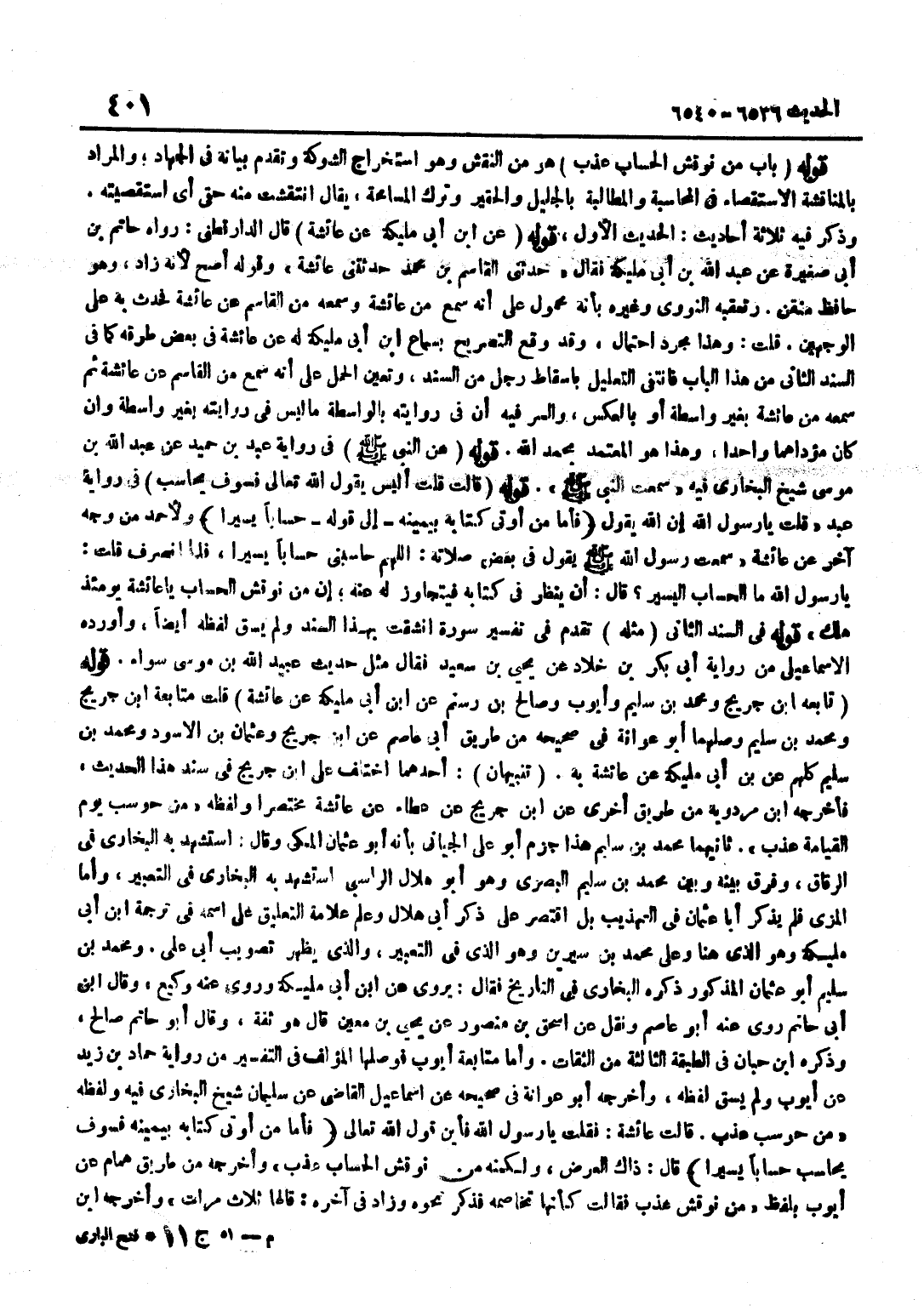 [6536] قَوْله عَن بن أَبِي مُلَيْكَةَ عَنْ عَائِشَةَ قَالَ الدَّارَقُطْنِيُّ رَوَاهُ حَاتِمُ بْنُ أَبِي صَغِيرَةَ عَنْ عَبْدِ اللَّهِ بْنِ أَبِي مُلَيْكَةَ فَقَالَ حَدَّثَنِي الْقَاسِمُ بْنُ مُحَمَّدٍ حَدَّثَتْنِي عَائِشَةُ وَقَوْلُهُ أَصَحُّ لِأَنَّهُ زَادَ وَهُوَ حَافِظٌ مُتْقِنٌ وَتَعَقَّبَهُ النَّوَوِيُّ وَغَيْرُهُ بِأَنَّهُ مَحْمُولٌ عَلَى أَنَّهُ سَمِعَ مِنْ عَائِشَةَ وَسَمِعَهُ مِنَ الْقَاسِمِ عَنْ عَائِشَةَ فَحَدَّثَ بِهِ عَلَى الْوَجْهَيْنِ قُلْتُ وَهَذَا مُجَرَّدُ احْتِمَالٍ وَقَدْ وَقَعَ التَّصْرِيح بِسَمَاع بن أَبِي مُلَيْكَةَ لَهُ عَنْ عَائِشَةَ فِي بَعْضِ طُرُقِهِ كَمَا فِي السَّنَدِ الثَّانِي مِنْ هَذَا الْبَابِ فَانْتَفَى التَّعْلِيلُ بِإِسْقَاطِ رَجُلٍ مِنَ السَّنَدِ وَتَعَيَّنَ الْحَمْلُ عَلَى أَنَّهُ سَمِعَ مِنَ الْقَاسِمِ عَنْ عَائِشَةَ ثُمَّ سَمِعَهُ مِنْ عَائِشَةَ بِغَيْرِ وَاسِطَةٍ أَوْ بِالْعَكْسِ وَالسِّرُّ فِيهِ أَنَّ فِي رِوَايَتِهِ بِالْوَاسِطَةِ مَا لَيْسَ فِي رِوَايَتِهِ بِغَيْرِ وَاسِطَةٍ وَإِنْ كَانَ مُؤَدَّاهُمَا وَاحِدًا وَهَذَا هُوَ الْمُعْتَمَدُ بِحَمْدِ اللَّهِ قَوْلُهُ عَنِ النَّبِيِّ صَلَّى اللَّهُ عَلَيْهِ وَسَلَّمَ فِي رِوَايَةِ عَبْدِ بْنِ حُمَيْدٍ عَنْ عَبْدِ اللَّهِ بْنِ مُوسَى شَيْخِ الْبُخَارِيِّ فِيهِ سَمِعْتُ النَّبِيِّ صَلَّى اللَّهُ عَلَيْهِ وَسَلَّمَ قَوْلُهُ قَالَتْ قُلْتُ أَلَيْسَ يَقُولُ اللَّهُ تَعَالَى فَسَوف يُحَاسب فِي رِوَايَةِ عَبْدٍ قُلْتُ يَا رَسُولَ اللَّهِ إِنَّ اللَّهَ يَقُولُ فَأَمَّا مَنْ أُوتِيَ كِتَابَهُ بِيَمِينِهِ إِلَى قَوْله حسابا يَسِيرا وَلِأَحْمَدَ مِنْ وَجْهٍ آخَرَ عَنْ عَائِشَةَ سَمِعْتُ رَسُولَ اللَّهِ صَلَّى اللَّهُ عَلَيْهِ وَسَلَّمَ يَقُولُ فِي بَعْضِ صَلَاتِهِ اللَّهُمَّ حَاسِبْنِي حِسَابًا يَسِيرًا فَلَمَّا انْصَرَفَ قُلْتُ يَا رَسُولَ اللَّهِ مَا الْحِسَابُ الْيَسِيرُ قَالَ أَنْ يَنْظُرَ فِي كِتَابِهِ فَيَتَجَاوَزَ لَهُ عَنْهُ إِنَّ مَنْ نُوقِشَ الْحِسَابَ يَا عَائِشَةُ يَوْمَئِذٍ هَلَكَ قَوْلُهُ فِي السَّنَدِ الثَّانِي مِثْلُهُ تَقَدَّمَ فِي تَفْسِيرِ سُورَةِ انْشَقَّتْ بِهَذَا السَّنَدِ وَلَمْ يَسُقْ لَفْظَهُ أَيْضًا وَأَوْرَدَهُ الْإِسْمَاعِيلِيُّ مِنْ رِوَايَةِ أَبِي بَكْرِ بْنِ خَلَّادٍ عَنْ يَحْيَى بْنِ سَعِيدٍ فَقَالَ مِثْلَ حَدِيثِ عُبَيْدِ اللَّهِ بْنِ مُوسَى سَوَاءٌ قَوْلُهُ تَابَعَهُ بن جُرَيْجٍ وَمُحَمَّدُ بْنُ سُلَيْمٍ وَأَيُّوبُ وَصَالِحُ بْنُ رستم عَن بن أبي مليكَة عَن عَائِشَة قلت مُتَابعَة بن جُرَيْجٍ وَمُحَمَّدِ بْنِ سُلَيْمٍ وَصَلَهُمَا أَبُو عَوَانَةَ فِي صَحِيحِهِ مِنْ طَرِيقِ أَبِي عَاصِمٍ عَنِ بن جُرَيْجٍ وَعُثْمَانَ بْنِ الْأَسْوَدِ وَمُحَمَّدِ بْنِ سُلَيْمٍ كلهم عَن بن أَبِي مُلَيْكَةَ عَنْ عَائِشَةَ بِهِ تَنْبِيهَانِ أَحَدُهُمَا اخْتلف على بن جريج فِي سَنَد هَذَا الحَدِيث فَأخْرجهُ بن مرْدَوَيْه من طَرِيق أُخْرَى عَن بن جُرَيْجٍ عَنْ عَطَاءٍ عَنْ عَائِشَةَ مُخْتَصَرًا وَلَفْظُهُ مَنْ حُوسِبَ يَوْمَ الْقِيَامَةِ عُذِّبَ ثَانِيهِمَا مُحَمَّدُ بْنُ سُلَيْمٍ هَذَا جَزَمَ أَبُو عَلِيٍّ الْجَيَّانِيُّ بِأَنَّهُ أَبُو عُثْمَانَ الْمَكِّيُّ وَقَالَ اسْتَشْهَدَ بِهِ الْبُخَارِيُّ فِي الرِّقَاقِ وَفَرَّقَ بَيْنَهُ وَبَيْنَ مُحَمَّدِ بْنِ سُلَيْمٍ الْبَصْرِيِّ وَهُوَ أَبُو هِلَالٍ الرَّاسِبِيُّ اسْتَشْهَدَ بِهِ الْبُخَارِيُّ فِي التَّعْبِيرِ وَأَمَّا الْمِزِّيُّ فَلَمْ يَذْكُرْ أَبَا عُثْمَانَ فِي التَّهْذِيبِ بَلِ اقْتَصَرَ عَلَى ذِكْرِ أَبِي هِلَالٍ وَعَلَّمَ عَلَامَةَ التَّعْلِيق على اسْمه فِي تَرْجَمَة بن أَبِي مُلَيْكَةَ وَهُوَ الَّذِي هُنَا 