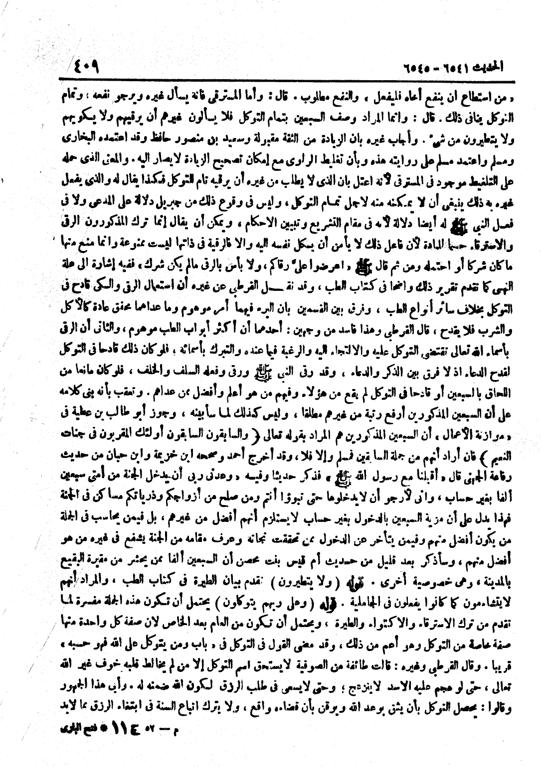 مَنِ اسْتَطَاعَ أَنْ يَنْفَعَ أَخَاهُ فَلْيَفْعَلْ وَالنَّفْعُ مَطْلُوبٌ قَالَ وَأَمَّا الْمُسْتَرِقِي فَإِنَّهُ يَسْأَلُ غَيْرَهُ وَيَرْجُو نَفْعَهُ وَتَمَامُ التَّوَكُّلِ يُنَافِي ذَلِكَ قَالَ وَإِنَّمَا الْمُرَادُ وَصْفُ السَّبْعِينَ بِتَمَامِ التَّوَكُّلِ فَلَا يَسْأَلُونَ غَيْرَهُمْ أَنْ يَرْقِيَهُمْ وَلَا يَكْوِيَهُمْ وَلَا يَتَطَيَّرُونَ مِنْ شَيْءٍ وَأَجَابَ غَيْرُهُ بِأَنَّ الزِّيَادَةَ مِنَ الثِّقَةِ مَقْبُولَةٌ وَسَعِيدُ بْنُ مَنْصُورٍ حَافِظٌ وَقَدِ اعْتَمَدَهُ الْبُخَارِيُّ وَمُسْلِمٌ وَاعْتَمَدَ مُسْلِمٌ عَلَى رِوَايَتِهِ هَذِهِ وَبِأَنَّ تَغْلِيطَ الرَّاوِي مَعَ إِمْكَانِ تَصْحِيحِ الزِّيَادَةِ لَا يُصَارُ إِلَيْهِ وَالْمَعْنَى الَّذِي حَمَلَهُ عَلَى التَّغْلِيطِ مَوْجُودٌ فِي الْمُسْتَرِقِي لِأَنَّهُ اعْتَلَّ بِأَنَّ الَّذِي لَا يَطْلُبُ مِنْ غَيْرِهِ أَنْ يَرْقِيَهُ تَامُّ التَّوَكُّلِ فَكَذَا يُقَالُ لَهُ وَالَّذِي يَفْعَلُ غَيْرُهُ بِهِ ذَلِكَ يَنْبَغِي أَنْ لَا يُمَكِّنَهُ مِنْهُ لِأَجْلِ تَمَامِ التَّوَكُّلِ وَلَيْسَ فِي وُقُوعِ ذَلِكَ مِنْ جِبْرِيلَ دَلَالَةٌ عَلَى الْمُدَّعَى وَلَا فِي فِعْلِ النَّبِيِّ صَلَّى اللَّهُ عَلَيْهِ وَسَلَّمَ لَهُ أَيْضًا دَلَالَةٌ لِأَنَّهُ فِي مقَام التشريع وتبيين الْأَحْكَامِ وَيُمْكِنُ أَنْ يُقَالَ إِنَّمَا تَرَكَ الْمَذْكُورُونَ الرُّقَى وَالِاسْتِرْقَاءَ حَسْمًا لِلْمَادَّةِ لِأَنَّ فَاعِلَ ذَلِكَ لَا يَأْمَنُ أَنْ يَكِلَ نَفْسَهُ إِلَيْهِ وَإِلَّا فَالرُّقْيَةُ فِي ذَاتِهَا لَيْسَتْ مَمْنُوعَةً وَإِنَّمَا مُنِعَ مِنْهَا مَا كَانَ شِرْكًا أَوِ احْتَمَلَهُ وَمِنْ ثَمَّ قَالَ صَلَّى اللَّهُ عَلَيْهِ وَسَلَّمَ اعْرِضُوا عَلَيَّ رُقَاكُمْ وَلَا بَأْسَ بِالرُّقَى مَا لَمْ يَكُنْ شِرْكٌ فَفِيهِ إِشَارَةٌ إِلَى عِلَّةِ النَّهْيِ كَمَا تَقَدَّمَ تَقْرِيرُ ذَلِكَ وَاضِحًا فِي كِتَابِ الطِّبِّ وَقَدْ نَقَلَ الْقُرْطُبِيُّ عَنْ غَيْرِهِ أَنَّ اسْتِعْمَالَ الرُّقَى وَالْكَيِّ قَادِحٌ فِي التَّوَكُّلِ بِخِلَافِ سَائِرِ أَنْوَاعِ الطِّبِّ وَفُرِّقَ بَيْنَ الْقِسْمَيْنِ بِأَنَّ الْبُرْءَ فِيهِمَا أَمْرٌ مَوْهُومٌ وَمَا عَدَاهُمَا مُحَقَّقٌ عَادَةً كَالْأَكْلِ وَالشُّرْبِ فَلَا يَقْدَحُ قَالَ الْقُرْطُبِيُّ وَهَذَا فَاسِدٌ مِنْ وَجْهَيْنِ أَحَدُهُمَا أَنَّ أَكْثَرَ أَبْوَابِ الطِّبِّ مَوْهُومٌ وَالثَّانِي أَنَّ الرُّقَى بِأَسْمَاءِ اللَّهِ تَعَالَى تَقْتَضِي التَّوَكُّلَ عَلَيْهِ وَالِالْتِجَاءَ إِلَيْهِ وَالرَّغْبَةَ فِيمَا عِنْدَهُ وَالتَّبَرُّكَ بِأَسْمَائِهِ فَلَوْ كَانَ ذَلِكَ قَادِحًا فِي التَّوَكُّلِ لَقَدَحَ الدُّعَاءُ إِذْ لَا فَرْقَ بَيْنَ الذِّكْرِ وَالدُّعَاءِ وَقَدْ رُقِيَ النَّبِيُّ صَلَّى اللَّهُ عَلَيْهِ وَسَلَّمَ وَرَقَى وَفَعَلَهُ السَّلَفُ وَالْخَلَفُ فَلَوْ كَانَ مَانِعًا مِنَ اللَّحَاقِ بِالسَّبْعِينَ أَوْ قَادِحًا فِي التَّوَكُّلِ لَمْ يَقَعْ مِنْ هَؤُلَاءِ وَفِيهِمْ مَنْ هُوَ أَعْلَمُ وَأَفْضَلُ مِمَّنْ عَدَاهُمْ وَتُعُقِّبَ بِأَنَّهُ بَنَى كَلَامَهُ عَلَى أَنَّ السَّبْعِينَ الْمَذْكُورِينَ أَرْفَعُ رُتْبَةً مِنْ غَيْرِهِمْ مُطْلَقًا وَلَيْسَ كَذَلِكَ لِمَا سَأُبَيِّنُهُ وَجَوَّزَ أَبُو طَالِبِ بْنُ عَطِيَّةَ فِي مُوَازَنَةِ الْأَعْمَالِ أَنَّ السَّبْعِينَ الْمَذْكُورِينَ هُمُ الْمُرَادُ بِقَوْلِهِ تَعَالَى وَالسَّابِقُونَ السَّابِقُونَ أُولَئِكَ المقربون فِي جنَّات النَّعيم فَإِنْ أَرَادَ أَنَّهُمْ مِنْ جُمْلَةِ السَّابِقِينَ فَمُسَلَّمٌ والا فَلَا وَقد اخْرُج احْمَد وَصَححهُ بن خُزَيْمَة وبن حِبَّانَ مِنْ حَدِيثِ رِفَاعَةَ الْجُهَنِيِّ قَالَ أَقْبَلْنَا مَعَ 