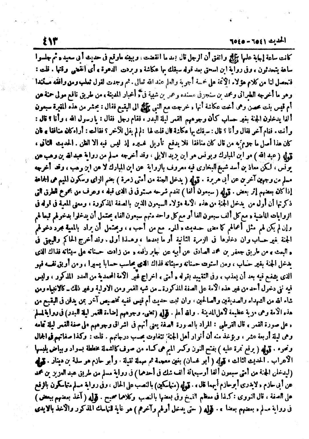 [6543] قَوْلُهُ أَبُو غَسَّانَ بِغَيْنٍ مُعْجَمَةٍ ثُمَّ مُهْمَلَةٍ ثَقِيلَةٍ أَبُو حَازِمٍ هُوَ سَلَمَةُ بْنُ دِينَارٍ قَوْلُهُ لَيَدْخُلَنَّ الْجَنَّةَ مِنْ أُمَّتِي سَبْعُونَ أَلْفًا أَوْ سَبْعمِائَةِ أَلْفٍ شَكَّ فِي أَحَدِهِمَا فِي رِوَايَةِ مُسْلِمٍ مِنْ طَرِيقِ عَبْدِ الْعَزِيزِ بْنِ مُحَمَّدٍ عَنْ أَبِي حَازِمٍ لَا يَدْرِي أَبُو حَازِمٍ أَيَّهُمَا قَالَ قَوْلُهُ مُتَمَاسِكِينَ بِالنَّصْبِ عَلَى الْحَالِ وَفِي رِوَايَةِ مُسْلِمٍ مُتَمَاسِكُونَ بِالرَّفْعِ عَلَى الصِّفَةِ قَالَ النَّوَوِيُّ كَذَا فِي مُعْظَمِ النُّسَخِ وَفِي بَعْضِهَا بِالنَّصْبِ وَكِلَاهُمَا صَحِيحٌ قَوْلُهُ آخِذٌ بَعْضُهُمْ بِبَعْضٍ فِي رِوَايَةِ مُسْلِمٍ بَعْضُهُمْ بَعْضًا قَوْلُهُ حَتَّى يَدْخُلَ أَوَّلُهُمْ وَآخِرُهُمْ هُوَ غَايَةٌ لِلتَّمَاسُكِ الْمَذْكُورِ وَالْأَخْذ بِالْأَيْدِي