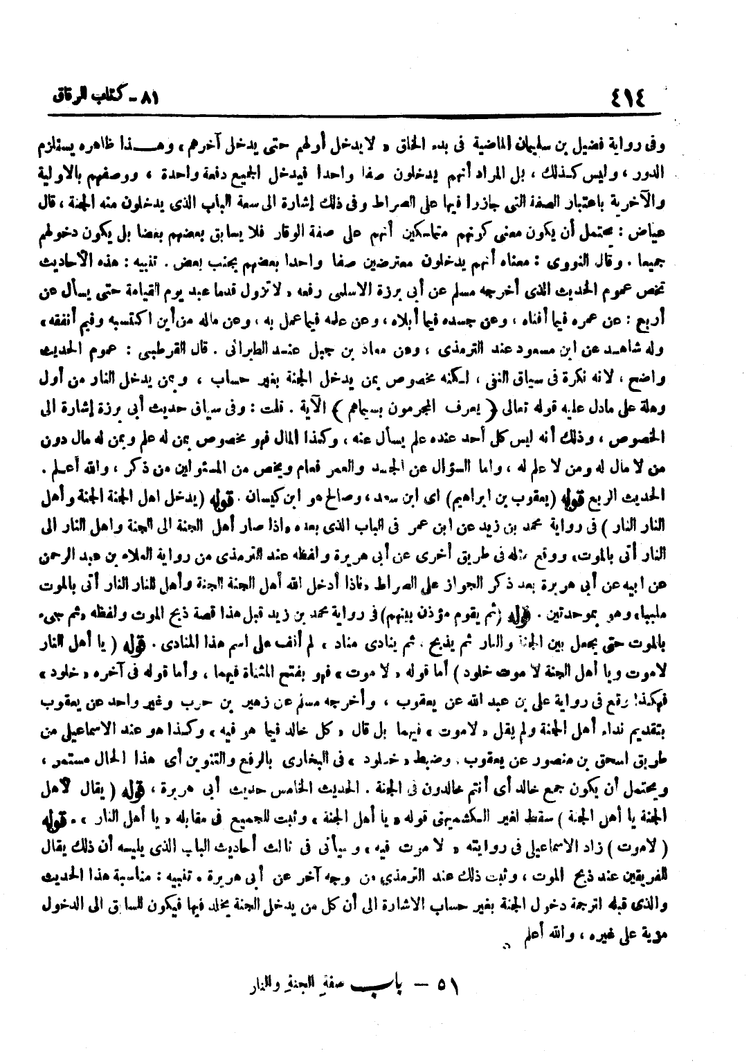 [6544] قَوْلُهُ يَعْقُوبُ بْنُ إِبْرَاهِيم أَي بن سعد وَصَالح هُوَ بن كَيْسَانَ قَوْلُهُ يَدْخُلُ أَهْلُ الْجَنَّةِ الْجَنَّةَ وَأَهْلُ النَّارِ النَّارَ فِي رِوَايَةِ مُحَمَّدِ بْنِ زَيْدٍ عَن بن عُمَرَ فِي الْبَابِ الَّذِي بَعْدَهُ إِذَا صَارَ أَهْلُ الْجَنَّةِ إِلَى الْجَنَّةِ وَأَهْلُ النَّارِ إِلَى النَّارِ أُتِيَ بِالْمَوْتِ وَوَقَعَ مِثْلُهُ فِي طَرِيقٍ أُخْرَى عَنْ أَبِي هُرَيْرَةَ وَلَفْظُهُ عِنْدَ التِّرْمِذِيِّ مِنْ رِوَايَةِ الْعَلَاءِ بْنِ عَبْدِ الرَّحْمَنِ عَنْ أَبِيهِ عَنْ أَبِي هُرَيْرَةَ بَعْدَ ذِكْرِ الْجَوَازِ عَلَى الصِّرَاطِ فَإِذَا أَدْخَلَ اللَّهُ أَهْلَ الْجَنَّةِ الْجنَّة وَأهل النَّار النَّار اتى بِالْمَوْتِ ملبيا وَهُوَ بِمُوَحَّدَتَيْنِ قَوْلُهُ ثُمَّ يَقُومُ مُؤَذِّنٌ بَيْنَهُمْ فِي رِوَايَة مُحَمَّد بن زيد قبل هَذَا قِصَّةُ ذَبْحِ الْمَوْتِ وَلَفْظُهُ ثُمَّ جِيءَ بِالْمَوْتِ حَتَّى يُجْعَلَ بَيْنَ الْجَنَّةِ وَالنَّارِ ثُمَّ يُذْبَحُ ثُمَّ يُنَادِي مُنَادٍ لَمْ أَقِفْ عَلَى اسْمِ هَذَا الْمُنَادِي قَوْلُهُ يَا أَهْلَ النَّارِ لَا مَوْتَ وَيَا أَهْلَ الْجَنَّةِ لَا مَوْتَ خُلُودٌ أَمَّا قَوْلُهُ لَا مَوْتَ فَهُوَ بِفَتْحِ الْمُثَنَّاةِ فِيهِمَا وَأَمَّا قَوْلُهُ فِي آخِرِهِ خُلُودٌ فَهَكَذَا وَقَعَ فِي رِوَايَةِ عَلِيِّ بْنِ عَبْدِ اللَّهِ عَنْ يَعْقُوبَ وَأَخْرَجَهُ مُسْلِمٌ عَنْ زُهَيْرِ بْنِ حَرْبٍ وَغَيْرِ وَاحِدٍ عَنْ يَعْقُوبَ بِتَقْدِيمِ نِدَاءِ أَهْلِ الْجَنَّةِ وَلَمْ يَقُلْ لَا مَوْتَ فِيهِمَا بَلْ قَالَ كُلٌّ خَالِدٌ فِيمَا هُوَ فِيهِ وَكَذَا هُوَ عِنْدَ الْإِسْمَاعِيلِيِّ مِنْ طَرِيقِ إِسْحَاقَ بْنِ مَنْصُورٍ عَنْ يَعْقُوبَ وَضَبْطُ خُلُودٌ فِي الْبُخَارِيِّ بِالرَّفْعِ وَالتَّنْوِينِ أَيْ هَذَا الْحَالُ مُسْتَمِرٌّ وَيَحْتَمِلُ أَنْ يَكُونَ جَمْعَ خَالِدٍ أَيْ أَنْتُمْ خَالِدُونَ فِي الْجَنَّةِ الْحَدِيثُ الخامسُ حديثُ أَبِي هُرَيْرَةَ