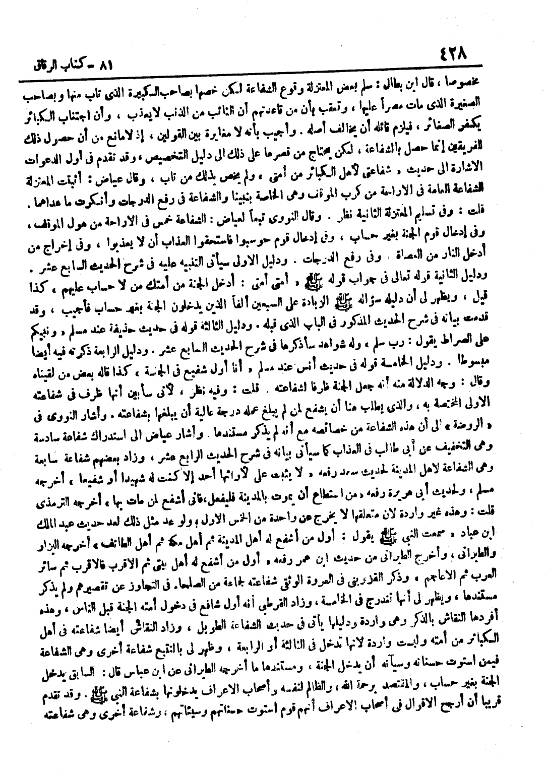 مَخْصُوصًا قَالَ بن بَطَّالٍ سَلَّمَ بَعْضُ الْمُعْتَزِلَةِ وُقُوعَ الشَّفَاعَةِ لَكِنْ خَصَّهَا بِصَاحِبِ الْكَبِيرَةِ الَّذِي تَابَ مِنْهَا وَبِصَاحِبِ الصَّغِيرَةِ الَّذِي مَاتَ مُصِرًّا عَلَيْهَا وَتُعُقِّبَ بِأَنَّ مِنْ قَاعِدَتِهِمْ أَنَّ التَّائِبَ مِنَ الذَّنْبِ لَا يُعَذَّبُ وَأَنَّ اجْتِنَابَ الْكَبَائِرِ يُكَفِّرُ الصَّغَائِرَ فَيَلْزَمُ قَائِلُهُ أَنْ يُخَالِفَ أَصْلَهُ وَأُجِيبَ بِأَنَّهُ لَا مُغَايَرَةَ بَيْنَ الْقَوْلَيْنِ إِذْ لَا مَانِعَ مِنْ أَنَّ حُصُولَ ذَلِكَ لِلْفَرِيقَيْنِ إِنَّمَا حَصَلَ بِالشَّفَاعَةِ لَكِنْ يَحْتَاجُ مَنْ قَصَرَهَا عَلَى ذَلِكَ إِلَى دَلِيلِ التَّخْصِيصِ وَقَدْ تَقَدَّمَ فِي أَوَّلِ الدَّعَوَاتِ الْإِشَارَةُ إِلَى حَدِيثِ شَفَاعَتِي لِأَهْلِ الْكَبَائِرِ مِنْ أُمَّتِي وَلَمْ يَخُصَّ بِذَلِكَ مَنْ تَابَ وَقَالَ عِيَاضٌ أَثْبَتَتِ الْمُعْتَزِلَةُ الشَّفَاعَةَ الْعَامَّةَ فِي الْإِرَاحَةِ مِنْ كَرْبِ الْمَوْقِفِ وَهِيَ الْخَاصَّةُ بِنَبِيِّنَا وَالشَّفَاعَةُ فِي رَفْعِ الدَّرَجَاتِ وَأَنْكَرَتْ مَا عَدَاهُمَا قُلْتُ وَفِي تَسْلِيم الْمُعْتَزلَة الثَّانِيَة نظر وَقَالَ النَّوَوِيُّ تَبَعًا لِعِيَاضٍ الشَّفَاعَةُ خَمْسٌ فِي الْإِرَاحَةِ مِنْ هَوْلِ الْمَوْقِفِ وَفِي إِدْخَالِ قَوْمٍ الْجَنَّةَ بِغَيْرِ حِسَابٍ وَفِي إِدْخَالِ قَوْمٍ حُوسِبُوا فَاسْتَحَقُّوا الْعَذَابَ أَنْ لَا يُعَذَّبُوا وَفِي إِخْرَاجِ مَنْ أُدْخِلَ النَّارَ مِنَ الْعُصَاةِ وَفِي رَفْعِ الدَّرَجَاتِ وَدَلِيلُ الْأُولَى سَيَأْتِي التَّنْبِيهُ عَلَيْهِ فِي شَرْحِ الْحَدِيثِ السَّابِعَ عَشَرَ وَدَلِيلُ الثَّانِيَةِ قَوْلُهُ تَعَالَى فِي جَوَابِ قَوْلِهِ صَلَّى اللَّهُ عَلَيْهِ وَسَلَّمَ أُمَّتِي أُمَّتِي أَدْخِلِ الْجَنَّةَ مِنْ أُمَّتِكَ مَنْ لَا حِسَابَ عَلَيْهِمْ كَذَا قِيلَ وَيَظْهَرُ لِي أَنَّ دَلِيلَهُ سُؤَالُهُ صَلَّى اللَّهُ عَلَيْهِ وَسَلَّمَ الزِّيَادَةَ عَلَى السَّبْعِينَ أَلْفًا الَّذِينَ يَدْخُلُونَ الْجَنَّةَ بِغَيْرِ حِسَابٍ فَأُجِيبَ وَقَدْ قَدَّمْتُ بَيَانَهُ فِي شَرْحِ الْحَدِيثِ الْمَذْكُورِ فِي الْبَابِ الَّذِي قَبْلَهُ وَدَلِيلُ الثَّالِثَةِ قَوْلُهُ فِي حَدِيثِ حُذَيْفَةَ عِنْدَ مُسْلِمٍ وَنَبِيُّكُمْ عَلَى الصِّرَاطِ يَقُولُ رَبِّ سَلِّمْ وَلَهُ شَوَاهِدُ سَأَذْكُرُهَا فِي شَرْحِ الْحَدِيثِ السَّابِعَ عَشَرَ وَدَلِيلُ الرَّابِعَةِ ذَكَرْتُهُ فِيهِ أَيْضًا مَبْسُوطًا وَدَلِيلُ الْخَامِسَةِ قَوْلُهُ فِي حَدِيثِ أَنَسٍ عِنْدَ مُسْلِمٍ أَنَا أَوَّلُ شَفِيعٍ فِي الْجَنَّةِ كَذَا قَالَهُ بَعْضُ مَنْ لَقِينَاهُ وَقَالَ وَجْهُ الدَّلَالَةِ مِنْهُ أَنَّهُ جَعَلَ الْجَنَّةَ ظَرْفًا لِشَفَاعَتِهِ قُلْتُ وَفِيهِ نَظَرٌ لِأَنِّي سَأُبَيِّنُ أَنَّهَا ظَرْفٌ فِي شَفَاعَتِهِ الْأُولَى الْمُخْتَصَّةِ بِهِ وَالَّذِي يُطْلَبُ هُنَا أَنْ يَشْفَعَ لِمَنْ لَمْ يَبْلُغْ عَمَلُهُ دَرَجَةً عَالِيَةً أَنْ يَبْلُغَهَا بِشَفَاعَتِهِ وَأَشَارَ النَّوَوِيُّ فِي الرَّوْضَةِ إِلَى أَنَّ هَذِهِ الشَّفَاعَةَ مِنْ خَصَائِصِهِ مَعَ أَنَّهُ لَمْ يَذْكُرْ مُسْتَنَدَهَا وَأَشَارَ عِيَاضٌ إِلَى اسْتِدْرَاكِ شَفَاعَةٍ سَادِسَةٍ وَهِيَ التَّخْفِيفُ عَنْ أَبِي طَالِبٍ فِي الْعَذَابِ كَمَا سَيَأْتِي بَيَانُهُ فِي شَرْحِ الْحَدِيثِ الرَّابِعَ عَشَرَ وَزَادَ بَعْضُهُمْ شَفَاعَةً سَابِعَةً وَهِيَ الشَّفَاعَةُ لِأَهْلِ الْمَدِينَةِ لِحَدِيثِ سعد رَفعه لَا يثبت على لأوائلها أَحَدٌ إِلَّا كُنْتُ لَهُ شَهِيدًا أَوْ شَفِيعًا أَخْرَجَهُ مُسْلِمٌ وَلِحَدِيثِ أَبِي هُرَيْرَةَ رَفَعَهُ مَنِ اسْتَطَاعَ أَنْ يَمُوتَ بِالْمَدِينَةِ فَلْيَفْعَلْ فَإِنِّي أَش