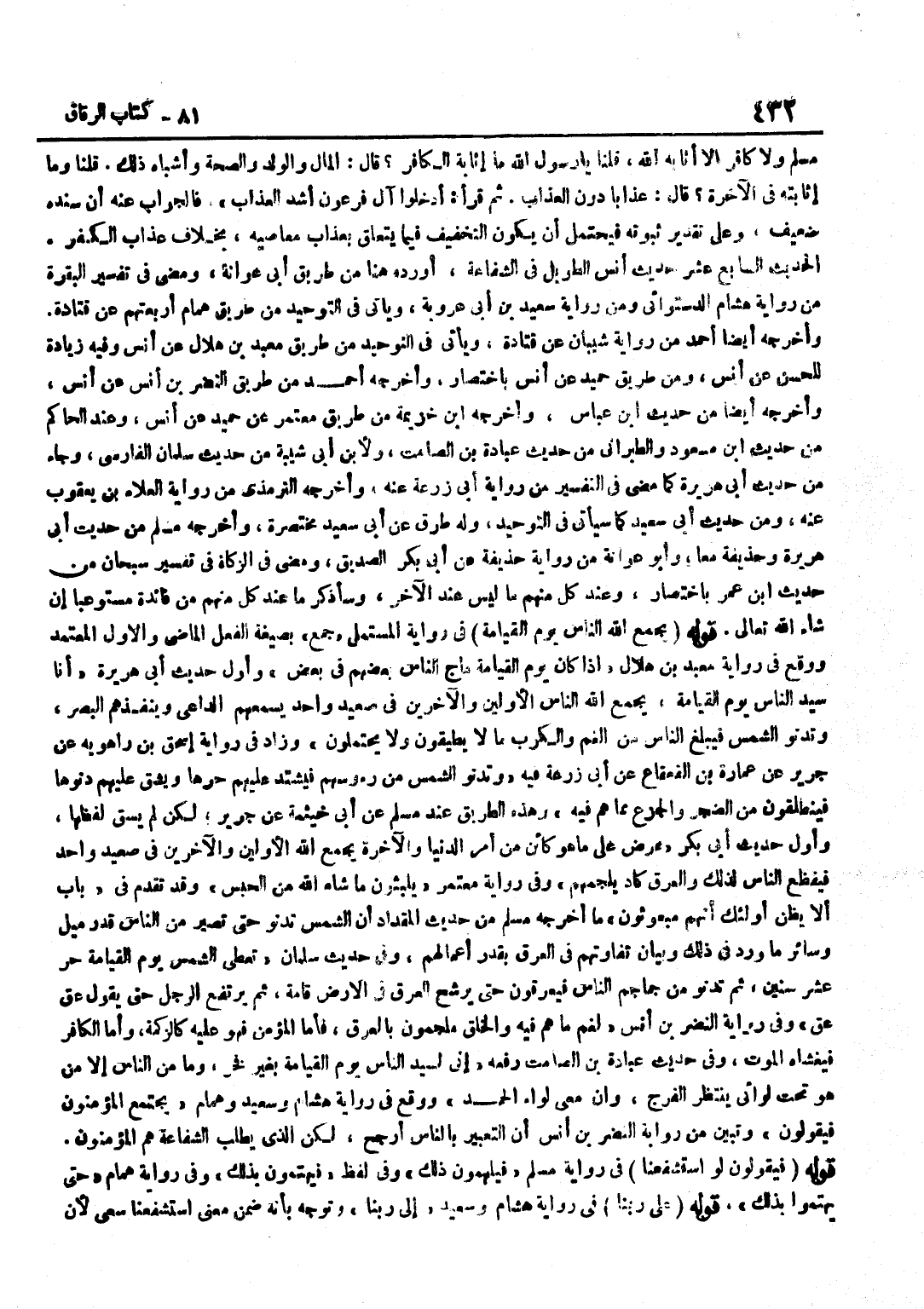 مُسْلِمٍ وَلَا كَافِرٍ إِلَّا أَثَابَهُ اللَّهُ قُلْنَا يَا رَسُولَ اللَّهِ مَا إِثَابَةُ الْكَافِرِ قَالَ الْمَالُ وَالْوَلَدُ وَالصِّحَّةُ وَأَشْبَاهُ ذَلِكَ قُلْنَا وَمَا إِثَابَتُهُ فِي الْآخِرَةِ قَالَ عَذَابًا دُونَ الْعَذَابِ ثُمَّ قَرَأَ أَدْخِلُوا آلَ فِرْعَوْنَ أَشَدَّ الْعَذَابِ فَالْجَوَابُ عَنْهُ أَنَّ سَنَدَهُ ضَعِيفٌ وَعَلَى تَقْدِيرِ ثُبُوتِهِ فَيَحْتَمِلُ أَنْ يَكُونَ التَّخْفِيفُ فِيمَا يَتَعَلَّقُ بِعَذَابِ مَعَاصِيهِ بِخِلَافِ عَذَابِ الْكُفْرِ الْحَدِيثُ السَّابِعَ عَشَرَ حَدِيثُ أَنَسٍ الطَّوِيلُ فِي الشَّفَاعَةِ أَوْرَدَهُ هُنَا مِنْ طَرِيقِ أَبِي عَوَانَةَ وَمَضَى فِي تَفْسِيرِ الْبَقَرَةِ مِنْ رِوَايَةِ هِشَامٍ الدَّسْتُوَائِيِّ وَمِنْ رِوَايَةِ سَعِيدِ بْنِ أَبِي عَرُوبَةَ وَيَأْتِي فِي التَّوْحِيدِ مِنْ طَرِيقِ هَمَّامٍ أَرْبَعَتُهُمْ عَنْ قَتَادَةَ وَأَخْرَجَهُ أَيْضًا أَحْمَدُ مِنْ رِوَايَةِ شَيْبَانَ عَنْ قَتَادَةَ وَيَأْتِي فِي التَّوْحِيدِ مِنْ طَرِيقِ مَعْبَدِ بْنِ هِلَالٍ عَنْ أَنَسٍ وَفِيهِ زِيَادَةٌ لِلْحَسَنِ عَنْ أَنَسٍ وَمِنْ طَرِيقِ حُمَيْدٍ عَنْ أَنَسٍ بِاخْتِصَارٍ وَأَخْرَجَهُ أَحْمَدُ مِنْ طَرِيقِ النَّضْرِ بْنِ أَنَسٍ عَنْ أَنَسٍ وَأَخْرَجَهُ أَيْضًا مِنْ حَدِيثِ بن عَبَّاس وَأخرجه بن خُزَيْمَةَ مِنْ طَرِيقِ مُعْتَمِرٍ عَنْ حُمَيْدٍ عَنْ أَنَسٍ وَعند الْحَاكِم من حَدِيث بن مَسْعُودٍ وَالطَّبَرَانِيِّ مِنْ حَدِيثِ عُبَادَةَ بْنِ الصَّامِتِ وَلِابْنِ أَبِي شَيْبَةَ مِنْ حَدِيثِ سَلْمَانَ الْفَارِسِيِّ وَجَاءَ مِنْ حَدِيثِ أَبِي هُرَيْرَةَ كَمَا مَضَى فِي التَّفْسِيرِ مِنْ رِوَايَةِ أَبِي زُرْعَةَ عَنْهُ وَأَخْرَجَهُ التِّرْمِذِيُّ مِنْ رِوَايَةِ الْعَلَاءِ بْنِ يَعْقُوبَ عَنهُ وَمن حَدِيثِ أَبِي سَعِيدٍ كَمَا سَيَأْتِي فِي التَّوْحِيدِ وَلَهُ طُرُقٌ عَنْ أَبِي سَعِيدٍ مُخْتَصَرَةٌ وَأَخْرَجَهُ مُسْلِمٌ مِنْ حَدِيثِ أَبِي هُرَيْرَةَ وَحُذَيْفَةَ مَعًا وَأَبُو عَوَانَةَ مِنْ رِوَايَةِ حُذَيْفَةَ عَنْ أَبِي بَكْرٍ الصِّدِّيقِ وَمَضَى فِي الزَّكَاةِ فِي تَفْسِيرِ سُبْحَانَ من حَدِيث بن عُمَرَ بِاخْتِصَارٍ وَعِنْدَ كُلٍّ مِنْهُمْ مَا لَيْسَ عِنْدَ الْآخَرِ وَسَأَذْكُرُ مَا عِنْدَ كُلٍّ مِنْهُمْ مِنْ فَائِدَةٍ مُسْتَوْعَبًا إِنْ شَاءَ اللَّهُ تَعَالَى