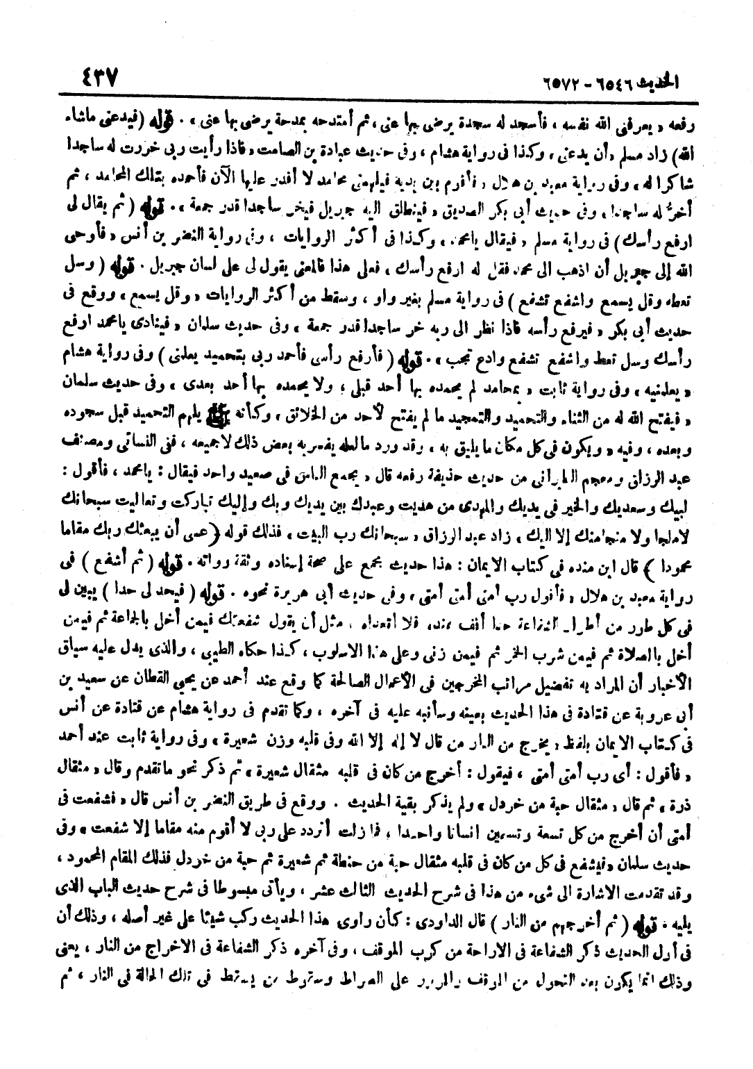 رَفَعَهُ يُعَرِّفُنِي اللَّهُ نَفْسَهُ فَأَسْجُدُ لَهُ سَجْدَةً يَرْضَى بِهَا عَنِّي ثُمَّ أَمْتَدِحُهُ بِمَدْحَةٍ يَرْضَى بِهَا عَنِّي قَوْلُهُ فَيَدَعُنِي مَا شَاءَ اللَّهُ زَادَ مُسْلِمٌ أَنْ يَدَعَنِي وَكَذَا فِي رِوَايَةِ هِشَامٍ وَفِي حَدِيثِ عُبَادَةَ بْنِ الصَّامِتِ فَإِذَا رَأَيْتُ رَبِّي خَرَرْتُ لَهُ سَاجِدًا شَاكِرًا لَهُ وَفِي رِوَايَةِ مَعْبَدِ بْنِ هِلَالٍ فَأَقُومُ بَيْنَ يَدَيْهِ فَيُلْهِمُنِي مَحَامِدَ لَا أَقْدِرُ عَلَيْهَا الْآنَ فَأَحْمَدُهُ بِتِلْكَ الْمَحَامِدِ ثُمَّ أَخِرُّ لَهُ سَاجِدًا وَفِي حَدِيثِ أَبِي بَكْرٍ الصِّدِّيقِ فَيَنْطَلِقُ إِلَيْهِ جِبْرِيلُ فَيَخِرُّ سَاجِدًا قَدْرَ جُمُعَةٍ قَوْلُهُ ثُمَّ يُقَالُ لِيَ ارْفَعْ رَأْسَكَ فِي رِوَايَةِ مُسْلِمٍ فَيُقَالُ يَا مُحَمَّدُ وَكَذَا فِي أَكْثَرِ الرِّوَايَاتِ وَفِي رِوَايَةِ النَّضْرِ بْنِ أَنَسٍ فَأَوْحَى اللَّهُ إِلَى جِبْرِيلَ أَنِ اذْهَبْ إِلَى مُحَمَّدٍ فَقُلْ لَهُ ارْفَعْ رَأْسَكَ فَعَلَى هَذَا فَالْمَعْنَى يَقُولُ لِي عَلَى لِسَانِ جِبْرِيلَ قَوْلُهُ وَسَلْ تُعْطَهُ وَقُلْ يُسْمَعْ وَاشْفَعْ تُشَفَّعْ فِي رِوَايَةِ مُسْلِمٍ بِغَيْرِ وَاوٍ وَسَقَطَ مِنْ أَكْثَرِ الرِّوَايَاتِ وَقُلْ يُسْمَعْ وَوَقَعَ فِي حَدِيثِ أَبِي بَكْرٍ فَيَرْفَعُ رَأْسَهُ فَإِذَا نَظَرَ إِلَى رَبِّهِ خَرَّ سَاجِدًا قَدْرَ جُمُعَةٍ وَفِي حَدِيثِ سَلْمَانَ فَيُنَادِي يَا مُحَمَّدُ ارْفَعْ رَأْسَكَ وَسَلْ تُعْطَ وَاشْفَعْ تُشَفَّعْ وَادْعُ تُجَبْ قَوْلُهُ فَأَرْفَعُ رَأْسِي فَأَحْمَدُ رَبِّي بِتَحْمِيدٍ يُعَلِّمُنِي وَفِي رِوَايَةِ هِشَامٍ يُعَلِّمُنِيهِ وَفِي رِوَايَةِ ثَابِتٍ بِمَحَامِدَ لَمْ يَحْمَدْهُ بِهَا أَحَدٌ قَبْلِي وَلَا يَحْمَدُهُ بِهَا أَحَدٌ بَعْدِي وَفِي حَدِيثِ سَلْمَانَ فَيَفْتَحُ اللَّهُ لَهُ مِنَ الثَّنَاءِ وَالتَّحْمِيدِ وَالتَّمْجِيدِ مَا لَمْ يَفْتَحْ لِأَحَدٍ مِنَ الْخَلَائِقِ وَكَأَنَّهُ صَلَّى اللَّهُ عَلَيْهِ وَسَلَّمَ يُلْهَمُ التَّحْمِيدَ قَبْلَ سُجُودِهِ وَبَعْدَهُ وَفِيهِ وَيَكُونُ فِي كُلِّ مَكَانٍ مَا يَلِيقُ بِهِ وَقَدْ وَرَدَ مَا لَعَلَّهُ يُفَسَّرُ بِهِ بَعْضُ ذَلِكَ لَا جَمِيعُهُ فَفِي النَّسَائِيِّ وَمُصَنَّفِ عَبْدِ الرَّزَّاقِ وَمُعْجَمِ الطَّبَرَانِيِّ مِنْ حَدِيثِ حُذَيْفَةَ رَفَعَهُ قَالَ يُجْمَعُ النَّاسُ فِي صَعِيدٍ وَاحِدٍ فَيُقَالُ يَا مُحَمَّدُ فَأَقُولُ لَبَّيْكَ وَسَعْدَيْكَ وَالْخَيْرُ فِي يَدَيْكَ وَالْمَهْدِيُّ مَنْ هَدَيْتَ وَعَبْدُكَ بَيْنَ يَدَيْكَ وَبِكَ وَإِلَيْكَ تَبَارَكْتَ وَتَعَالَيْتَ سُبْحَانَكَ لَا مَلْجَأَ وَلَا مَنْجَأَ مِنْكَ إِلَّا إِلَيْكَ زَادَ عَبْدُ الرَّزَّاقِ سُبْحَانَكَ رَبَّ الْبَيْتِ فَذَلِكَ قَوْلُهُ عَسَى أَنْ يَبْعَثَكَ رَبك مقَاما مَحْمُودًا قَالَ بن مَنْدَهْ فِي كِتَابِ الْإِيمَانِ هَذَا حَدِيثٌ مُجْمَعٌ عَلَى صِحَّةِ إِسْنَادِهِ وَثِقَةِ رُوَاتِهِ قَوْلُهُ ثُمَّ أَشْفَعُ فِي رِوَايَةِ مَعْبَدِ بْنِ هِلَالٍ فَأَقُولُ رَبِّ أُمَّتِي أُمَّتِي أُمَّتِي وَفِي حَدِيثِ أَبِي هُرَيْرَةَ نَحْوُهُ قَوْلُهُ فَيَحُدُّ لِي حَدًّا يُبَيِّنُ لِي فِي كُلِّ طَوْرٍ مِنْ أَطْوَارِ الشَّفَاعَةِ حَدًّا أَقِفُ عِنْدَهُ فَلَا أَتَعَدَّاهُ مِثْلَ أَنْ يَقُولَ شَفَّعْتُكَ فِيمَنْ أَخَلَّ بِالْجَمَاعَةِ ثُمَّ فِيمَنْ أَخَلَّ بِالصَّلَاةِ ثُمَّ فِيمَنْ شَرِبَ الْخَمْرَ ثُمَّ فِيمَنْ زَنَى وَعَلَى هَذَا الْأُسْلُوبِ كَذَا حَكَاهُ الطِّيبِيُّ وَالَّذِي يَدُلُّ عَلَيْهِ سِيَاقُ الْأَخْبَارِ أَنَّ الْمُرَادَ بِهِ تَفْضِيلُ مَرَاتِبِ الْمُخْرَجِينَ فِي الْأَعْمَالِ الصَّالِحَةِ كَمَا وَقَعَ عِنْدَ أَحْمَدَ عَنْ يَحْيَى الْقَطَّ