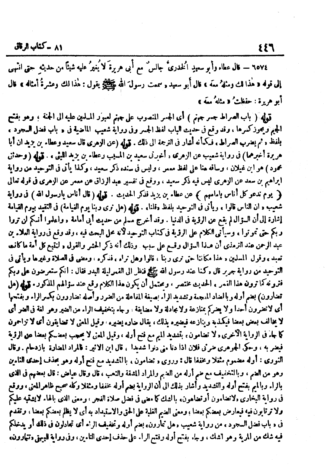 [6573] قَوْلُهُ عَنْ الزُّهْرِيِّ قَالَ سَعِيدٌ وَعَطَاءُ بْنُ يَزِيدَ إِنَّ أَبَا هُرَيْرَةَ أَخْبَرَهُمَا فِي رِوَايَةِ شُعَيْبٍ عَنِ الزُّهْرِيِّ أَخْبَرَنِي سَعِيدُ بْنُ الْمُسَيَّبِ وَعَطَاءُ بْنُ يَزِيدَ اللَّيْثِيُّ قَوْله وحَدثني مَحْمُود هُوَ بن غَيْلَانَ وَسَاقَهُ هُنَا عَلَى لَفْظِ مَعْمَرٍ وَلَيْسَ فِي سَنَدِهِ ذِكْرُ سَعِيدٍ وَكَذَا يَأْتِي فِي التَّوْحِيدِ مِنْ رِوَايَةِ إِبْرَاهِيمَ بْنِ سَعِيدٍ عَنِ الزُّهْرِيِّ لَيْسَ فِيهِ ذِكْرُ سَعِيدٍ وَوَقَعَ فِي تَفْسِيرِ عَبْدُ الرَّزَّاقِ عَنْ مَعْمَرٍ عَنِ الزُّهْرِيِّ فِي قَوْله تَعَالَى يَوْم نَدْعُو كل اناس بامامهم عَنْ عَطَاءِ بْنِ يَزِيدَ فَذَكَرَ الْحَدِيثَ قَوْلُهُ قَالَ أُنَاسٌ يَا رَسُولَ اللَّهِ فِي رِوَايَةِ شُعَيْبٍ إِنَّ النَّاسَ قَالُوا وَيَأْتِي فِي التَّوْحِيدِ بِلَفْظِ قُلْنَا قَوْلُهُ هَلْ نَرَى رَبَّنَا يَوْمَ الْقِيَامَة فِي التقيد بِيَوْمِ الْقِيَامَةِ إِشَارَةٌ إِلَى أَنَّ السُّؤَالَ لَمْ يَقَعْ عَنِ الرُّؤْيَةِ فِي الدُّنْيَا وَقَدْ أَخْرَجَ مُسْلِمٌ مِنْ حَدِيثِ أَبِي أُمَامَةَ وَاعْلَمُوا أَنَّكُمْ لَنْ تَرَوْا رَبَّكُمْ حَتَّى تَمُوتُوا وَسَيَأْتِي الْكَلَامُ عَلَى الرُّؤْيَةِ فِي كِتَابِ التَّوْحِيدِ لِأَنَّهُ مَحَلُّ الْبَحْثِ فِيهِ وَقَدْ وَقَعَ فِي رِوَايَةِ الْعَلَاءِ بْنِ عَبْدِ الرَّحْمَنِ عِنْدَ التِّرْمِذِيِّ أَنَّ هَذَا السُّؤَالَ وَقَعَ عَلَى سَبَبٍ وَذَلِكَ أَنَّهُ ذَكَرَ الْحَشْرَ وَالْقَوْلُ لِتَتْبَعْ كُلُّ أُمَّةٍ مَا كَانَتْ تَعْبُدُ وَقَوْلُ الْمُسْلِمِينَ هَذَا مَكَانُنَا حَتَّى نَرَى رَبَّنَا قَالُوا وَهَلْ نَرَاهُ فَذَكَرَهُ وَمَضَى فِي الصَّلَاةِ وَغَيْرِهَا وَيَأْتِي فِي التَّوْحِيدِ مِنْ رِوَايَةِ جَرِيرٍ قَالَ كُنَّا عِنْدَ رَسُولِ اللَّهِ صَلَّى اللَّهُ عَلَيْهِ وَسَلَّمَ فَنَظَرَ إِلَى الْقَمَرِ لَيْلَةَ الْبَدْرِ فَقَالَ إِنَّكُمْ سَتُعْرَضُونَ عَلَى رَبِّكُمْ فَتَرَوْنَهُ كَمَا تَرَوْنَ هَذَا الْقَمَرَ الْحَدِيثُ مُخْتَصَرٌ وَيَحْتَمِلُ أَنْ يَكُونَ الْكَلَامُ وَقَعَ عِنْدَ سُؤَالِهِمُ الْمَذْكُورِ قَوْلُهُ هَلْ تُضَارُّونَ بِضَمِّ أَوَّلِهِ وَبِالضَّادِ الْمُعْجَمَةِ وَتَشْدِيدِ الرَّاءِ بِصِيغَةِ الْمُفَاعَلَةِ مِنَ الضَّرَرِ وَأَصْلُهُ تضَارونَ بِكَسْرِ الرَّاءِ وَبِفَتْحِهَا أَيْ لَا تَضُرُّونَ أَحَدًا وَلَا يَضُرُّكُمْ بِمُنَازَعَةٍ وَلَا مُجَادَلَةٍ وَلَا مُضَايِقَةٍ وَجَاءَ بِتَخْفِيفِ الرَّاءِ مِنَ الضَّيْرِ وَهُوَ لُغَةٌ فِي الضُّرِّ أَيْ لَا يُخَالِفُ بَعْضٌ بَعْضًا فَيُكَذِّبُهُ وَيُنَازِعُهُ فَيُضِيرُهُ بِذَلِكَ يُقَالُ ضَارَّهُ يُضِيرُهُ وَقِيلَ الْمَعْنَى لَا تَضَايَقُونَ أَيْ لَا تَزَاحَمُونَ كَمَا جَاءَ فِي الرِّوَايَةِ الْأُخْرَى لَا تُضَامُّونَ بِتَشْدِيدِ الْمِيمِ مَعَ فَتْحِ أَوَّلِهِ وَقِيلَ الْمَعْنَى لَا يحجب بَعْضكُم بَعْضًا عَن الرُّؤْيَة فيضربه وَحَكَى الْجَوْهَرِيُّ ضَرَّنِي فُلَانٌ إِذَا دَنَا مِنِّي دنوا شَدِيدا قَالَ بن الْأَثِيرِ فَالْمُرَادُ الْمُضَارَّةُ بِازْدِحَامٍ وَقَالَ النَّوَوِيُّ أَوَّلُهُ مَضْمُومٌ مُثَقَّلًا وَمُخَفَّفًا قَالَ وَرَوَى تَضَامُّونَ بِالتَّشْدِيدِ مَعَ فَتْحِ أَوَّلِهِ وَهُوَ بِحَذْفِ إِحْدَى التَّاءَيْنِ وَهُوَ مِنَ الضَّمِّ وَبِالتَّخْفِيفِ مَعَ ضَمِّ أَوَّلِهِ مِنَ الضَّيْمِ وَالْمُرَادُ الْمَشَقَّةُ وَالتَّعَبُ قَالَ وَقَالَ عِيَاضٌ قَالَ بَعْضُهُمْ فِي الَّذِي بِالرَّاءِ وَبِالْمِيمِ بِفَتْحِ أَوَّلِهِ وَالتَّشْدِيدِ وَأَشَارَ بِذَلِكَ إِلَى أَنَّ الرِّوَايَةَ بِضَمِّ أَوَّلِهِ مُخَفَّفًا وَمُثَقَّلًا وَكُلُّهُ صَحِيحٌ ظَاهِرُ الْمَعْنَى وَوَقَعَ فِي رِوَايَ