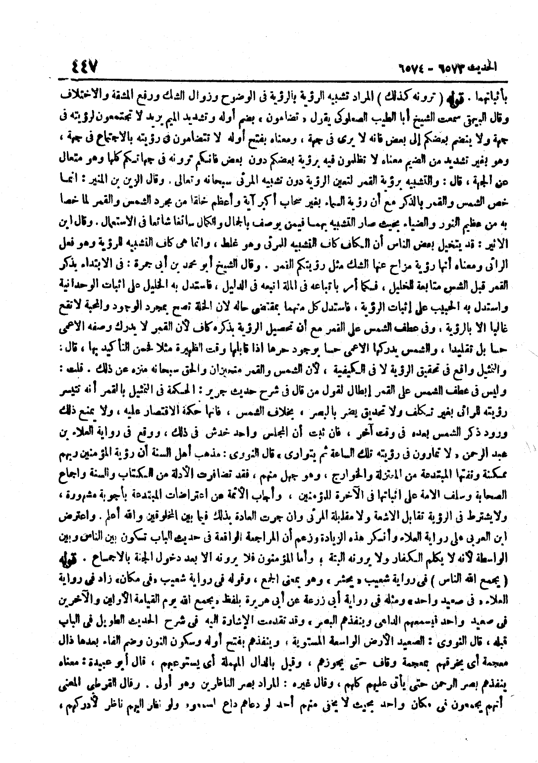 بِإِثْبَاتِهِمَا قَوْلُهُ تَرَوْنَهُ كَذَلِكَ الْمُرَادُ تَشْبِيهُ الرُّؤْيَةِ بِالرُّؤْيَةِ فِي الْوُضُوحِ وَزَوَالِ الشَّكِّ وَرَفْعِ الْمَشَقَّةِ وَالِاخْتِلَافِ وَقَالَ الْبَيْهَقِيُّ سَمِعْتُ الشَّيْخَ أَبَا الطَّيِّبِ الصُّعْلُوكِيَّ يَقُولُ تُضَامُّونَ بِضَمِّ أَوَّلِهِ وَتَشْدِيدِ الْمِيمِ يُرِيدُ لَا تَجْتَمِعُونَ لِرُؤْيَتِهِ فِي جِهَةٍ وَلَا يَنْضَمُّ بَعْضُكُمْ إِلَى بَعْضٍ فَإِنَّهُ لَا يُرَى فِي جِهَةٍ وَمَعْنَاهُ بِفَتْحِ أَوَّلِهِ لَا تَتَضَامُّونَ فِي رُؤْيَتِهِ بِالِاجْتِمَاعِ فِي جِهَةٍ وَهُوَ بِغَيْرِ تَشْدِيدٍ مِنَ الضَّيْمِ مَعْنَاهُ لَا تُظْلَمُونَ فِيهِ بِرُؤْيَةِ بَعْضِكُمْ دُونَ بَعْضٍ فَإِنَّكُمْ تَرَوْنَهُ فِي جِهَاتِكُمْ كُلِّهَا وَهُوَ مُتَعَالٍ عَنِ الْجِهَةِ قَالَ وَالتَّشْبِيهُ بِرُؤْيَةِ الْقَمَرِ لِتَعْيِينِ الرُّؤْيَةِ دُونَ تَشْبِيهِ الْمَرْئِيِّ سُبْحَانَهُ وَتَعَالَى وَقَالَ الزَّيْنُ بْنُ الْمُنِيرِ إِنَّمَا خَصَّ الشَّمْسَ وَالْقَمَرَ بِالذِّكْرِ مَعَ أَنَّ رُؤْيَةَ السَّمَاءِ بِغَيْرِ سَحَابٍ أَكْبَرُ آيَةٍ وَأَعْظَمُ خَلْقًا مِنْ مُجَرَّدِ الشَّمْسِ وَالْقَمَرِ لِمَا خُصَّا بِهِ مِنْ عَظِيمِ النُّورِ وَالضِّيَاءِ بِحَيْثُ صَارَ التَّشْبِيهُ بِهِمَا فِيمَنْ يُوصَفُ بِالْجَمَالِ وَالْكَمَالِ سَائِغًا شَائِعا فِي الِاسْتِعْمَال وَقَالَ بن الْأَثِيرِ قَدْ يَتَخَيَّلُ بَعْضُ النَّاسِ أَنَّ الْكَافَ كَافُ التَّشْبِيهِ لِلْمَرْئِيِّ وَهُوَ غَلَطٌ وَإِنَّمَا هِيَ كَافُ التَّشْبِيهِ لِلرُّؤْيَةِ وَهُوَ فِعْلُ الرَّائِي وَمَعْنَاهُ أَنَّهُ رُؤْيَةٌ مُزَاحٌ عَنْهَا الشَّكُّ مِثْلُ رُؤْيَتِكُمُ الْقَمَرَ وَقَالَ الشَّيْخُ أَبُو مُحَمَّدِ بْنِ أَبِي جَمْرَةَ فِي الِابْتِدَاءِ بِذِكْرِ الْقَمَرِ قَبْلَ الشَّمْسِ مُتَابَعَةً لِلْخَلِيلِ فَكَمَا أُمِرَ بِاتِّبَاعِهِ فِي الْمِلَّةِ اتَّبَعَهُ فِي الدَّلِيلِ فَاسْتَدَلَّ بِهِ الْخَلِيلُ عَلَى إِثْبَاتِ الْوَحْدَانِيَّةِ وَاسْتَدَلَّ بِهِ الْحَبِيبُ عَلَى إِثْبَاتِ الرُّؤْيَةِ فَاسْتَدَلَّ كُلٌّ مِنْهُمَا بِمُقْتَضَى حَالِهِ لِأَنَّ الْخُلَّةَ تَصِحُّ بِمُجَرَّدِ الْوُجُودِ وَالْمَحَبَّةِ لَا تَقَعُ غَالِبًا إِلَّا بِالرُّؤْيَةِ وَفِي عَطْفِ الشَّمْسِ عَلَى الْقَمَرِ مَعَ أَنَّ تَحْصِيلَ الرُّؤْيَةِ بِذِكْرِهِ كَافٍ لِأَنَّ الْقَمَرَ لَا يُدْرِكَ وَصْفَهُ الْأَعْمَى حِسًّا بَلْ تَقْلِيدًا وَالشَّمْسُ يُدْرِكُهَا الْأَعْمَى حِسًّا بِوُجُودِ حَرِّهَا إِذَا قَابَلَهَا وَقْتَ الظَّهِيرَةِ مَثَلًا فَحَسُنَ التَّأْكِيدُ بِهَا قَالَ وَالتَّمْثِيلُ وَاقِعٌ فِي تَحْقِيقِ الرُّؤْيَةِ لَا فِي الْكَيْفِيَّةِ لِأَنَّ الشَّمْسَ وَالْقَمَرَ مُتَحَيِّزَانِ وَالْحَقُّ سُبْحَانَهُ مُنَزَّهٌ عَنْ ذَلِكَ قُلْتُ وَلَيْسَ فِي عَطْفِ الشَّمْسِ عَلَى الْقَمَرِ إِبْطَالٌ لِقَوْلِ مَنْ قَالَ فِي شَرْحِ حَدِيثِ جَرِيرٍ الْحِكْمَةُ فِي التَّمْثِيلِ بِالْقَمَرِ أَنَّهُ تَتَيَسَّرُ رُؤْيَتُهُ لِلرَّائِي بِغَيْرِ تَكَلُّفٍ وَلَا تَحْدِيقٍ يَضُرُّ بِالْبَصَرِ بِخِلَافِ الشَّمْسِ فَإِنَّهَا حِكْمَةُ الِاقْتِصَارِ عَلَيْهِ وَلَا يَمْنَعُ ذَلِكَ وُرُودَ ذِكْرِ الشَّمْسِ بَعْدَهُ فِي وَقْتٍ آخَرَ فَإِنْ ثَبَتَ أَنَّ الْمَجْلِسَ وَاحِدٌ خُدِشَ فِي ذَلِكَ وَوَقَعَ فِي رِوَايَةِ الْعَلَاءِ بْنِ عَبْدِ الرَّحْمَنِ لَا تُمَارُونَ فِي رُؤْيَتِهِ تِلْكَ السَّاعَةَ ثُمَّ يَتَوَارَى قَالَ النَّوَوِيُّ مَذْهَبُ أَهْلِ السُّنَّةِ أَنَّ رُؤْيَةَ الْمُؤْمِنِينَ رَبَّهُمْ مُمْكِنَةٌ وَنَفَتْهَا الْمُبْتَدِعَةُ مِنَ الْمُعْتَزِلَةِ وَالْخَوَارِجِ وَهُوَ جَهْلٌ مِنْهُمْ فَقَدْ تَضَافَرَتِ الْأَد