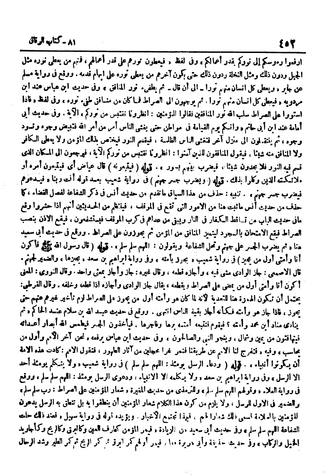 ارْفَعُوا رُءُوسَكُمْ إِلَى نُورِكُمْ بِقَدْرِ أَعْمَالِكُمْ وَفِي لَفْظٍ فَيُعْطَوْنَ نُورَهُمْ عَلَى قَدْرِ أَعْمَالِهِمْ فَمِنْهُمْ مَنْ يُعْطَى نُورَهُ مِثْلَ الْجَبَلِ وَدُونَ ذَلِكَ وَمِثْلَ النَّخْلَةِ وَدُونَ ذَلِكَ حَتَّى يَكُونَ آخِرُهُمْ مَنْ يُعْطَى نُورَهُ عَلَى إِبْهَامِ قَدَمِهِ وَوَقَعَ فِي رِوَايَةِ مُسْلِمٍ عَنْ جَابِرٍ وَيُعْطَى كُلُّ إِنْسَانٍ مِنْهُمْ نُورًا إِلَى أَنْ قَالَ ثُمَّ يطفيء نور الْمُنَافِق وَفِي حَدِيث بن عَبَّاس عِنْد بن مَرْدَوَيْهِ فَيُعْطَى كُلُّ إِنْسَانٍ مِنْهُمْ نُورًا ثُمَّ يُوَجَّهُونَ إِلَى الصِّرَاطِ فَمَا كَانَ مِنْ مُنَافِقٍ طفيء نُورُهُ وَفِي لَفْظِ فَإِذَا اسْتَوَوْا عَلَى الصِّرَاطِ سَلَبَ اللَّهُ نُورَ الْمُنَافِقِينَ فَقَالُوا لِلْمُؤْمِنِينَ انْظُرُونَا نقتبس من نوركم الْآيَة وَفِي حَدِيث أبي امامة عِنْد بن أَبِي حَاتِمٍ وَإِنَّكُمْ يَوْمَ الْقِيَامَةِ فِي مَوَاطِنَ حَتَّى يَغْشَى النَّاسَ أَمْرٌ مِنْ أَمْرِ اللَّهِ فَتَبْيَضُّ وُجُوهٌ وَتَسْوَدُّ وُجُوهٌ ثُمَّ يَنْتَقِلُونَ إِلَى مَنْزِلٍ آخَرَ فَتَغْشَى النَّاسَ الظُّلْمَةُ فَيُقْسَمُ النُّورُ فَيَخْتَصُّ بِذَلِكَ الْمُؤْمِنُ وَلَا يُعْطَى الْكَافِرُ وَلَا الْمُنَافِقُ مِنْهُ شَيْئًا فَيَقُولُ الْمُنَافِقُونَ لِلَّذِينَ آمَنُوا انظرونا نقتبس من نوركم الْآيَةَ فَيَرْجِعُونَ إِلَى الْمَكَانِ الَّذِي قُسِمَ فِيهِ النُّورُ فَلَا يَجِدُونَ شَيْئًا فَيُضْرَبُ بَيْنَهُمْ بِسُورٍ قَوْلُهُ فَيَتْبَعُونَهُ قَالَ عِيَاضٌ أَيْ فَيَتْبَعُونَ أَمْرَهُ أَوْ مَلَائِكَتَهُ الَّذِينَ وُكِّلُوا بِذَلِكَ قَوْلُهُ وَيُضْرَبُ جِسْرُ جَهَنَّمَ فِي رِوَايَةِ شُعَيْبٍ بَعْدَ قَوْلِهِ أَنْتَ رَبُّنَا فَيَدْعُوهُمْ فَيُضْرَبُ جِسْرُ جَهَنَّمَ تَنْبِيهٌ حَذَفَ مِنْ هَذَا السِّيَاقِ مَا تَقَدَّمَ مِنْ حَدِيثِ أَنَسٍ فِي ذِكْرِ الشَّفَاعَةِ لِفَصْلِ الْقَضَاءِ كَمَا حَذَفَ مِنْ حَدِيثِ أَنَسٍ مَا ثَبَتَ هُنَا مِنَ الْأُمُورِ الَّتِي تَقَعُ فِي الْمَوْقِفِ فَيَنْتَظِمُ مِنَ الْحَدِيثَيْنِ أَنَّهُمْ إِذَا حُشِرُوا وَقَعَ مَا فِي حَدِيثِ الْبَابِ مِنْ تَسَاقُطِ الْكُفَّارِ فِي النَّارِ وَيَبْقَى مَنْ عَدَاهُمْ فِي كَرْبِ الْمَوْقِفِ فَيَسْتَشْفِعُونَ فَيَقَعُ الْإِذْنُ بِنَصْبِ الصِّرَاطِ فَيَقَعُ الِامْتِحَانُ بِالسُّجُودِ لِيَتَمَيَّزَ الْمُنَافِقُ مِنَ الْمُؤْمِنِ ثُمَّ يَجُوزُونَ عَلَى الصِّرَاطِ وَوَقَعَ فِي حَدِيثِ أَبِي سَعِيدٍ هُنَا ثُمَّ يُضْرَبُ الْجِسْرُ عَلَى جَهَنَّمَ وَتَحِلُّ الشَّفَاعَةُ وَيَقُولُونَ اللَّهُمَّ سَلِّمْ سَلِّمْ قَوْلُهُ قَالَ رَسُولُ اللَّهِ صَلَّى اللَّهُ عَلَيْهِ وَسَلَّمَ فَأَكُونُ أَنَا وَأُمَّتِي أَوَّلَ مَنْ يُجِيزُ فِي رِوَايَةِ شُعَيْبٍ يَجُوزُ بِأُمَّتِهِ وَفِي رِوَايَةِ إِبْرَاهِيمَ بْنِ سَعْدٍ يُجِيزُهَا وَالضَّمِيرُ لِجَهَنَّمَ قَالَ الْأَصْمَعِيُّ جَازَ الْوَادِيَ مَشَى فِيهِ وَأَجَازَهُ قَطَعَهُ وَقَالَ غَيْرُهُ جَازَ وَأَجَازَ بِمَعْنًى وَاحِدٍ وَقَالَ النَّوَوِيُّ الْمَعْنَى أَكُونُ أَنَا وَأُمَّتِي أَوَّلَ مَنْ يَمْضِي عَلَى الصِّرَاطِ وَيَقْطَعُهُ يَقُولُ جَازَ الْوَادِيَ وَأَجَازَهُ إِذَا قَطَعَهُ وَخَلَّفَهُ وَقَالَ الْقُرْطُبِيُّ يَحْتَمِلُ أَنْ تَكُونَ الْهَمْزَةُ هُنَا لِلتَّعَدِّيَةِ لِأَنَّهُ لَمَّا كَانَ هُوَ وَأُمَّتُهُ أَوَّلَ مَنْ يَجُوزُ عَلَى الصِّرَاطِ لَزِمَ تَأْخِيرُ غَيْرِهِمْ عَنْهُمْ حَتَّى يَجُوزَ فَإِذَا جَازَ هُوَ وَأُمَّتُهُ فَكَأَنَّهُ أَجَازَ بَقِيَّةَ النَّاسِ انْتَهَى وَوَقَعَ فِي حَدِيثِ عَبْدِ اللَّهِ بْنِ سَلَامٍ عِنْدَ الْحَاكِمِ ثُمَّ يُنَادِي مُنَادٍ أَيْنَ مُحَمَّدٌ وَأُمَّتُ