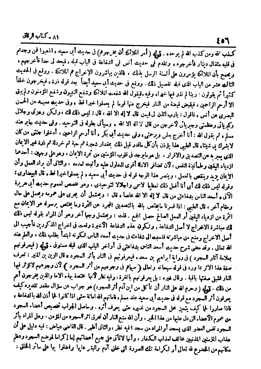 كَذَّبَ اللَّهَ وَمَنْ كَذَّبَ اللَّهَ لَمْ يُوَحِّدْهُ قَوْلُهُ أَمَرَ الْمَلَائِكَةَ أَنْ يُخْرِجُوهُمْ فِي حَدِيثِ أَبِي سَعِيدٍ اذْهَبُوا فَمَنْ وَجَدْتُمْ فِي قَلْبِهِ مِثْقَالَ دِينَارٍ فَأَخْرِجُوهُ وَتَقَدَّمَ فِي حَدِيثِ أَنَسٍ فِي الشَّفَاعَةِ فِي الْبَابِ قَبْلَهُ فَيَحُدُّ لِي حَدًّا فَأُخْرِجهُمْ وَيُجْمَعُ بِأَنَّ الْمَلَائِكَةَ يُؤْمَرُونَ عَلَى أَلْسِنَةِ الرُّسُلِ بِذَلِكَ فَالَّذِينَ يُبَاشِرُونَ الْإِخْرَاجَ هُمُ الْمَلَائِكَةُ وَوَقَعَ فِي الْحَدِيثِ الثَّالِثَ عَشَرَ مِنَ الْبَابِ الَّذِي قَبْلَهُ تَفْصِيلُ ذَلِكَ وَوَقَعَ فِي حَدِيثِ أَبِي سَعِيدٍ أَيْضًا بَعْدَ قَوْلِهِ ذَرَّةٌ فَيُخْرِجُونَ خَلْقًا كَثِيرًا ثُمَّ يَقُولُونَ رَبَّنَا لَمْ نَذَرْ فِيهَا خَيْرًا وَفِيهِ فَيَقُولُ اللَّهُ شَفَعَتِ الْمَلَائِكَةُ وَشَفَعَ النَّبِيُّونَ وَشَفَعَ الْمُؤْمِنُونَ وَلَمْ يَبْقَ إِلَّا أَرْحَمُ الرَّاحِمِينَ فَيَقْبِضُ قَبْضَةً مِنَ النَّارِ فَيَخْرُجُ مِنْهَا قَوْمًا لَمْ يَعْمَلُوا خَيْرًا قَطُّ وَفِي حَدِيثِ مَعْبَدٍ عَنِ الْحَسَنِ الْبَصْرِيِّ عَنْ أَنَسٍ فَأَقُولُ يَا رَبِّ ائْذَنْ لِي فِيمَنْ قَالَ لَا إِلَهَ إِلَّا اللَّهُ قَالَ لَيْسَ ذَلِكَ لَكَ وَلَكِنْ وَعِزَّتِي وَجَلَالِي وَكِبْرِيَائِي وَعَظَمَتِي وَجِبْرِيَائِي لَأُخْرِجَنَّ مَنْ قَالَ لَا إِلَهَ إِلَّا اللَّهُ وَسَيَأْتِي بِطُولِهِ فِي التَّوْحِيدِ وَفِي حَدِيثِ جَابِرٍ عِنْدَ مُسْلِمٍ ثُمَّ يَقُولُ اللَّهُ أَنَا أُخْرِجُ بِعِلْمِي وَبِرَحْمَتِي وَفِي حَدِيثِ أَبِي بَكْرٍ أَنَا أَرْحَمُ الرَّاحِمِينَ أَدْخِلُوا جَنَّتِي مَنْ كَانَ لَا يُشْرِكُ بِي شَيْئًا قَالَ الطِّيبِيُّ هَذَا يُؤْذِنُ بِأَنَّ كُلَّ مَا قُدِّرَ قَبْلَ ذَلِكَ بِمِقْدَارِ شَعِيرَةٍ ثُمَّ حَبَّةٍ ثُمَّ خَرْدَلَةٍ ثُمَّ ذَرَّةٍ غَيْرُ الْإِيمَانِ الَّذِي يُعَبَّرُ بِهِ عَنِ التَّصْدِيقِ وَالْإِقْرَارِ بَلْ هُوَ مَا يُوجَدُ فِي قُلُوبِ الْمُؤْمِنِينَ مِنْ ثَمَرَةِ الْإِيمَانِ وَهُوَ عَلَى وَجْهَيْنِ أَحَدُهُمَا ازْدِيَادُ الْيَقِينِ وَطُمَأْنِينَةُ النَّفْسِ لِأَنَّ تَضَافُرَ الْأَدِلَّةِ أَقْوَى لِلْمَدْلُولِ عَلَيْهِ وَأَثْبَتُ لِعَدَمِهِ وَالثَّانِي أَنْ يُرَادَ الْعَمَلُ وَأَنَّ الْإِيمَانَ يَزِيدُ وَيَنْقُصُ بِالْعَمَلِ وَيَنْصُرُ هَذَا الْوَجْهَ قَوْلُهُ فِي حَدِيثِ أَبِي سَعِيدٍ لَمْ يَعْمَلُوا خَيْرًا قَطُّ قَالَ الْبَيْضَاوِيُّ وَقَوْلُهُ لَيْسَ ذَلِكَ لَكَ أَيْ أَنَا أَفْعَلُ ذَلِكَ تَعْظِيمًا لِاسْمِي وَإِجْلَالًا لِتَوْحِيدِي وَهُوَ مُخَصِّصٌ لِعُمُومِ حَدِيثِ أَبِي هُرَيْرَةَ الْآتِي أَسْعَدُ النَّاسِ بِشَفَاعَتِي مَنْ قَالَ لَا إِلَهَ إِلَّا اللَّهُ مُخْلِصًا قَالَ وَيَحْتَمِلُ أَنْ يَجْرِيَ عَلَى عُمُومِهِ وَيُحْمَلَ عَلَى حَالٍ وَمَقَامٍ آخَرَ قَالَ الطِّيبِيُّ إِذَا فَسَّرْنَا مَا يَخْتَصُّ بِاللَّهِ بِالتَّصْدِيقِ الْمُجَرَّدِ عَنِ الثَّمَرَةِ وَمَا يَخْتَصُّ بِرَسُولِهِ هُوَ الْإِيمَانُ مَعَ الثَّمَرَةِ مِنِ ازْدِيَادِ الْيَقِينِ أَوِ الْعَمَلِ الصَّالِحِ حَصَلَ الْجَمْعُ قُلْتُ وَيَحْتَمِلُ وَجْهًا آخَرَ وَهُوَ أَنَّ الْمُرَادَ بِقَوْلِهِ لَيْسَ ذَلِكَ لَكَ مُبَاشَرَةُ الْإِخْرَاجِ لَا أَصْلَ الشَّفَاعَةِ وَتَكُونُ هَذِهِ الشَّفَاعَةُ الْأَخِيرَةُ وَقَعَتْ فِي إِخْرَاجِ الْمَذْكُورِينَ فَأُجِيبَ إِلَى أَصْلِ الْإِخْرَاجِ وَمُنِعَ مِنْ مُبَاشَرَتِهِ فَنُسِبَتْ إِلَى شَفَاعَتِهِ فِي حَدِيثِ أَسْعَدُ النَّاس لكَونه ابْتِدَاء بِطَلَبِ ذَلِكَ وَالْعِلْمُ عِنْدَ اللَّهِ تَعَالَى وَقَدْ مَضَى شَرْحُ حَدِيثِ أَسْعَدُ النَّاسِ بِشَفَاعَتِي فِي أَوَاخِرِ الْبَابِ الَّذِي قَبْ