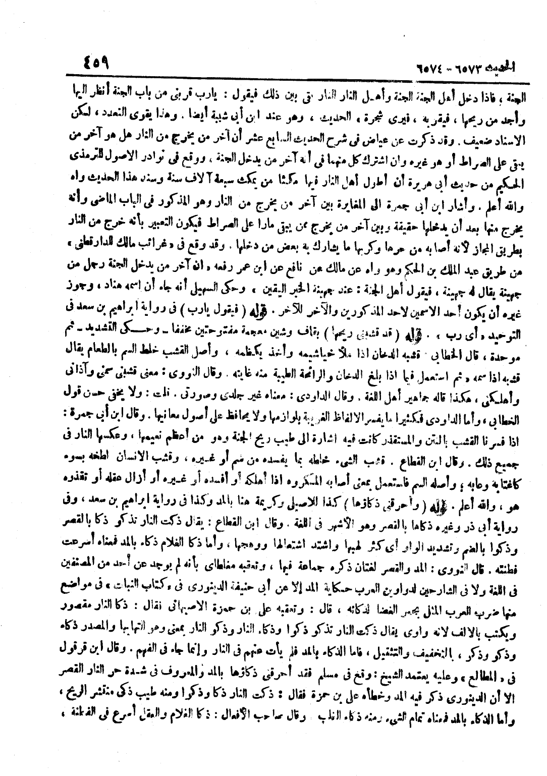 الْجَنَّةَ فَإِذَا دَخَلَ أَهْلُ الْجَنَّةِ الْجَنَّةَ وَأَهْلُ النَّارِ النَّارَ بَقِيَ بَيْنَ ذَلِكَ فَيَقُولُ يَا رَبِّ قَرِّبْنِي مِنْ بَابِ الْجَنَّةِ أَنْظُرُ إِلَيْهَا وَأَجِدُ مِنْ رِيحِهَا فَيُقَرِّبُهُ فَيَرَى شَجَرَةً الْحَدِيثَ وَهُوَ عِنْد بن أَبِي شَيْبَةَ أَيْضًا وَهَذَا يُقَوِّي التَّعَدُّدَ لَكِنَّ الْإِسْنَادَ ضَعِيفٌ وَقَدْ ذَكَرْتُ عَنْ عِيَاضٍ فِي شَرْحِ الْحَدِيثِ السَّابِعَ عَشَرَ أَنَّ آخِرَ مَنْ يَخْرُجُ مِنَ النَّارِ هَلْ هُوَ آخِرُ مَنْ يَبْقَى عَلَى الصِّرَاطِ أَوْ هُوَ غَيْرُهُ وَإِنِ اشْتَرَكَ كُلٌّ مِنْهُمَا فِي أَنَّهُ آخِرُ مَنْ يَدْخُلُ الْجَنَّةَ وَوَقَعَ فِي نَوَادِرِ الْأُصُولِ لِلتِّرْمِذِيِّ الْحَكِيمِ مِنْ حَدِيثِ أَبِي هُرَيْرَةَ أَنَّ أَطْوَلَ أَهْلِ النَّارِ فِيهَا مُكْثًا مَنْ يَمْكُثُ سَبْعَةَ آلَافِ سَنَةٍ وَسَنَدُ هَذَا الْحَدِيثِ وَاهٍ وَاللَّهُ اعْلَم وَأَشَارَ بن أَبِي جَمْرَةَ إِلَى الْمُغَايَرَةِ بَيْنَ آخِرِ مَنْ يَخْرُجُ مِنَ النَّارِ وَهُوَ الْمَذْكُورُ فِي الْبَابِ الْمَاضِي وَأَنَّهُ يَخْرُجُ مِنْهَا بَعْدَ أَنْ يَدْخُلَهَا حَقِيقَةً وَبَيْنَ آخِرِ مَنْ يَخْرُجُ مِمَّنْ يَبْقَى مَارًّا عَلَى الصِّرَاطِ فَيَكُونُ التَّعْبِيرُ بِأَنَّهُ خَرَجَ مِنَ النَّارِ بِطَرِيقِ الْمَجَازِ لِأَنَّهُ أَصَابَهُ مِنْ حَرِّهَا وَكَرْبِهَا مَا يُشَارِكُ بِهِ بَعْضَ مَنْ دَخَلَهَا وَقَدْ وَقَعَ فِي غَرَائِبِ مَالِكٍ لِلدَّارَقُطْنِيِّ مِنْ طَرِيقِ عَبْدِ الْمَلِكِ بْنِ الْحَكَمِ وَهُوَ واه عَن مَالك عَن نَافِع عَن بن عُمَرَ رَفَعَهُ إِنَّ آخِرَ مَنْ يَدْخُلُ الْجَنَّةَ رَجُلٌ مِنْ جُهَيْنَةَ يُقَالُ لَهُ جُهَيْنَةُ فَيَقُولُ أَهْلُ الْجَنَّةِ عِنْدَ جُهَيْنَةَ الْخَبَرُ الْيَقِينُ وَحَكَى السُّهَيْلِيُّ أَنَّهُ جَاءَ أَنَّ اسْمَهُ هَنَّادٌ وَجَوَّزَ غَيْرُهُ أَنْ يَكُونَ أَحَدُ الِاسْمَيْنِ لِأَحَدِ الْمَذْكُورَيْنِ والاخر للْآخر قَوْله فَيَقُول يارب فِي رِوَايَةِ إِبْرَاهِيمَ بْنِ سَعْدٍ فِي التَّوْحِيدِ أَيْ رَبِّ قَوْلُهُ قَدْ قَشَبَنِي رِيحُهَا بِقَافٍ وَشِينٍ مُعْجَمَةٍ مَفْتُوحَتَيْنِ مُخَفَّفًا وَحُكِيَ التَّشْدِيدُ ثُمَّ مُوَحَّدَةٍ قَالَ الْخَطَّابِيُّ قَشَبَهُ الدُّخَانُ إِذَا مَلَأَ خَيَاشِيمَهُ وَأَخَذَ يَكْظِمُهُ وَأَصْلُ الْقَشْبِ خَلْطُ السَّمِّ بِالطَّعَامِ يُقَالُ قَشَبَهُ إِذَا سَمَّهُ ثُمَّ اسْتُعْمِلَ فِيمَا إِذَا بَلَغَ الدُّخَانُ وَالرَّائِحَةُ الطَّيِّبَةُ مِنْهُ غَايَتَهُ وَقَالَ النَّوَوِيُّ مَعْنَى قَشَبَنِي سَمَّنِي وَآذَانِي وَأَهْلَكَنِي هَكَذَا قَالَهُ جَمَاهِيرُ أَهْلِ اللُّغَةِ وَقَالَ الدَّاوُدِيُّ مَعْنَاهُ غَيَّرَ جِلْدِي وَصُورَتِي قُلْتُ وَلَا يَخْفَى حُسْنُ قَوْلِ الْخَطَّابِيِّ وَأَمَّا الدَّاوُدِيُّ فَكَثِيرًا مَا يُفَسِّرُ الْأَلْفَاظَ الْغَرِيبَةَ بِلَوَازِمِهَا وَلَا يُحَافِظُ على أصُول مَعَانِيهَا وَقَالَ بن أَبِي جَمْرَةَ إِذَا فَسَّرْنَا الْقَشْبَ بِالنَّتِنِ وَالْمُسْتَقْذَرِ كَانَتْ فِيهِ إِشَارَةٌ إِلَى طِيبِ رِيحِ الْجَنَّةِ وَهُوَ مِنْ أَعْظَمِ نَعِيمِهَا وَعَكْسُهَا النَّارُ فِي جَمِيع ذَلِك وَقَالَ بن الْقَطَّاعِ قَشَبَ الشَّيْءَ خَلَطَهُ بِمَا يُفْسِدُهُ مِنْ سَمٍّ أَوْ غَيْرِهِ وَقَشَبَ الْإِنْسَانَ لَطَّخَهُ بِسُوءٍ كَاغْتَابَهُ وَعَابَهُ وَأَصْلُهُ السَّمُّ فَاسْتُعْمِلَ بِمَعْنَى أَصَابَهُ الْمَكْرُوهَ إِذَا أَهْلَكَهُ أَوْ أَفْسَدَهُ أَوْ غَيَّرَهُ أَوْ أَزَالَ عَقْلَهُ أَوْ تَقَذَّرَهُ هُوَ وَاللَّهُ أَعْلَمُ قَوْلُهُ وَأَحْرَقَنِي ذَكَاؤُهَا كَذَا لِلْأَصِيلِيِّ وَكَرِيمَةَ هُنَا بِالْمَدِّ وَكَذَا فِي رِوَايَةِ إِبْرَاهِيمَ بْنِ سَعْ