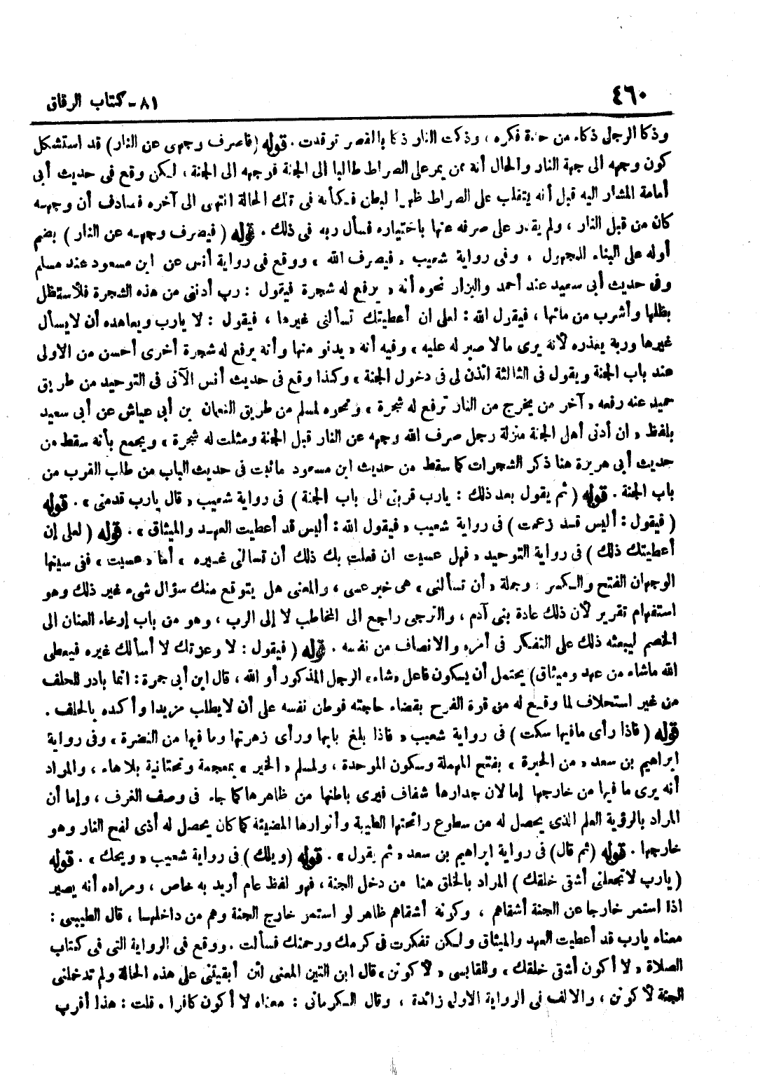 وَذَكَا الرَّجُلُ ذَكَاءً مِنْ حِدَّةِ فِكْرِهِ وَذَكَتِ النَّارُ ذَكًا بِالْقَصْرِ تَوَقَّدَتْ قَوْلُهُ فَاصْرِفْ وَجْهِي عَنِ النَّارِ قَدِ اسْتُشْكِلَ كَوْنُ وَجْهِهِ إِلَى جِهَةِ النَّارِ وَالْحَالُ أَنَّهُ مِمَّنْ يَمُرُّ عَلَى الصِّرَاطِ طَالِبًا إِلَى الْجَنَّةِ فَوَجْهُهُ إِلَى الْجَنَّةِ لَكِنْ وَقَعَ فِي حَدِيثِ أَبِي أُمَامَةَ الْمُشَارِ إِلَيْهِ قبل انه يتقلب عَلَى الصِّرَاطِ ظَهْرًا لِبَطْنٍ فَكَأَنَّهُ فِي تِلْكَ الْحَالَةِ انْتَهَى إِلَى آخِرِهِ فَصَادَفَ أَنَّ وَجْهَهُ كَانَ مِنْ قِبَلِ النَّارِ وَلَمْ يَقْدِرْ عَلَى صَرْفِهِ عَنْهَا بِاخْتِيَارِهِ فَسَأَلَ رَبَّهُ فِي ذَلِكَ قَوْلُهُ فَيُصْرَفُ وَجْهُهُ عَنِ النَّارِ بِضَمِّ أَوَّلِهِ عَلَى الْبِنَاءِ لِلْمَجْهُولِ وَفِي رِوَايَةِ شُعَيْبٍ فَيَصْرِفُ الله وَوَقع فِي رِوَايَة أنس عَن بن مَسْعُودٍ عِنْدَ مُسْلِمٍ وَفِي حَدِيثِ أَبِي سَعِيدٍ عِنْدَ أَحْمَدَ وَالْبَزَّارِ نَحْوَهُ أَنَّهُ يَرْفَعُ لَهُ شَجَرَةً فَيَقُولُ رَبِّ أَدْنِنِي مِنْ هَذِهِ الشَّجَرَةِ فَلِأَسْتَظِلَّ بِظِلِّهَا وَأَشْرَبَ مِنْ مَائِهَا فَيَقُولُ اللَّهُ لَعَلِّي إِنْ أَعْطَيْتُكَ تَسْأَلُنِي غَيْرَهَا فَيَقُولُ لَا يَا رَبِّ وَيُعَاهِدُهُ أَنْ لَا يَسْأَلَ غَيْرَهَا وربه يعذرهُ لِأَنَّهُ يرى مَالا صَبْرَ لَهُ عَلَيْهِ وَفِيهِ أَنَّهُ يَدْنُو مِنْهَا وَأَنَّهُ يُرْفَعُ لَهُ شَجَرَةٌ أُخْرَى أَحْسَنُ مِنَ الْأُولَى عِنْدَ بَابِ الْجَنَّةِ وَيَقُولُ فِي الثَّالِثَةِ ائْذَنْ لِي فِي دُخُولِ الْجَنَّةِ وَكَذَا وَقَعَ فِي حَدِيثِ أَنَسٍ الْآتِي فِي التَّوْحِيدِ مِنْ طَرِيقِ حُمَيْدٍ عَنْهُ رَفَعَهُ آخِرُ مَنْ يَخْرُجُ مِنَ النَّارِ تُرْفَعُ لَهُ شَجَرَةٌ وَنَحْوُهُ لِمُسْلِمٍ مِنْ طَرِيقِ النُّعْمَانِ بْنِ أَبِي عَيَّاشٍ عَنْ أَبِي سَعِيدٍ بِلَفْظِ إِنَّ أَدْنَى أَهْلِ الْجَنَّةِ مَنْزِلَةً رَجُلٌ صَرَفَ اللَّهُ وَجْهَهُ عَنِ النَّارِ قِبَلَ الْجَنَّةِ وَمُثِّلَتْ لَهُ شَجَرَةٌ وَيُجْمَعُ بِأَنَّهُ سَقَطَ مِنْ حَدِيثِ أَبِي هُرَيْرَةَ هُنَا ذِكْرُ الشجرات كَمَا سقط من حَدِيث بن مَسْعُودٍ مَا ثَبَتَ فِي حَدِيثِ الْبَابِ مِنْ طَلَبِ الْقُرْبِ مِنْ بَابِ الْجَنَّةِ قَوْلُهُ ثُمَّ يَقُولُ بَعْدَ ذَلِكَ يَا رَبِّ قَرِّبْنِي إِلَى بَابِ الْجَنَّةِ فِي رِوَايَةِ شُعَيْبٍ قَالَ يَا رَبِّ قَدِّمْنِي قَوْلُهُ فَيَقُولُ أَلَيْسَ قَدْ زَعَمْتَ فِي رِوَايَةِ شُعَيْبٍ فَيَقُولُ اللَّهُ أَلَيْسَ قَدْ أَعْطَيْتَ الْعَهْدَ وَالْمِيثَاقَ قَوْلُهُ لَعَلِّي إِنْ أَعْطَيْتُكَ ذَلِكَ فِي رِوَايَةِ التَّوْحِيدِ فَهَلْ عَسَيْتَ إِنْ فَعَلْتُ بِكَ ذَلِكَ أَنْ تَسْأَلَنِي غَيْرَهُ أَمَّا عَسَيْتُ فَفِي سِينِهَا الْوَجْهَانِ الْفَتْحُ وَالْكَسْرُ وَجُمْلَةُ أَنْ تَسْأَلَنِي هِيَ خَبَرُ عَسَى وَالْمَعْنَى هَلْ يُتَوَقَّعُ مِنْكَ سُؤَالُ شَيْءٍ غَيْرِ ذَلِكَ وَهُوَ اسْتِفْهَامُ تَقْرِيرٍ لِأَنَّ ذَلِكَ عَادَةُ بَنِي آدَمَ وَالتَّرَجِّي رَاجِعٌ إِلَى الْمُخَاطَبِ لَا إِلَى الرَّبِّ وَهُوَ مِنْ بَابِ إِرْخَاءِ الْعَنَانِ إِلَى الْخَصْمِ لِيَبْعَثَهُ ذَلِكَ عَلَى التَّفَكُّرِ فِي أَمْرِهِ وَالْإِنْصَافِ مِنْ نَفْسِهِ قَوْلُهُ فَيَقُولُ لَا وَعِزَّتِكَ لَا أَسْأَلُكَ غَيْرَهُ فَيُعْطِي اللَّهَ مَا شَاءَ مِنْ عَهْدٍ وَمِيثَاقٍ يَحْتَمِلُ أَنْ يَكُونَ فَاعِلُ شَاءَ الرجل الْمَذْكُور أَو الله قَالَ بن أَبِي جَمْرَةَ إِنَّمَا بَادَرَ لِلْحَلِفِ مِنْ غَيْرِ اسْتِخْلَاف لِمَا وَقَعَ لَهُ مِنْ قُوَّةِ الْفَرَحِ بِقَضَاءِ حَاجَتِهِ فَوَطَّنَ نَفْسَهُ عَلَى أَنْ لَا يَطْلُبَ مَزِيدًا وَأَكَّدَهُ بِالْحَلِفِ قَوْلُهُ فَإِذَا رَأَى مَا فِيهَا سَكَتَ فِي 