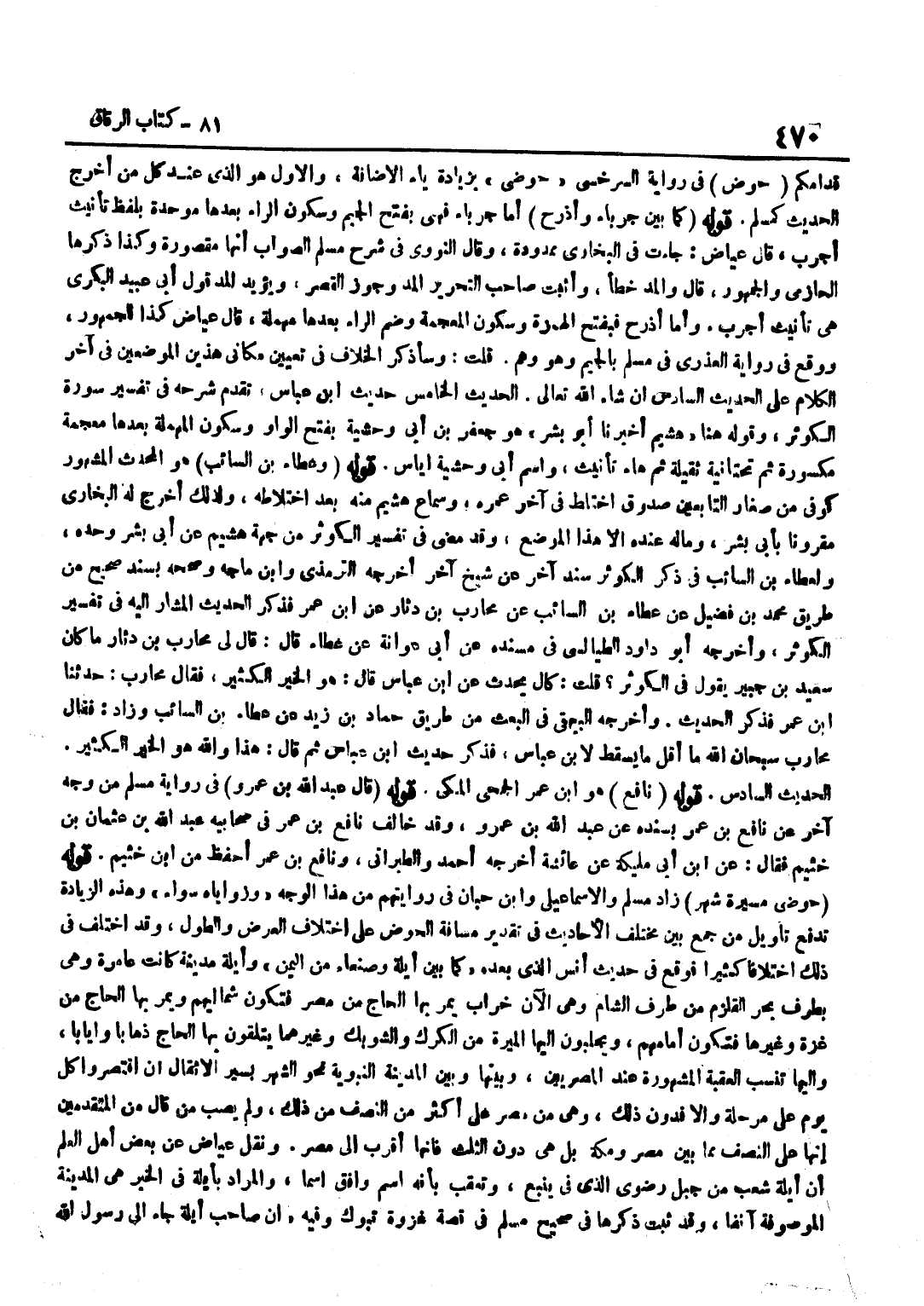 قُدَّامَكُمْ حَوْض فِي رِوَايَةِ السَّرَخْسِيِّ حَوْضِي بِزِيَادَةِ يَاءِ الْإِضَافَةِ وَالْأَوَّلُ هُوَ الَّذِي عِنْدَ كُلِّ مَنْ أَخْرَجَ الْحَدِيثَ كَمُسْلِمٍ قَوْلُهُ كَمَا بَيْنَ جَرْبَاءَ وَأَذْرُحَ أَمَّا جَرْبَاءُ فَهِيَ بِفَتْحِ الْجِيمِ وَسُكُونِ الرَّاءِ بَعْدَهَا مُوَحَّدَةٌ بِلَفْظِ تَأْنِيثِ أَجْرَبَ قَالَ عِيَاضٌ جَاءَتْ فِي الْبُخَارِيِّ مَمْدُودَةً وَقَالَ النَّوَوِيُّ فِي شَرْحِ مُسْلِمٍ الصَّوَابُ أَنَّهَا مَقْصُورَةٌ وَكَذَا ذَكَرَهَا الْحَازِمِيُّ وَالْجُمْهُورُ قَالَ وَالْمَدُّ خَطَأٌ وَأَثْبَتَ صَاحِبُ التَّحْرِيرِ الْمَدَّ وَجَوَّزَ الْقَصْرَ وَيُؤَيِّدُ الْمَدَّ قَوْلُ أَبِي عُبَيْدٍ الْبَكْرِيِّ هِيَ تَأْنِيثُ أَجْرَبَ وَأَمَّا أَذْرُحُ فَبِفَتْحِ الْهَمْزَةِ وَسُكُونِ الْمُعْجَمَةِ وَضَمِّ الرَّاءِ بَعْدَهَا مُهْمَلَةٌ قَالَ عِيَاضٌ كَذَا لِلْجُمْهُورِ وَوَقَعَ فِي رِوَايَةِ الْعُذْرِيِّ فِي مُسْلِمٍ بِالْجِيمِ وَهُوَ وَهَمٌ قُلْتُ وَسَأَذْكُرُ الْخِلَافَ فِي تَعْيِينِ مَكَانَيْ هَذَيْنِ الْمَوْضِعَيْنِ فِي آخِرِ الْكَلَامِ على الحَدِيث السَّادِس إِنْ شَاءَ اللَّهُ تَعَالَى الْحَدِيثُ الْخَامِسُ حَدِيثُ بن عَبَّاسٍ تَقَدَّمَ شَرْحُهُ فِي تَفْسِيرِ سُورَةِ الْكَوْثَرِ وَقَوْلُهُ