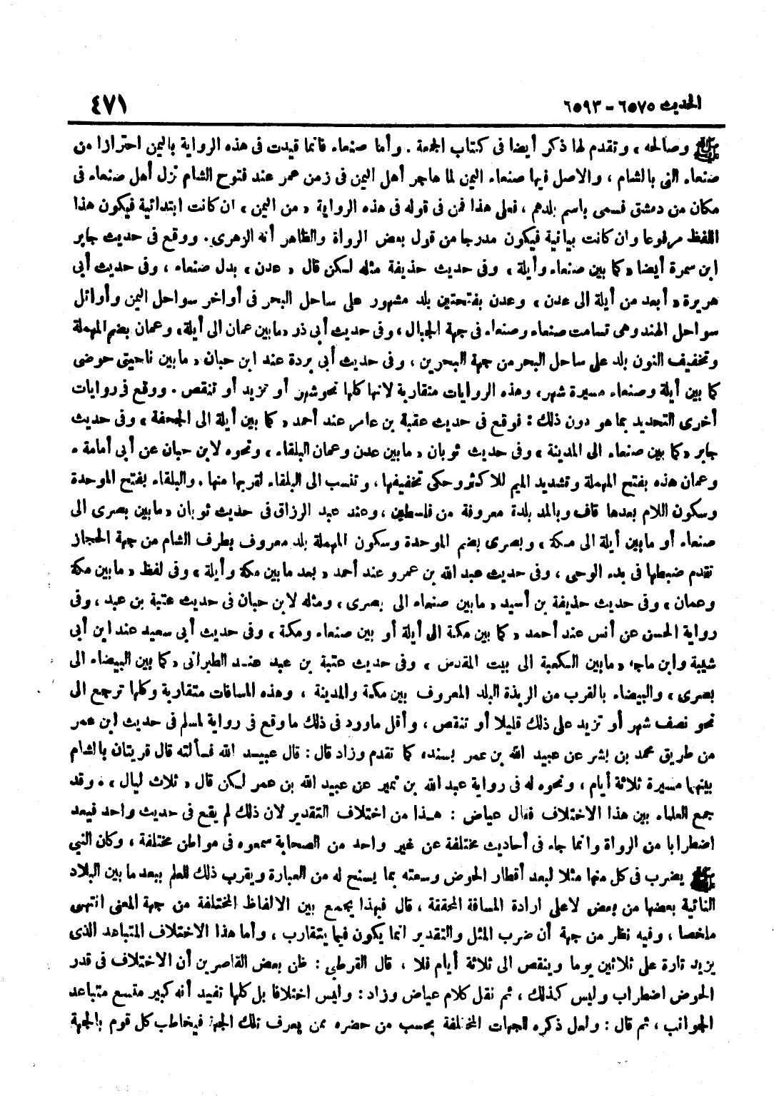 صَلَّى اللَّهُ عَلَيْهِ وَسَلَّمَ وَصَالَحَهُ وَتَقَدَّمَ لَهَا ذِكْرٌ أَيْضًا فِي كِتَابِ الْجُمُعَةِ وَأَمَّا صَنْعَاءُ فَإِنَّمَا قُيِّدَتْ فِي هَذِهِ الرِّوَايَةِ بِالْيَمَنِ احْتِرَازًا مِنْ صَنْعَاءَ الَّتِي بِالشَّامِ وَالْأَصْلُ فِيهَا صَنْعَاءُ الْيَمَنِ لَمَّا هَاجَرَ أَهْلُ الْيَمَنِ فِي زَمَنِ عُمَرَ عِنْدَ فُتُوحِ الشَّامِ نَزَلَ أَهْلُ صَنْعَاءَ فِي مَكَانٍ مِنْ دِمَشْقَ فَسُمِّيَ بِاسْمِ بَلَدِهِمْ فَعَلَى هَذَا فَمِنْ فِي قَوْلِهِ فِي هَذِهِ الرِّوَايَةِ مِنَ الْيَمَنِ إِنْ كَانَتِ ابْتِدَائِيَّةً فَيَكُونُ هَذَا اللَّفْظُ مَرْفُوعًا وَإِنْ كَانَتْ بَيَانِيَّةً فَيَكُونُ مُدْرَجًا مِنْ قَوْلِ بَعْضِ الرُّوَاةِ وَالظَّاهِرُ أَنَّهُ الزُّهْرِيُّ وَوَقَعَ فِي حَدِيثِ جَابِرِ بْنِ سَمُرَةَ أَيْضًا كَمَا بَيْنَ صَنْعَاءَ وَأَيْلَةَ وَفِي حَدِيثِ حُذَيْفَةَ مِثْلُهُ لَكِنْ قَالَ عَدَنَ بَدَلَ صَنْعَاءَ وَفِي حَدِيثِ أَبِي هُرَيْرَةَ أَبْعَدَ مِنْ أَيْلَةَ إِلَى عَدَنَ وَعَدَنُ بِفَتْحَتَيْنِ بَلَدٌ مَشْهُورٌ عَلَى سَاحِلِ الْبَحْرِ فِي أَوَاخِرِ سَوَاحِلِ الْيَمَنِ وَأَوَائِلِ سَوَاحِلِ الْهِنْدِ وَهِيَ تُسَامِتُ صَنْعَاءَ وَصَنْعَاءُ فِي جِهَةِ الْجِبَالِ وَفِي حَدِيثِ أَبِي ذَرٍّ مَا بَيْنَ عُمَانَ إِلَى أَيْلَةَ وَعُمَانُ بِضَمِّ الْمُهْمَلَةِ وَتَخْفِيفِ النُّونِ بَلَدٌ عَلَى سَاحِلِ الْبَحْرِ مِنْ جِهَةِ الْبَحْرَيْنِ وَفِي حَدِيثِ أَبِي بُرْدَةَ عِنْدَ بن حِبَّانَ مَا بَيْنَ نَاحِيَتَيْ حَوْضِي كَمَا بَيْنَ أَيْلَةَ وَصَنْعَاءَ مَسِيرَةَ شَهْرٍ وَهَذِهِ الرِّوَايَاتُ مُتَقَارِبَةٌ لِأَنَّهَا كُلُّهَا نَحْوَ شَهْرٍ أَوْ تَزِيدُ أَوْ تَنْقُصُ وَوَقَعَ فِي رِوَايَاتٍ أُخْرَى التَّحْدِيدُ بِمَا هُوَ دُونَ ذَلِكَ فَوَقَعَ فِي حَدِيثِ عُقْبَةَ بْنِ عَامِرٍ عِنْدَ أَحْمَدَ كَمَا بَيْنَ أَيْلَةَ إِلَى الْجُحْفَةِ وَفِي حَدِيثِ جَابِرٍ كَمَا بَيْنَ صَنْعَاءَ إِلَى الْمَدِينَةِ وَفِي حَدِيثِ ثَوْبَانَ مَا بَيْنَ عَدَنَ وَعَمَّانَ الْبَلْقَاءَ وَنَحْوُهُ لِابْنِ حِبَّانَ عَنْ أَبِي أُمَامَةَ وَعَمَّانُ هَذِهِ بِفَتْحِ الْمُهْمَلَةِ وَتَشْدِيدِ الْمِيمِ لِلْأَكْثَرِ وَحُكِيَ تَخْفِيفُهَا وَتُنْسَبُ إِلَى الْبَلْقَاءِ لِقُرْبِهَا مِنْهَا وَالْبَلْقَاءُ بِفَتْحِ الْمُوَحَّدَةِ وَسُكُونِ اللَّامِ بَعْدَهَا قَافٌ وَبِالْمَدِّ بَلْدَةٌ مَعْرُوفَةٌ مِنْ فِلَسْطِينَ وَعِنْدَ عَبْدِ الرَّزَّاقِ فِي حَدِيثِ ثَوْبَانَ مَا بَيْنَ بُصْرَى إِلَى صَنْعَاءَ أَوْ مَا بَيْنَ أَيْلَةَ إِلَى مَكَّةَ وَبُصْرَى بِضَمِّ الْمُوَحَّدَةِ وَسُكُونِ الْمُهْمَلَةِ بَلَدٌ مَعْرُوفٌ بِطَرَفِ الشَّامِ مِنْ جِهَةِ الْحِجَازِ تَقَدَّمَ ضَبْطُهَا فِي بَدْءِ الْوَحْيِ وَفِي حَدِيثِ عَبْدِ اللَّهِ بْنِ عَمْرٍو عِنْدَ أَحْمَدَ بُعْدَ مَا بَيْنَ مَكَّةَ وَأَيْلَةَ وَفِي لَفْظٍ مَا بَيْنَ مَكَّةَ وَعَمَّانَ وَفِي حَدِيثِ حُذَيْفَةَ بْنِ أَسِيدٍ مَا بَيْنَ صَنْعَاءَ إِلَى بُصْرَى وَمِثْلُهُ لِابْنِ حِبَّانَ فِي حَدِيثِ عُتْبَةَ بْنِ عَبْدٍ وَفِي رِوَايَةِ الْحَسَنِ عَنْ أَنَسٍ عِنْدَ أَحْمَدَ كَمَا بَيْنَ مَكَّةَ إِلَى أَيْلَةَ أَوْ بَيْنَ صَنْعَاءَ وَمَكَّةَ وَفِي حَدِيثِ أَبِي سعيد عِنْد بن أبي شيبَة وبن مَاجَهْ مَا بَيْنَ الْكَعْبَةِ إِلَى بَيْتِ الْمَقْدِسِ وَفِي حَدِيثِ عُتْبَةَ بْنِ عَبْدٍ عِنْدَ الطَّبَرَانِيِّ كَمَا بَيْنَ الْبَيْضَاءِ إِلَى بُصْرَى وَالْبَيْضَاءُ بِالْقُرْبِ مِنَ الرَّبَذَةِ الْبَلَدِ الْمَعْرُوفِ بَيْنَ مَكَّةَ وَالْمَدِينَةِ وَهَذِهِ الْمَسَافَاتُ مُتَقَارِبَةٌ وَكُلُّهَا تَرْجِعُ إِلَى نَحْوِ نِصْفِ شَهْرٍ أَوْ تَزِيدُ عَلَى ذَلِكَ قَلِيلًا 