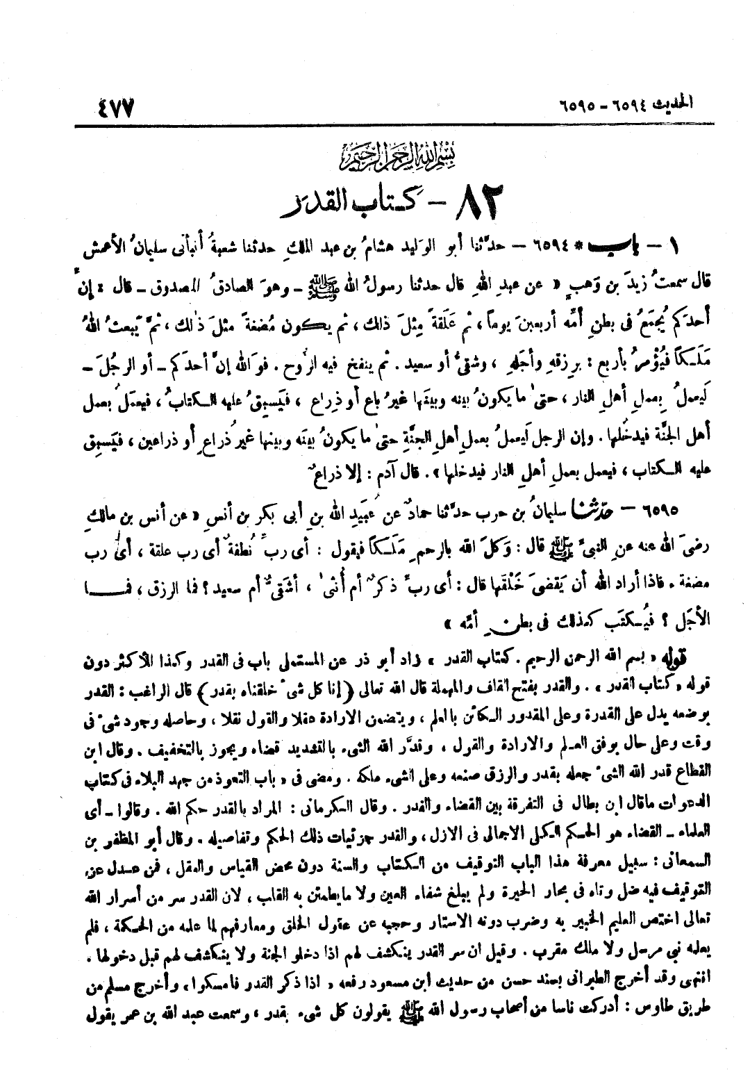 زَادَ أَبُو ذَرٍّ عَنِ الْمُسْتَمْلِي بَابٌ فِي الْقَدَرِ وَكَذَا لِلْأَكْثَرِ دُونَ قَوْلِهِ كِتَابُ الْقَدَرِ وَالْقَدَرُ بِفَتْحِ الْقَافِ وَالْمُهْمَلَةِ قَالَ اللَّهُ تَعَالَى انا كل شَيْء خلقناه بِقدر قَالَ الرَّاغِبُ الْقَدَرُ بِوَضْعِهِ يَدُلُّ عَلَى الْقُدْرَةِ وَعَلَى الْمَقْدُورِ الْكَائِنِ بِالْعِلْمِ وَيَتَضَمَّنُ الْإِرَادَةَ عَقْلًا وَالْقَوْلَ نَقْلًا وَحَاصِلُهُ وُجُودُ شَيْءٍ فِي وَقْتٍ وَعَلَى حَالٍ بِوَفْقِ الْعِلْمِ وَالْإِرَادَةِ وَالْقَوْلِ وَقَدَّرَ اللَّهُ الشَّيْءَ بِالتَّشْدِيدِ قَضَاهُ وَيَجُوزُ بِالتَّخْفِيفِ وَقَالَ بن الْقَطَّاعِ قَدَّرَ اللَّهُ الشَّيْءَ جَعَلَهُ بِقَدَرٍ وَالرِّزْقَ صَنَعَهُ وَعَلَى الشَّيْءِ مَلَكَهُ وَمَضَى فِي بَابُ التَّعَوُّذِ مِنْ جَهْدِ الْبَلَاءِ فِي كِتَابِ الدَّعَوَاتِ مَا قَالَ بن بَطَّالٍ فِي التَّفْرِقَةِ بَيْنَ الْقَضَاءِ وَالْقَدَرِ وَقَالَ الْكَرْمَانِيُّ الْمُرَادُ بِالْقَدَرِ حُكْمُ اللَّهِ وَقَالُوا أَيِ الْعُلَمَاءُ الْقَضَاءُ هُوَ الْحُكْمُ الْكُلِّيُّ الْإِجْمَالِيُّ فِي الْأَزَلِ وَالْقَدَرُ جُزْئِيَّاتُ ذَلِكَ الْحُكْمِ وَتَفَاصِيلُهُ وَقَالَ أَبُو الْمُظَفَّرِ بْنُ السَّمْعَانِيِّ سَبِيلُ مَعْرِفَةِ هَذَا الْبَابِ التَّوْقِيفُ مِنَ الْكِتَابِ وَالسُّنَّةِ دُونَ مَحْضِ الْقِيَاسِ وَالْعَقْلِ فَمَنْ عَدَلَ عَنِ التَّوْقِيفِ فِيهِ ضَلَّ وَتَاهَ فِي بِحَارِ الْحِيرَةِ وَلَمْ يَبْلُغْ شِفَاءَ الْعَيْنِ وَلَا مَا يَطْمَئِنُّ بِهِ الْقَلْبُ لِأَنَّ الْقَدَرَ سِرٌّ مِنْ أَسْرَارِ اللَّهِ تَعَالَى اخْتُصَّ الْعَلِيمُ الْخَبِيرُ بِهِ وَضَرَبَ دُونَهُ الْأَسْتَارَ وَحَجَبَهُ عَنْ عُقُولِ الْخَلْقِ وَمَعَارِفِهِمْ لِمَا عَلِمَهُ مِنَ الْحِكْمَةِ فَلَمْ يَعْلَمْهُ نَبِيٌّ مُرْسَلٌ وَلَا مَلَكٌ مُقَرَّبٌ وَقِيلَ إِنَّ سِرَّ الْقَدَرِ يَنْكَشِفُ لَهُمْ إِذَا دَخَلُوا الْجَنَّةَ وَلَا يَنْكَشِفُ لَهُمْ قَبْلَ دُخُولِهَا انْتَهَى وَقَدْ أَخْرَجَ الطَّبَرَانِيُّ بِسَنَدٍ حسن من حَدِيث بن مَسْعُودٍ رَفَعَهُ إِذَا ذُكِرَ الْقَدَرُ فَأَمْسِكُوا وَأَخْرَجَ مُسلم من طَرِيق طَاوُوس أَدْرَكْتُ نَاسًا مِنْ أَصْحَابِ رَسُولِ اللَّهِ صَلَّى اللَّهُ عَلَيْهِ وَسَلَّمَ يَقُولُونَ كُلُّ شَيْءٍ بِقَدَرٍ وَسَمِعْتُ عَبْدَ اللَّهِ بْنَ عُمَرَ يَقُولُ